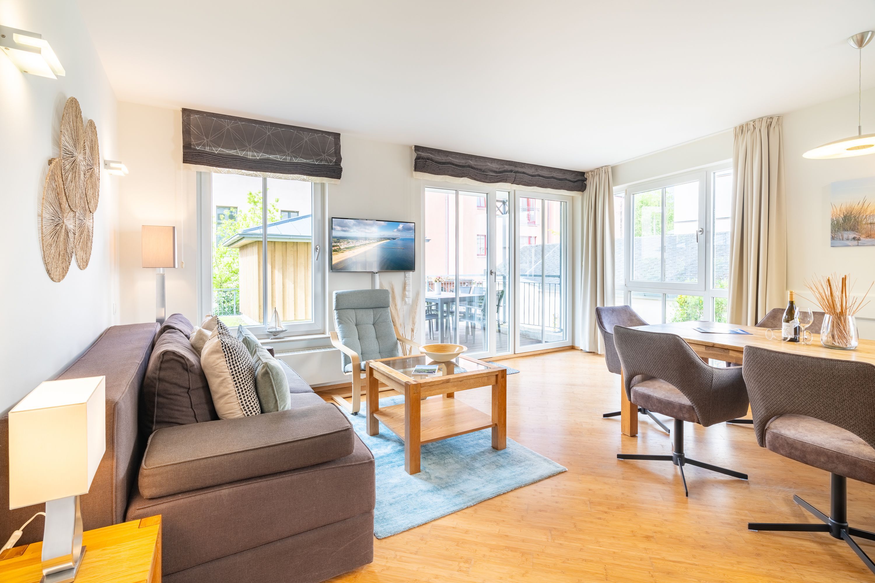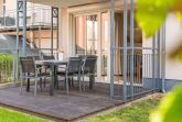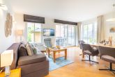 Der offene Wohn- und Kochbereich ist modern und gleichzeitig gemütlich eingerichtet. Die Polstersitzecke lädt zum Relaxen dank Flat-TV und Blu-ray-Player ein, ist aber auch ein idealer Ort für gesellige Spielabende. Im Handumdrehen können Sie die hochwertige Boxspringcouch zum Schlafplatz für zwei Gäste umwandeln. Vom Wohnbereich gelangen Sie auf Ihre private Terrasse mit Südwestausrichtung: dank des kleinen Gartenanteils empfiehlt sich dieses Appartement ideal für Familien. Auf der Terrasse können Sie sich dem Sonnenbaden hingeben oder den Abend bei einem Gläschen Wein ausklingen lassen.