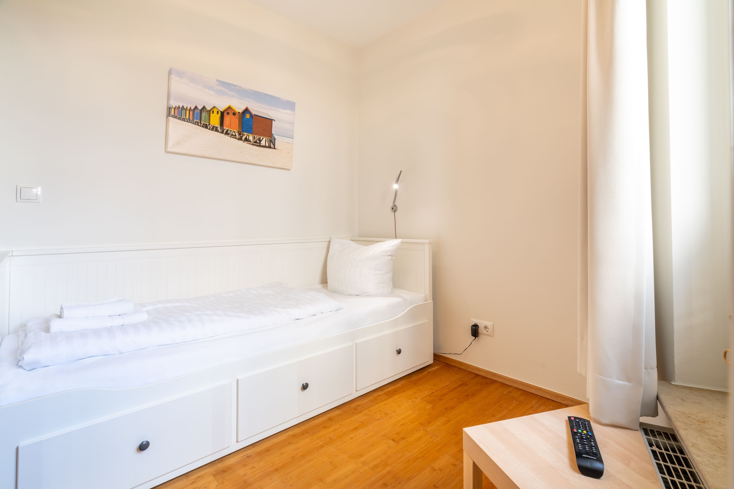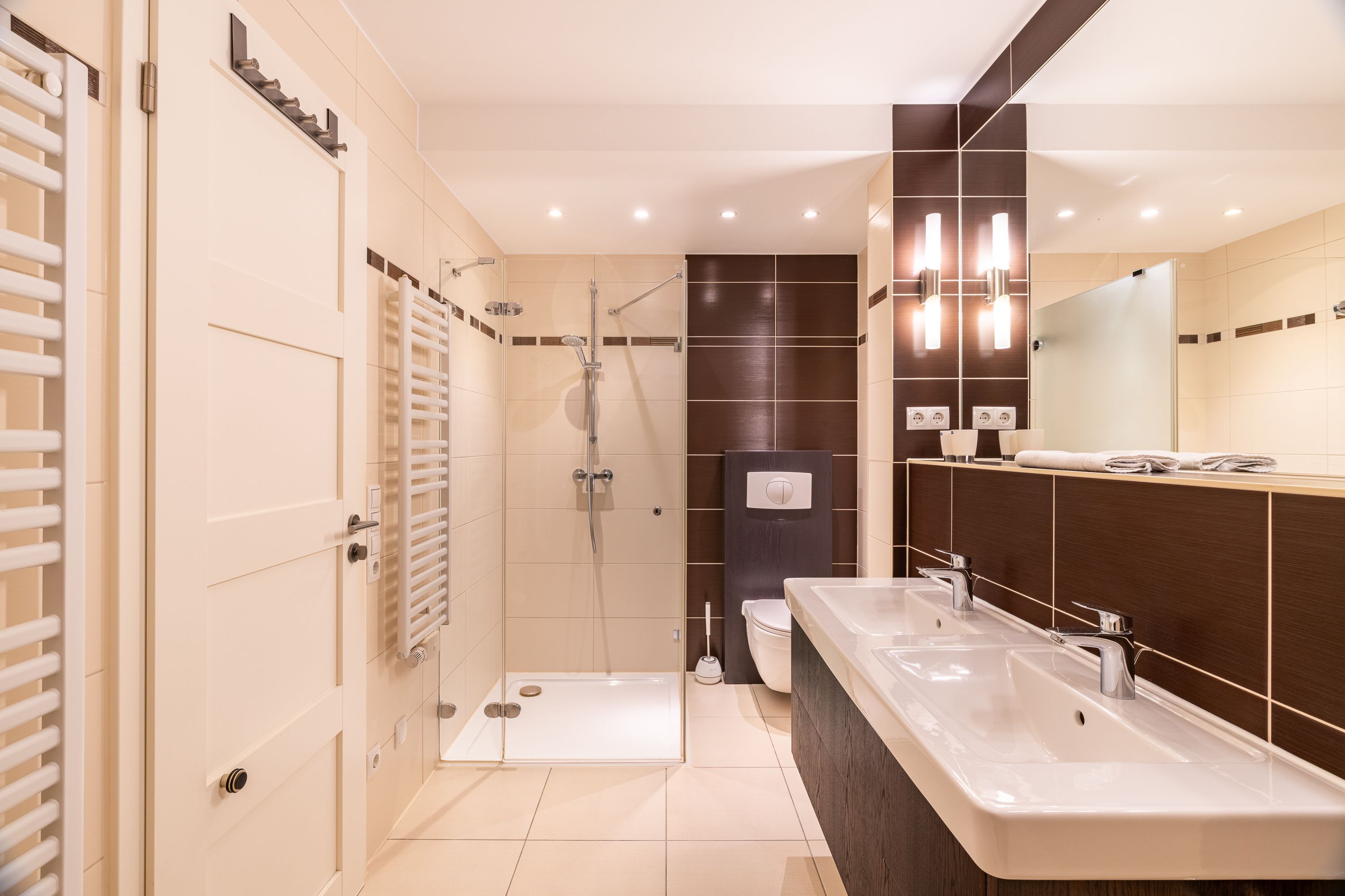 Damit Sie Ihre wohlverdiente Urlaubszeit bereits am Anreisetag in vollen Zügen genießen können, haben wir das Bett für Sie und das für Ihre lieben Mitreisenden bereits bezogen und ein Duschtuch sowie ein kleines Handtuch bereitgelegt. Das Appartement besitzt ein luxuriöses und großzügiges Badezimmer mit WC und einem Haartrockner - nach Belieben können Sie sich in der Echtglas-Dusche erfrischen oder in der Badewanne entspannen.