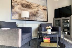 Strandnähe und eine Wohn- und Schlafgelegenheit auf kleinstem Raum, aber ohne Kompromisse. Der kleine Wohnbereich überzeugt mit gemütlicher Sitzgelegenheit, Flat TV sowie einer integrierten Pantryküche (Kühlschrank, Kochfeld mit 2 Platten, Wasserkocher, Toaster, Kaffeemaschine). Zur Nachtruhe oder für ein Schlummerstündchen zwischendurch ziehen Sie sich in das angrenzende Schlafzimmer mit Doppelbett (180 x 200cm / zwei getrennte Matratzen) und Kleiderschrank zum Verstauen Ihrer Habseligkeiten zurück. Im Schlafzimmer ist die Aufbettung mit einem Kleinkind bis 3 Jahre in einem Babyreisebett möglich. Das Babyreisebett können Sie gegen Gebühr hinzubuchen.