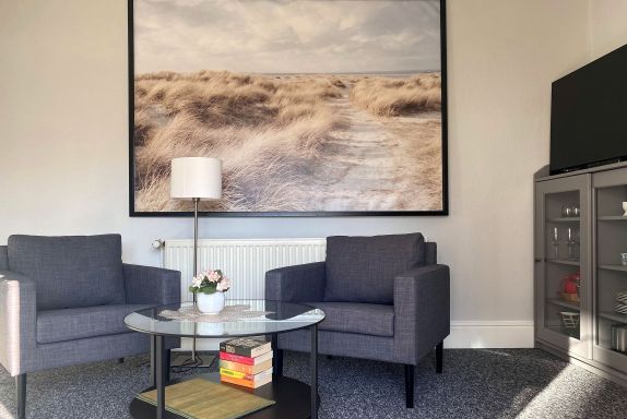Der Wohnbereich empfängt Sie mit einer gemütlichen Sitzgelegenheit, einem Flat-TV sowie einer integrierten Pantryküche, die mit Kühlschrank, einem Zwei-Platten-Kochfeld, Wasserkocher, Toaster und Kaffeemaschine ausgestattet ist und somit alles bereithält, was Sie für eine entspannte Selbstversorgung benötigen.