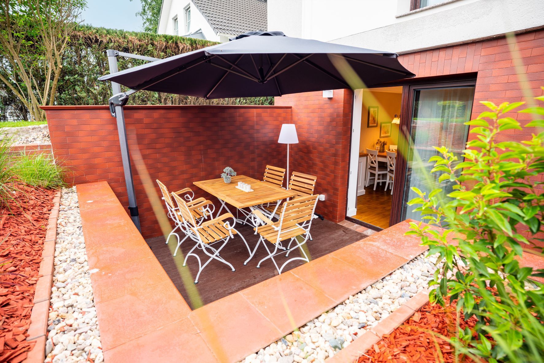Über einen separaten Eingang gelangen Sie über den Flur in das Wohnzimmer mit gemütlicher Sitzgelegenheit, Flat-TV sowie einer integrierten Küchenzeile (Backofen, Ceranfeld, Mikrowelle, Kühlschrank mit Gefrierfach, Geschirrspülmaschine, Kochfeld, Wasserkocher, Toaster, Kaffeemaschine). Die sich an den Wohnbereich anschließende Sonnenterrasse lädt zum Entspannen beim Blick ins Grüne ein.