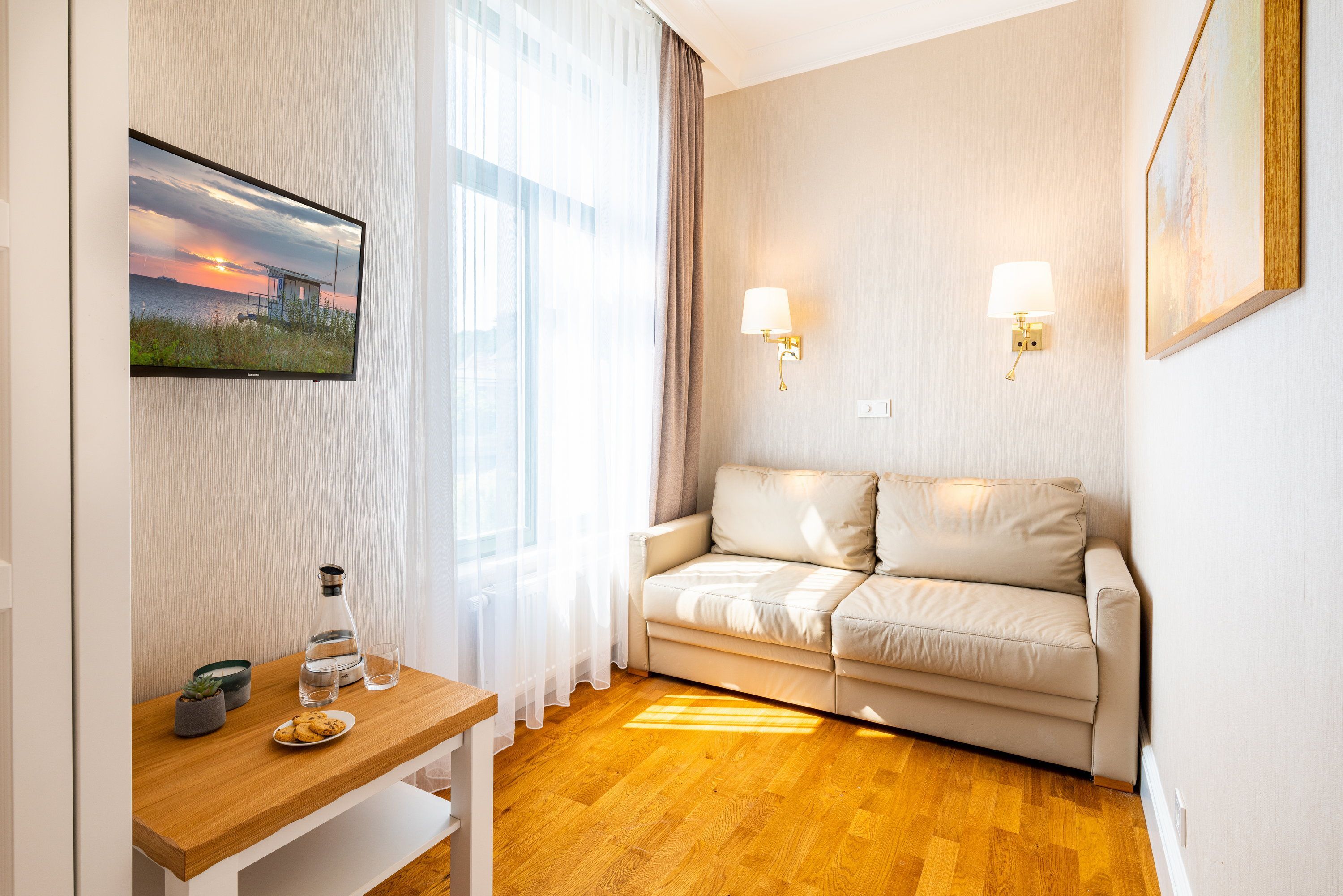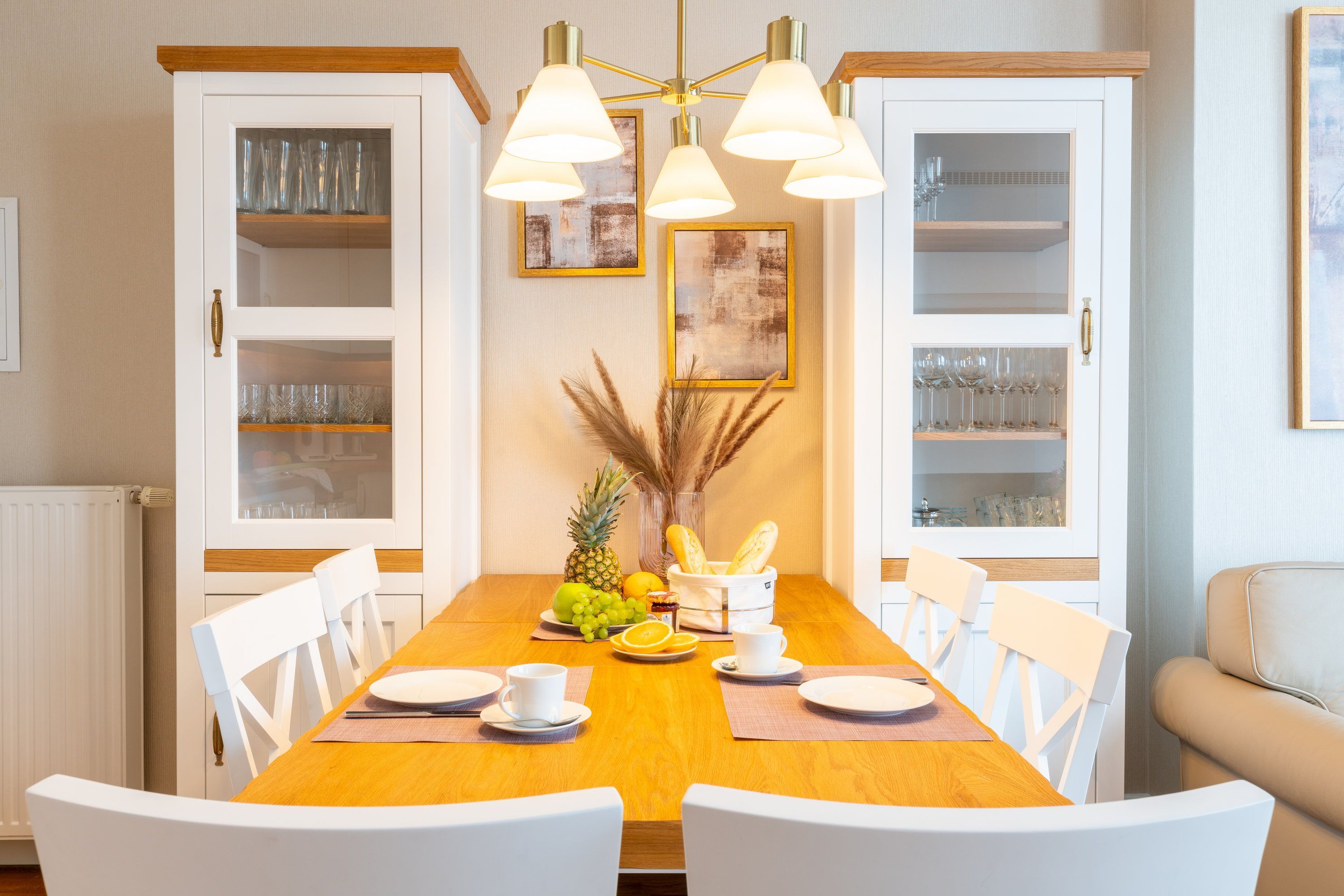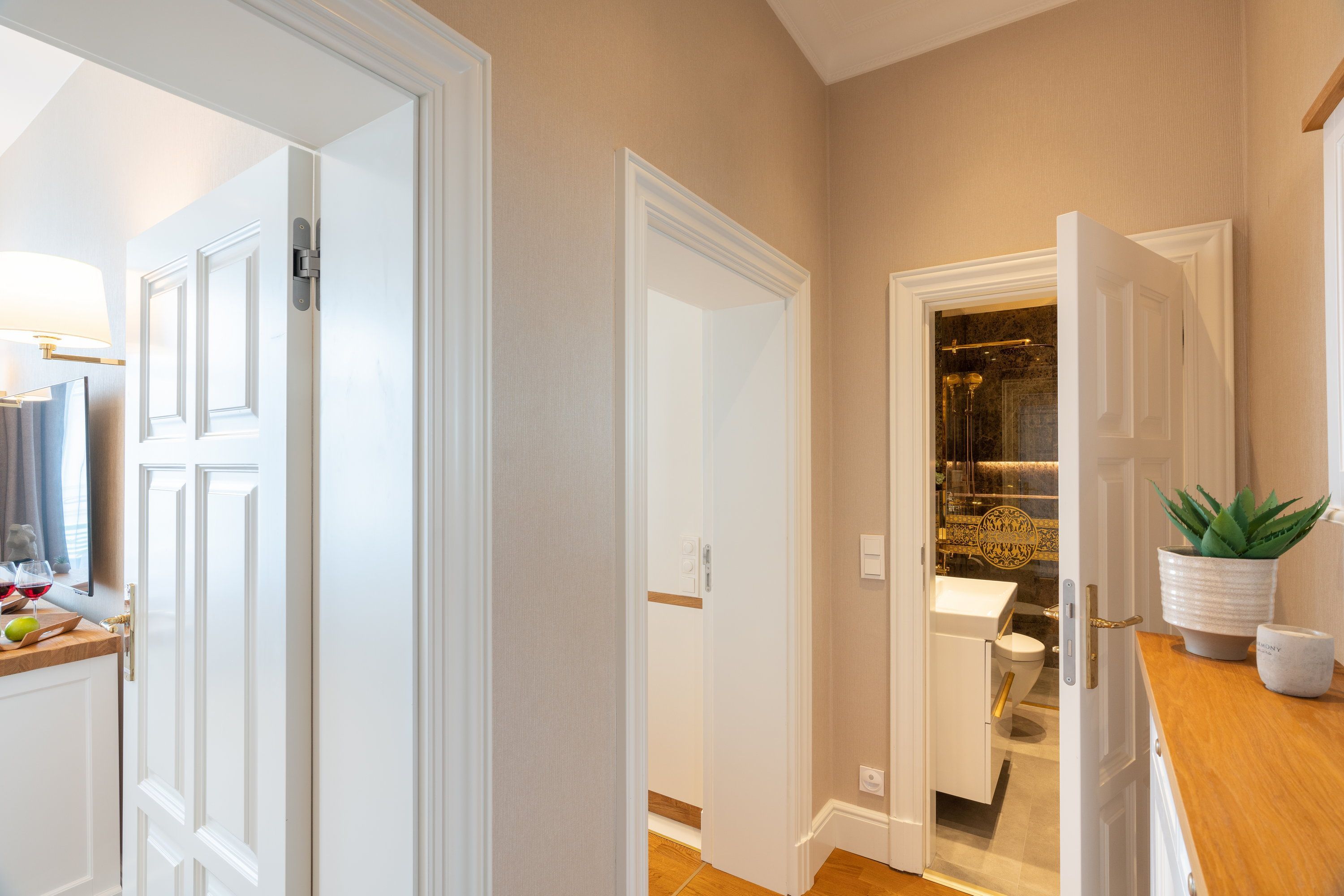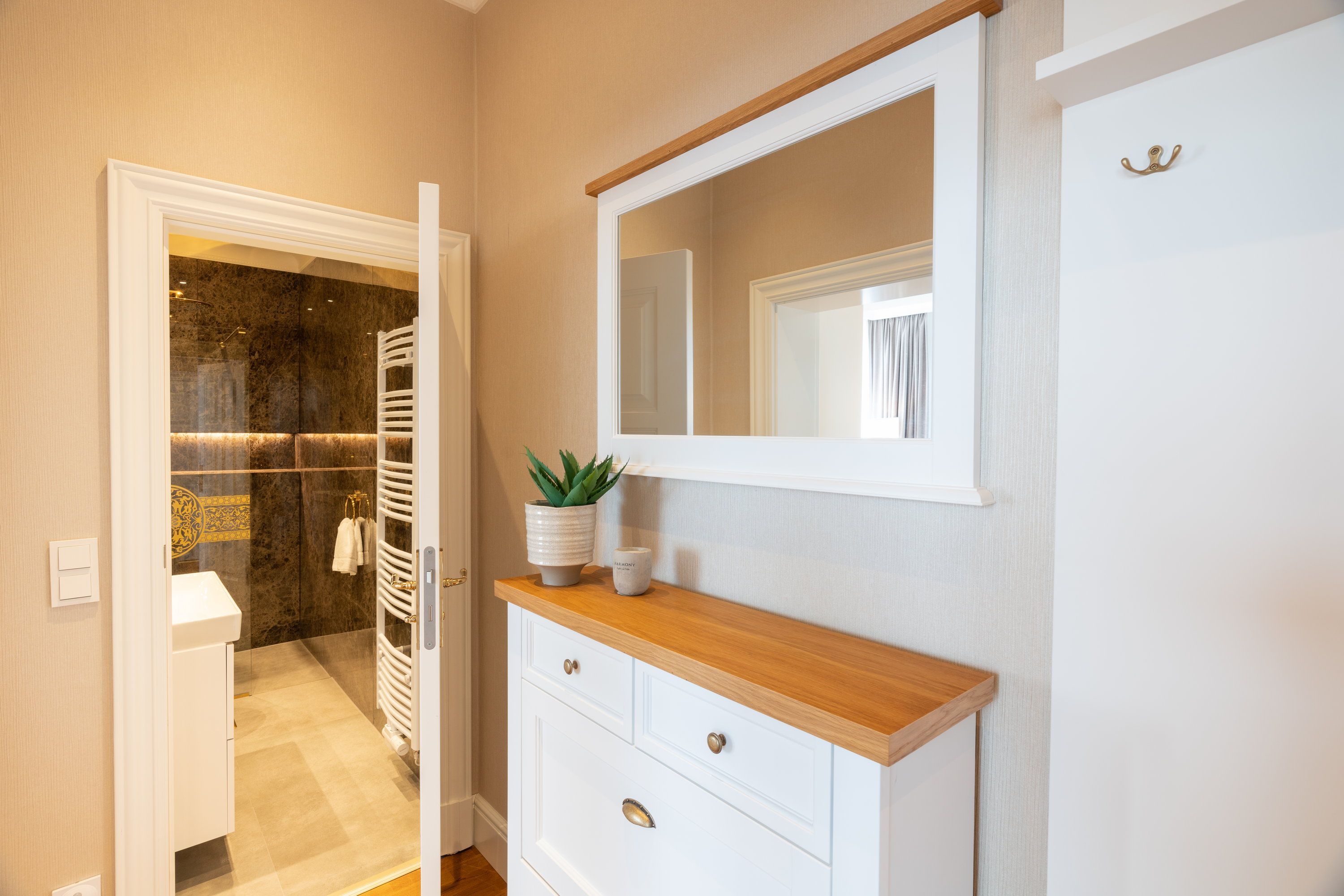 Die vollausgestattete Küche, welche speziell von einem einheimischen Tischler angefertigt wurde, ergänzt die Annehmlichkeiten dieses neuen Appartements mit allen Raffinessen: Backofen, Mikrowelle, Kühlschrank mit Gefrierfach, Toaster, Wasserkocher, Kaffeemaschine sowie einem Essplatz für 6 Personen mit Blick in den gegenüberliegenden Park. Lauschen Sie dem Klang der Ostsee bereits von Ihrem Balkon, welcher vom Wohnzimmer und einem der Schlafzimmer begehbar ist. Echtholzparkett im Wohn- und Schlafraum, unkaputtbare Tapeten aus Amerika. Bei der Umgestaltung wurde nichts dem Zufall überlassen.