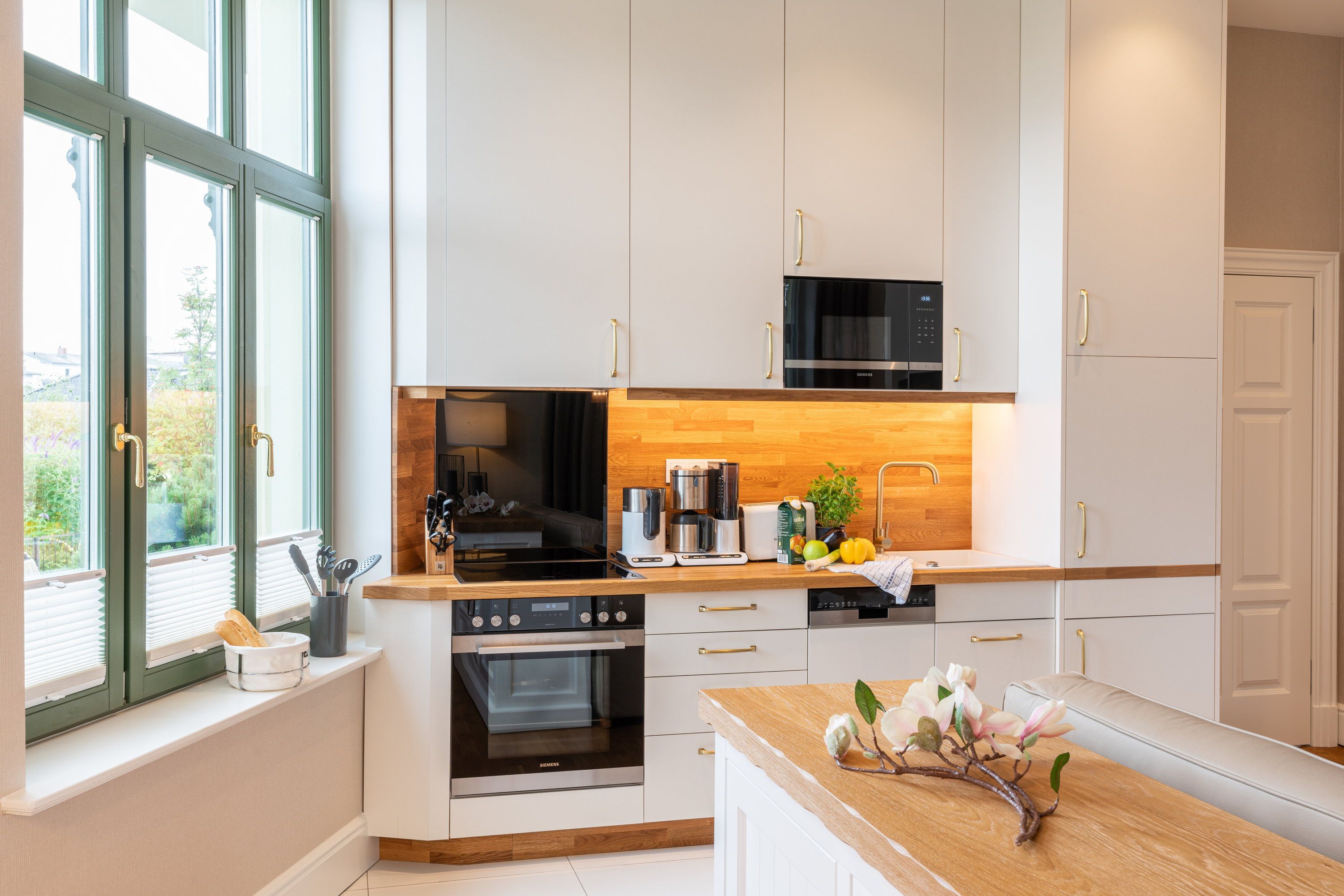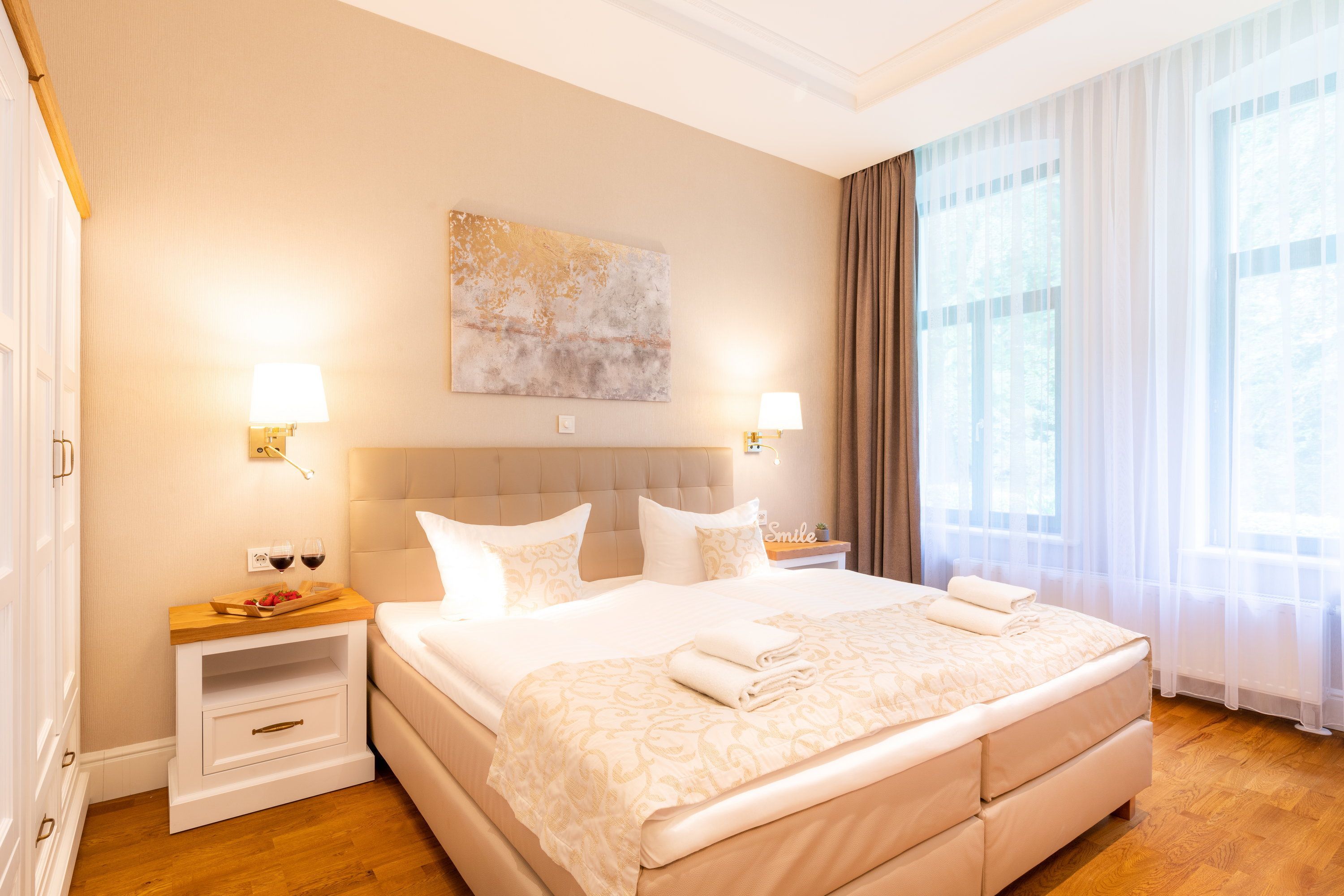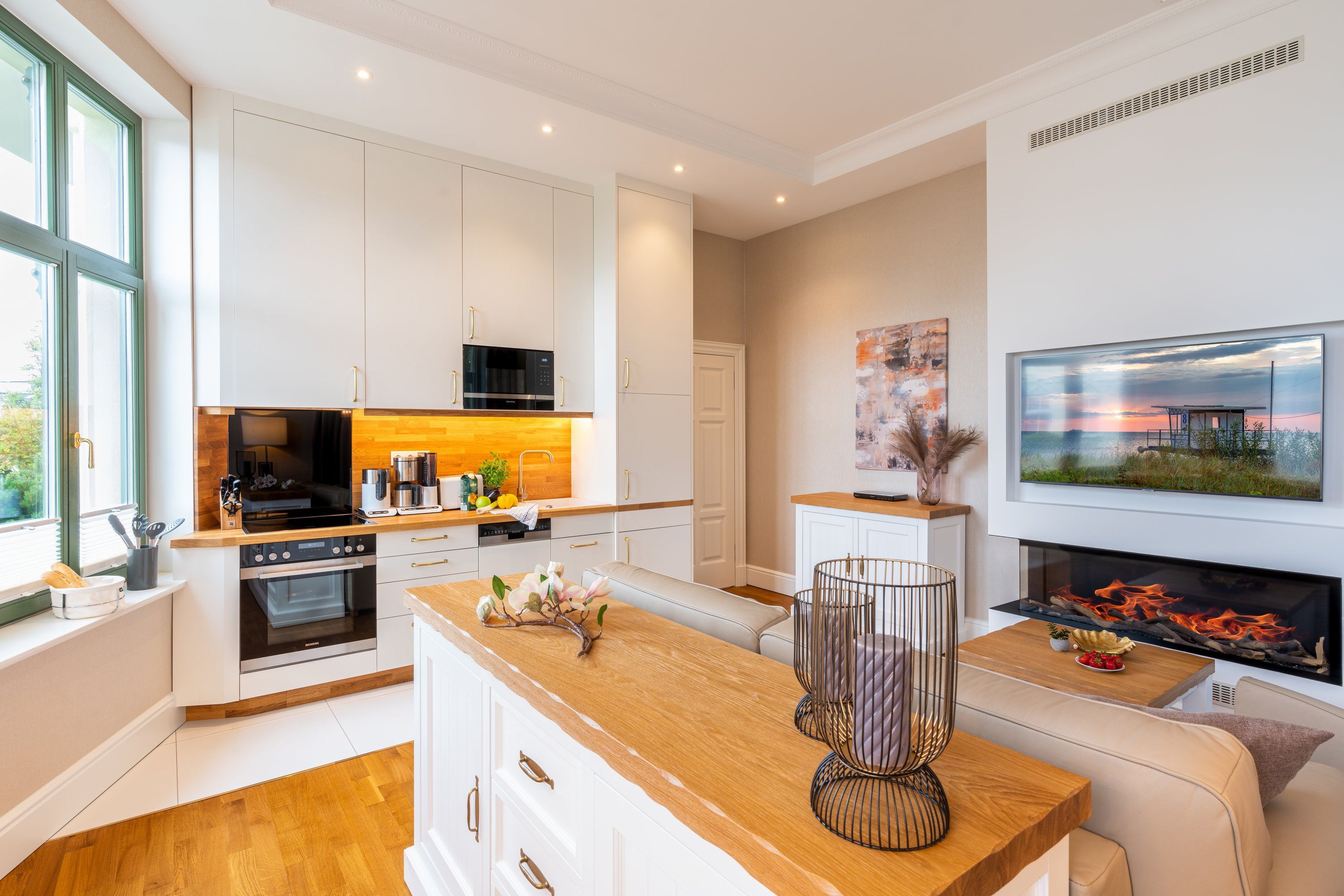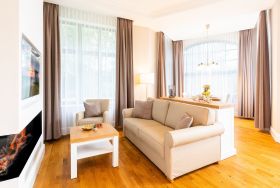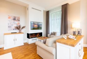 Ein ein großzügiger Wohnbereich mit einem exklusiven Gaskamin erwartet Sie bereits, sodass Sie eine angenehme Wohlfühlatmosphäre das gesamte Jahr über genießen. Eine bequeme Couchgarnitur und ein Flat TV runden den Komfort perfekt ab und laden zum Entspannen und Füße hochlegen ein. Das helle Zwei-Zimmer-Appartement hat eine Größe von 60 Quadratmetern und liegt im Hochparterre der Villa Waldschloss. Die vollausgestattete Küche, welche speziell von einem einheimischen Tischler angefertigt wurde, ergänzt die Annehmlichkeiten dieses neuen Appartements mit allen Raffinessen: Backofen, Mikrowelle, Kühlschrank mit Gefrierfach, Toaster, Wasserkocher, Kaffeemaschine sowie einem Essplatz für 4 Personen mit Blick in den gegenüberliegenden Park. Echtholzparkett im Wohn- und Schlafraum, unkaputtbare Tapeten aus Amerika. Bei der Umgestaltung wurde nichts dem Zufall überlassen.