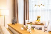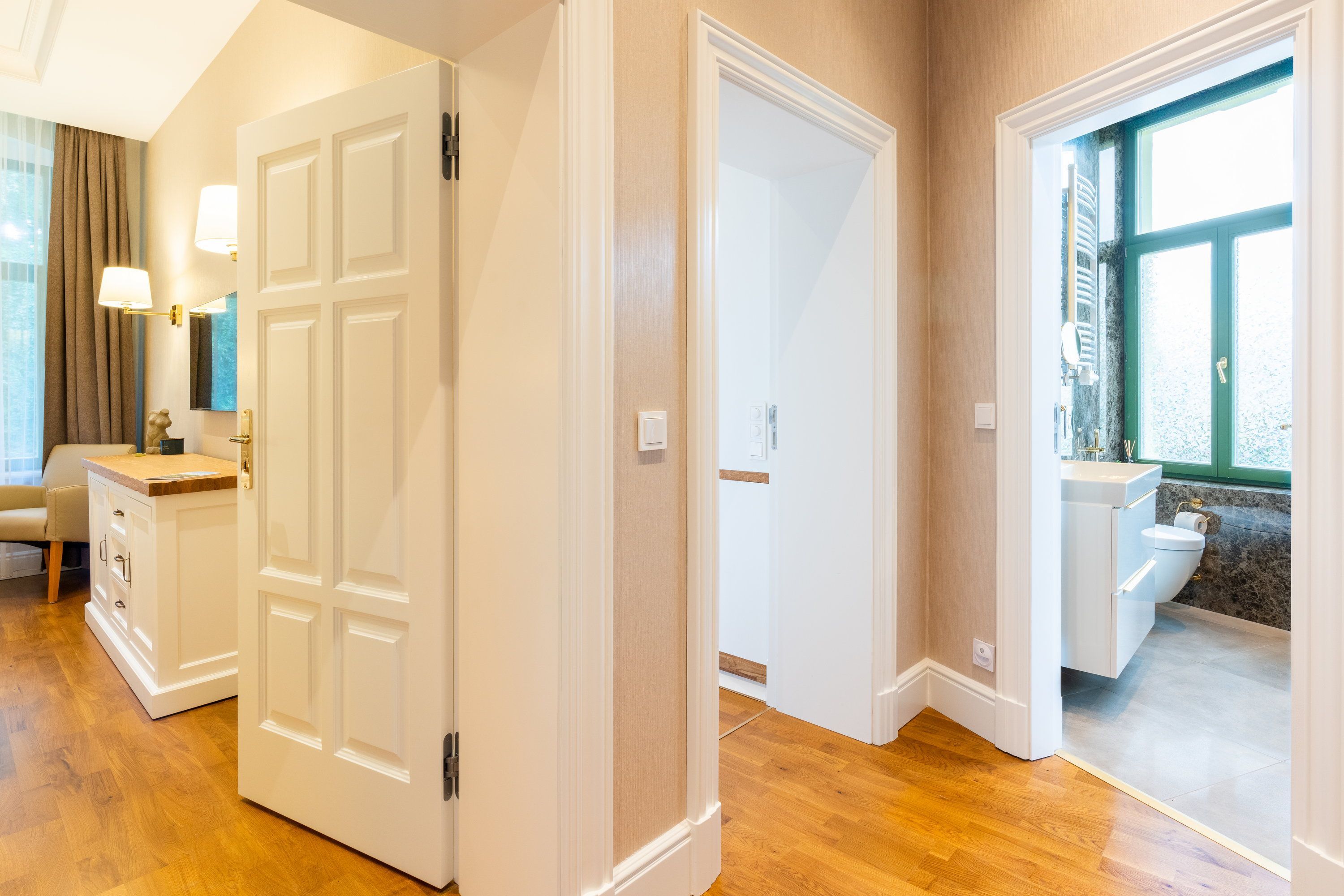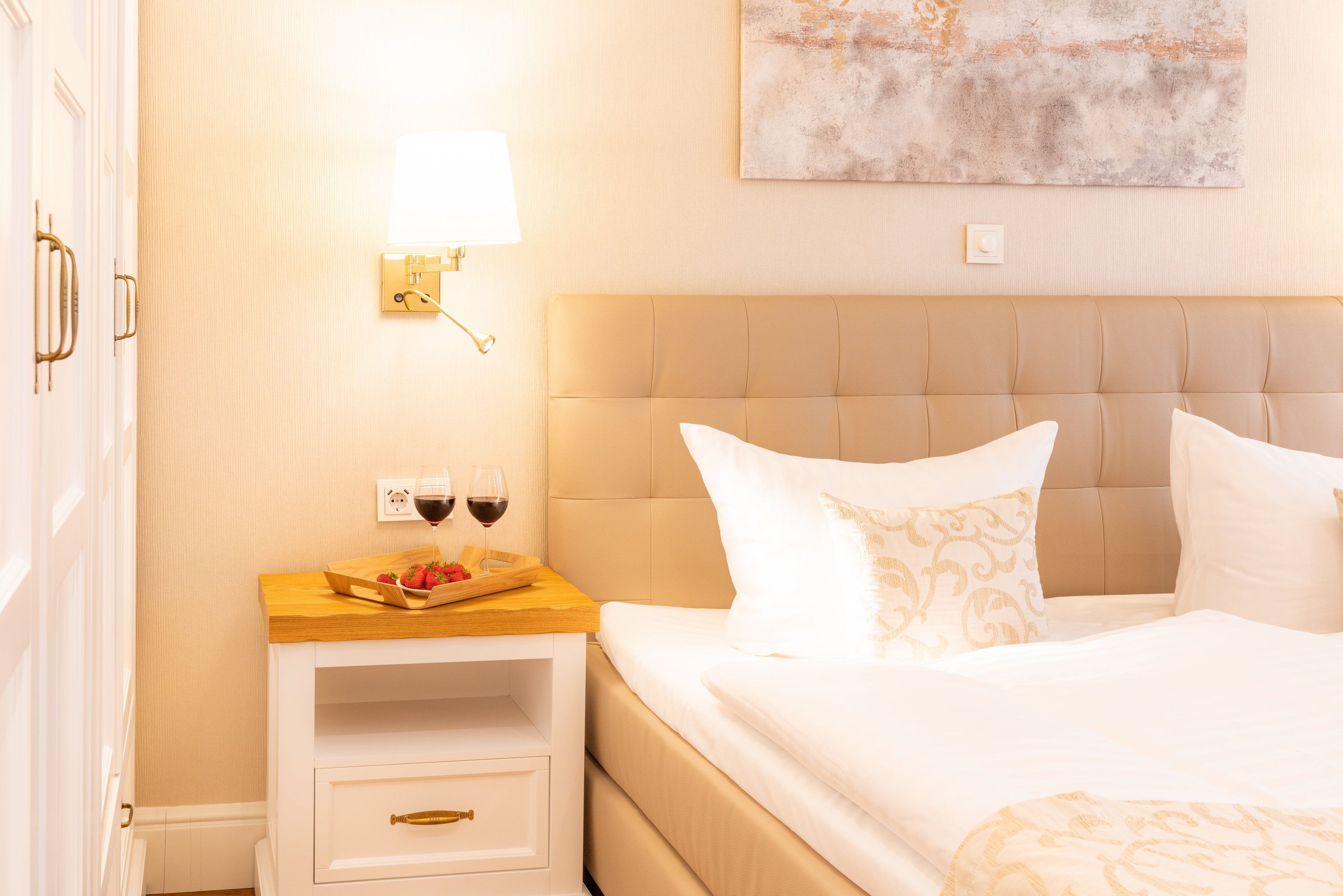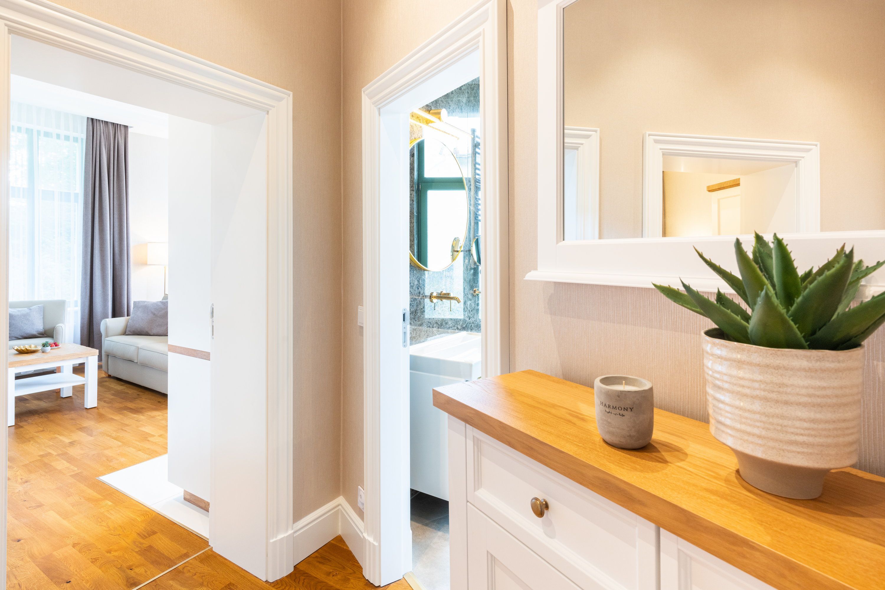 Ein ein großzügiger Wohnbereich mit einem exklusiven Gaskamin erwartet Sie bereits, sodass Sie eine angenehme Wohlfühlatmosphäre das gesamte Jahr über genießen. Eine bequeme Couchgarnitur und ein Flat TV runden den Komfort perfekt ab und laden zum Entspannen und Füße hochlegen ein. Das helle Zwei-Zimmer-Appartement hat eine Größe von 60 Quadratmetern und liegt im Hochparterre der Villa Waldschloss. Die vollausgestattete Küche, welche speziell von einem einheimischen Tischler angefertigt wurde, ergänzt die Annehmlichkeiten dieses neuen Appartements mit allen Raffinessen: Backofen, Mikrowelle, Kühlschrank mit Gefrierfach, Toaster, Wasserkocher, Kaffeemaschine sowie einem Essplatz für 4 Personen mit Blick in den gegenüberliegenden Park. Echtholzparkett im Wohn- und Schlafraum, unkaputtbare Tapeten aus Amerika. Bei der Umgestaltung wurde nichts dem Zufall überlassen.