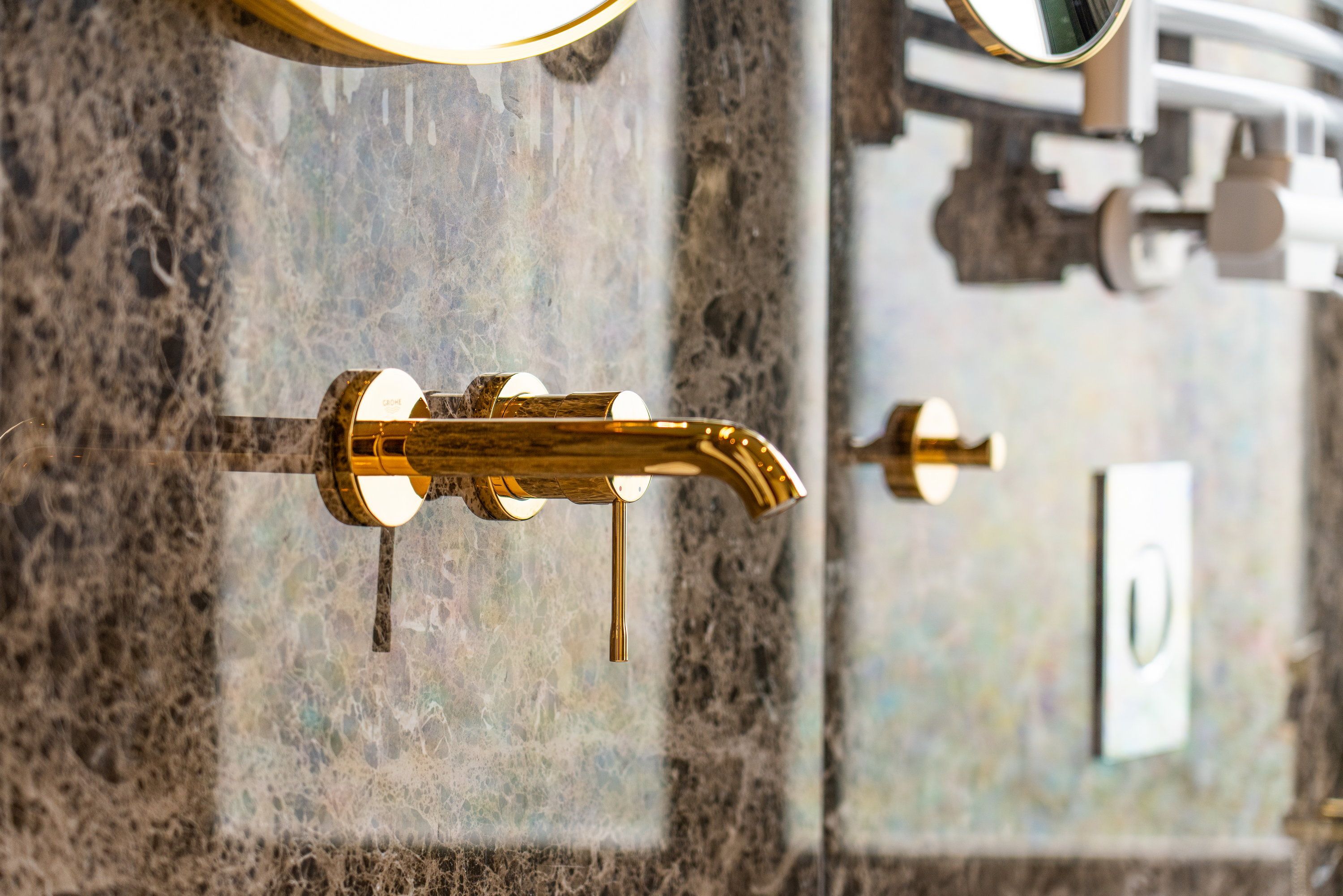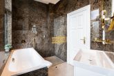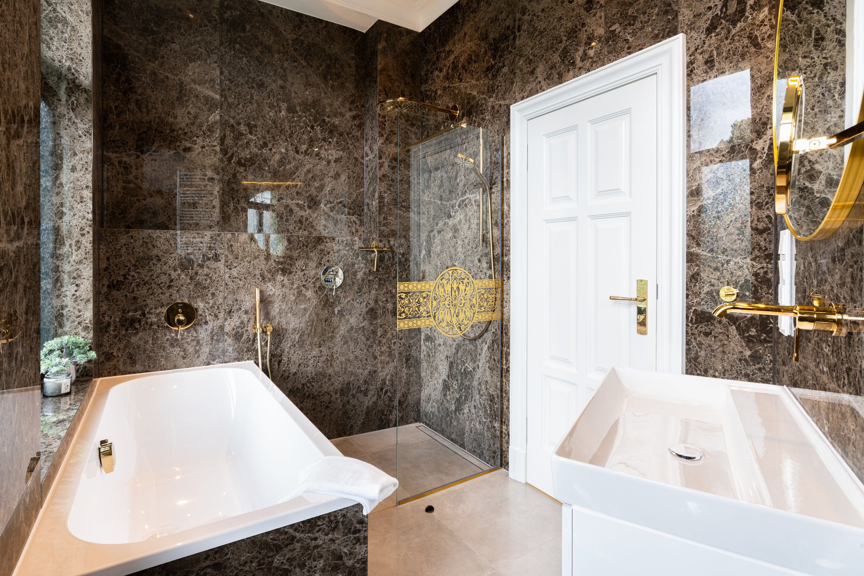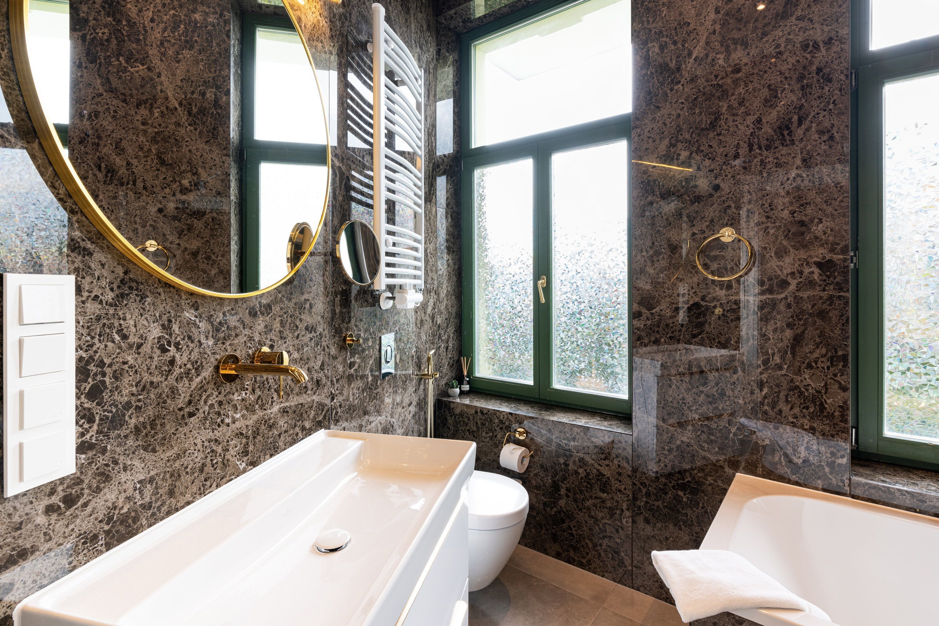 Das Badezimmer als Experiment, einmal mit einer auffallenderen und auch ungewöhnlicheren Farbgestaltung ein Wohlfühlgefühl de luxe zu erzeugen. Das Ergebnis kann sich sehen lassen: großformatige dunkle Natursteinfliesen gepaart mit einer hellen Badkeramik sowie Armaturen und Accessoires in Messing präsentieren nun zusammen mit einer bodengleichen Dusche sowie einer Badewanne den Urlaubskomfort.