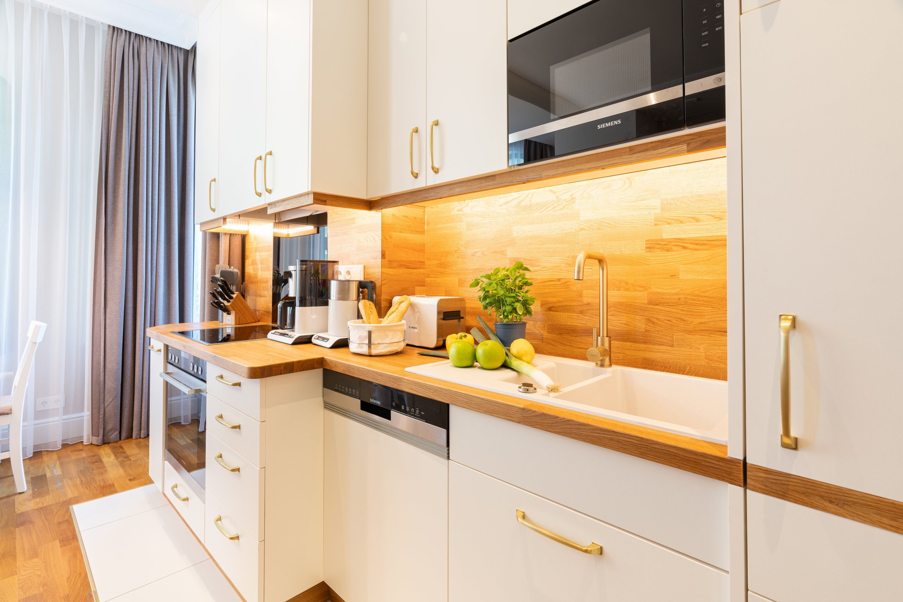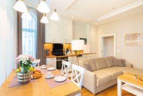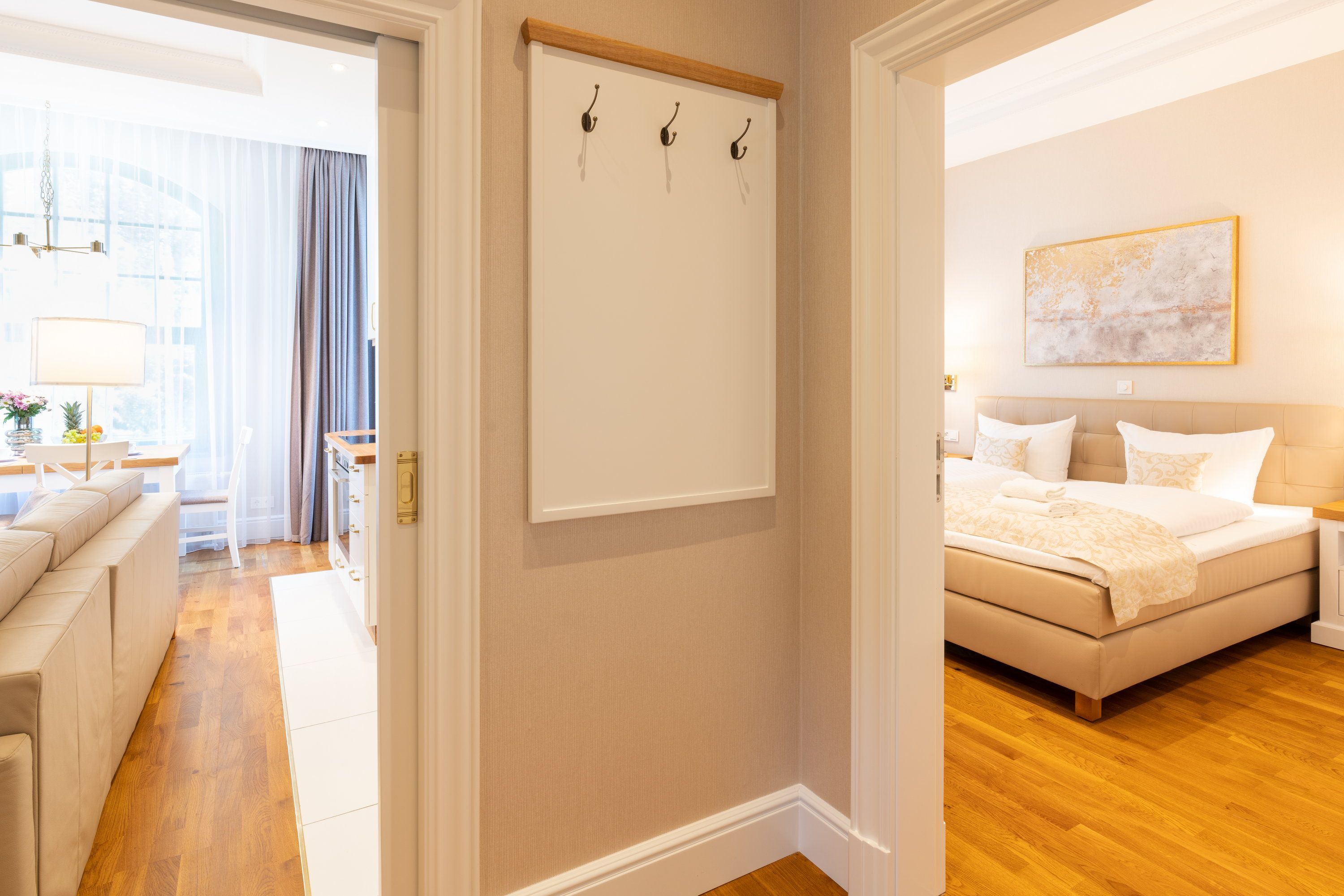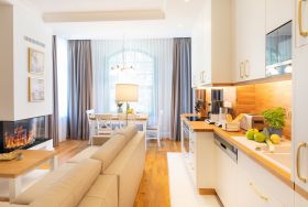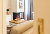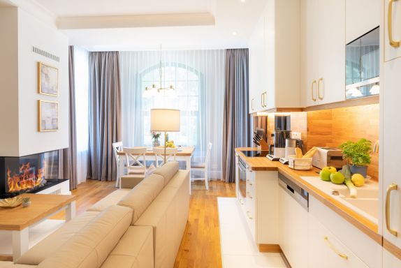 Ein großzügiger Wohnbereich mit einem exklusiven Gaskamin erwartet Sie bereits, sodass Sie eine angenehme Wohlfühlatmosphäre das gesamte Jahr über genießen. Eine bequeme Couchgarnitur und ein Flat-TV runden den Komfort perfekt ab und laden zum Entspannen und Füße hochlegen ein. Das helle Zwei-Zimmer-Appartement hat eine Größe von 46 Quadratmetern und liegt im 1. Obergschoss der Villa Waldschloss. Die vollausgestattete Küche, welche speziell von einem einheimischen Tischler angefertigt wurde, ergänzt die Annehmlichkeiten dieses neuen Appartements mit allen Raffinessen: Backofen, Mikrowelle, Kühlschrank mit Gefrierfach, Toaster, Wasserkocher, Kaffeemaschine sowie einem Essplatz für 4 Personen mit Blick in den gegenüberliegenden Park.