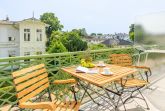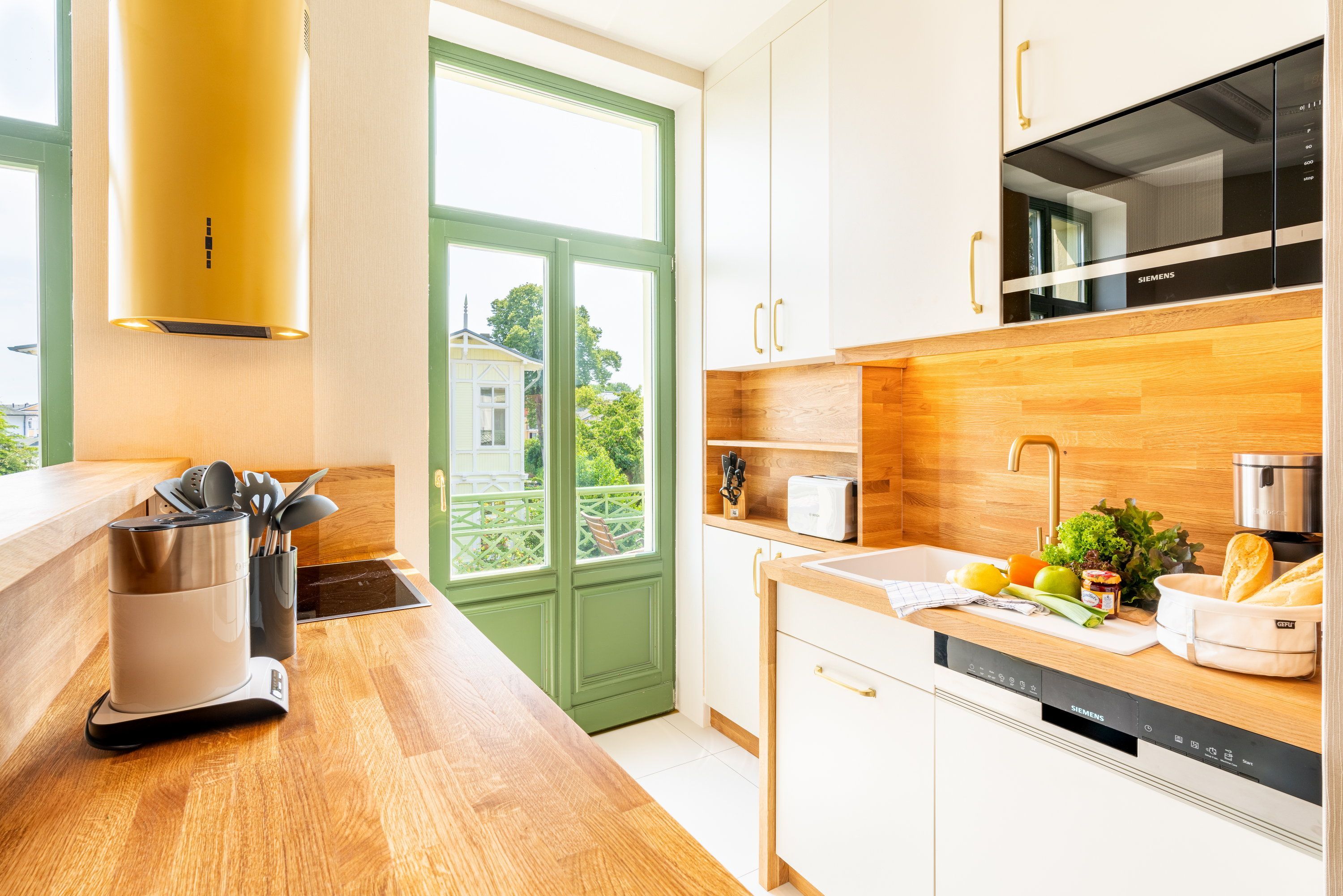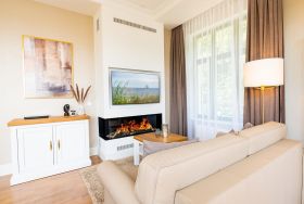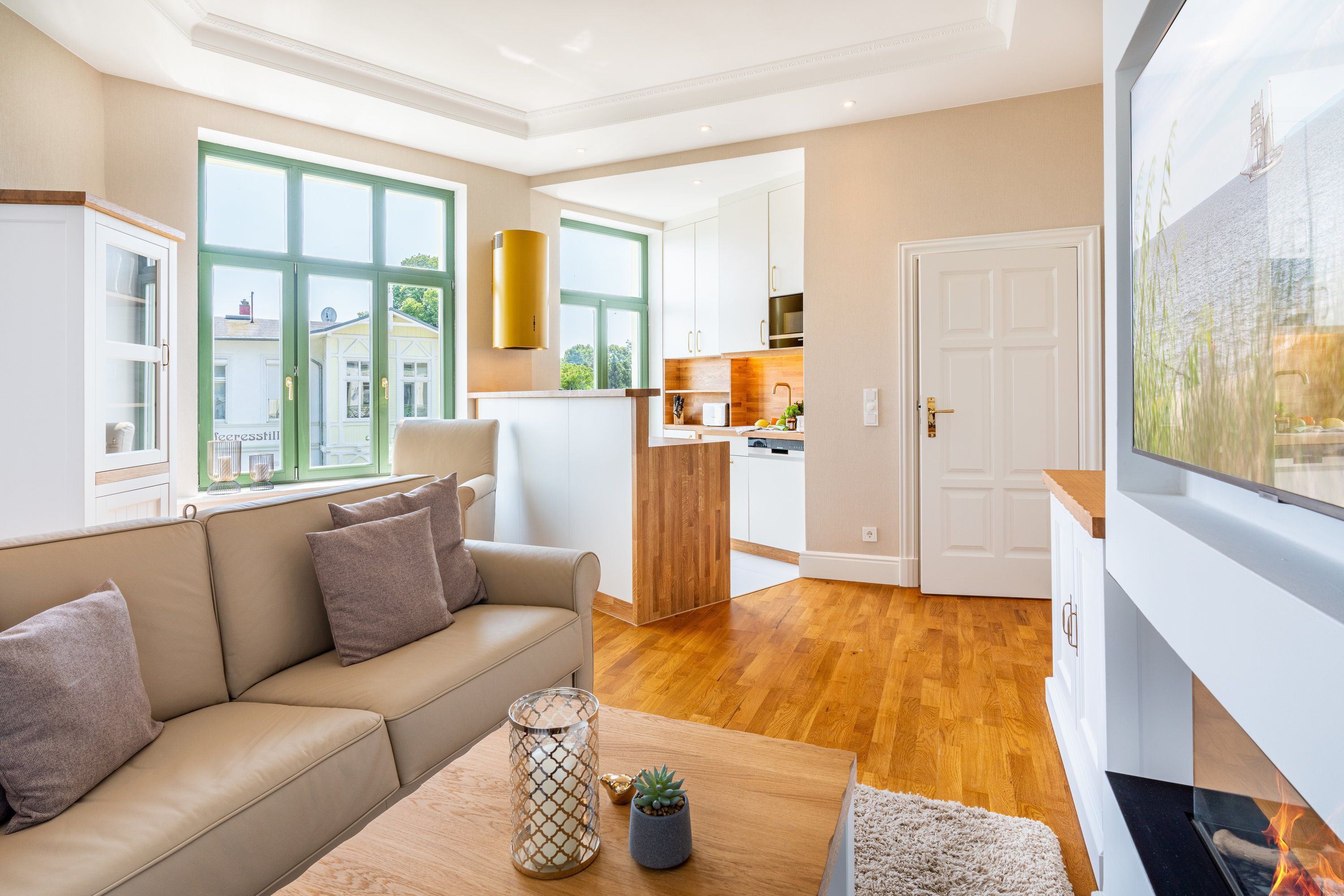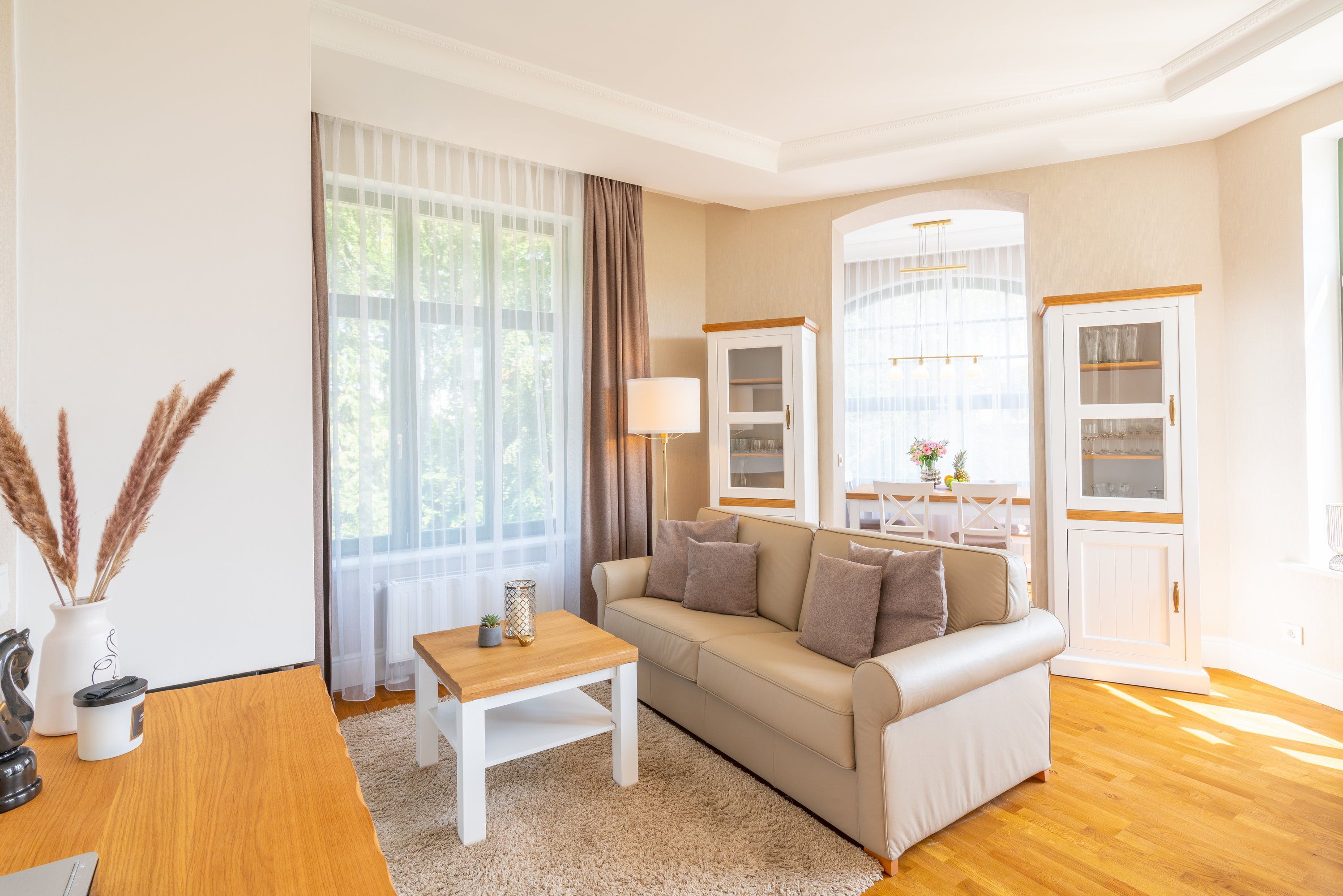 Ein großzügiger Wohnbereich mit einem exklusiven Gaskamin erwartet Sie bereits, sodass Sie eine angenehme Wohlfühlatmosphäre das gesamte Jahr über genießen. Eine bequeme Couchgarnitur und ein Flat TV runden den Komfort perfekt ab und laden zum Entspannen und Füße hochlegen ein. Das helle Zwei-Zimmer-Appartement hat eine Größe von 60 Quadratmetern und liegt im 1. Obergeschoss der Villa Waldschloss. Die vollausgestattete Küche, welche speziell von einem einheimischen Tischler angefertigt wurde, ergänzt die Annehmlichkeiten dieses neuen Appartements mit allen Raffinessen: Backofen, Mikrowelle, Kühlschrank mit Gefrierfach, Toaster, Wasserkocher, Kaffeemaschine sowie einem Essplatz für 4 Personen mit Blick in den gegenüberliegenden Park. Lauschen Sie dem Klang der Ostsee auf einem der beiden Balkone. Ein Balkon ist vom Wohnbereich ein zweiter vom Schlafzimmer begehbar. Echtholzparkett im Wohn- und Schlafraum, unkaputtbare Tapeten aus Amerika. Bei der Umgestaltung wurde nichts dem Zufall überlassen. Die vier Schlafplätze verteilen sich auf das Schlafzimmer mit einem bequemen und zugleich hochwertigem Boxspringbett (200 x 200cm / zwei getrennte Matratze) und der Schlafcouch im Wohnbereich, welche sich im Handumdrehen für zwei Gäste als Schlafmöglichkeit umfunktionieren lässt. Ein Kleiderschrank zum Verstauen Ihrer Habseligkeiten während Ihrer Urlaubszeit steht für Sie bereit. Lassen Sie hier den Tag ausklingen oder genießen Ihre Lieblingsserie vor dem TV.