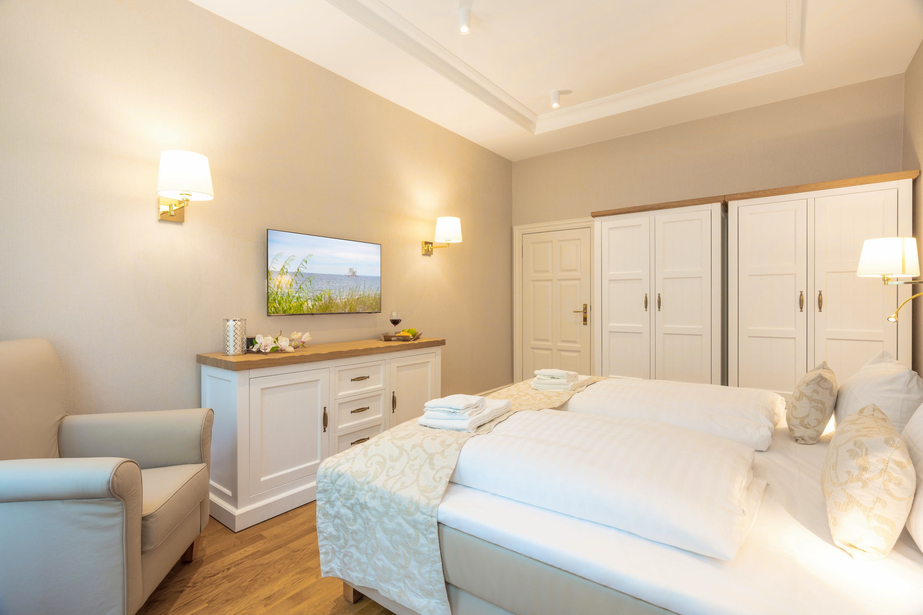 Die Schlafmöglichkeiten verteilen sich auf ein gemütliches Schlafzimmer mit hochwertigem Boxspringbett (200 x 200 cm, zwei getrennte Matratzen) sowie eine Schlafcouch im Wohnbereich, die sich bei Bedarf schnell in eine komfortable Schlafgelegenheit für zwei weitere Gäste verwandeln lässt. Ein geräumiger Kleiderschrank bietet ausreichend Platz für Ihre Urlaubsgarderobe.