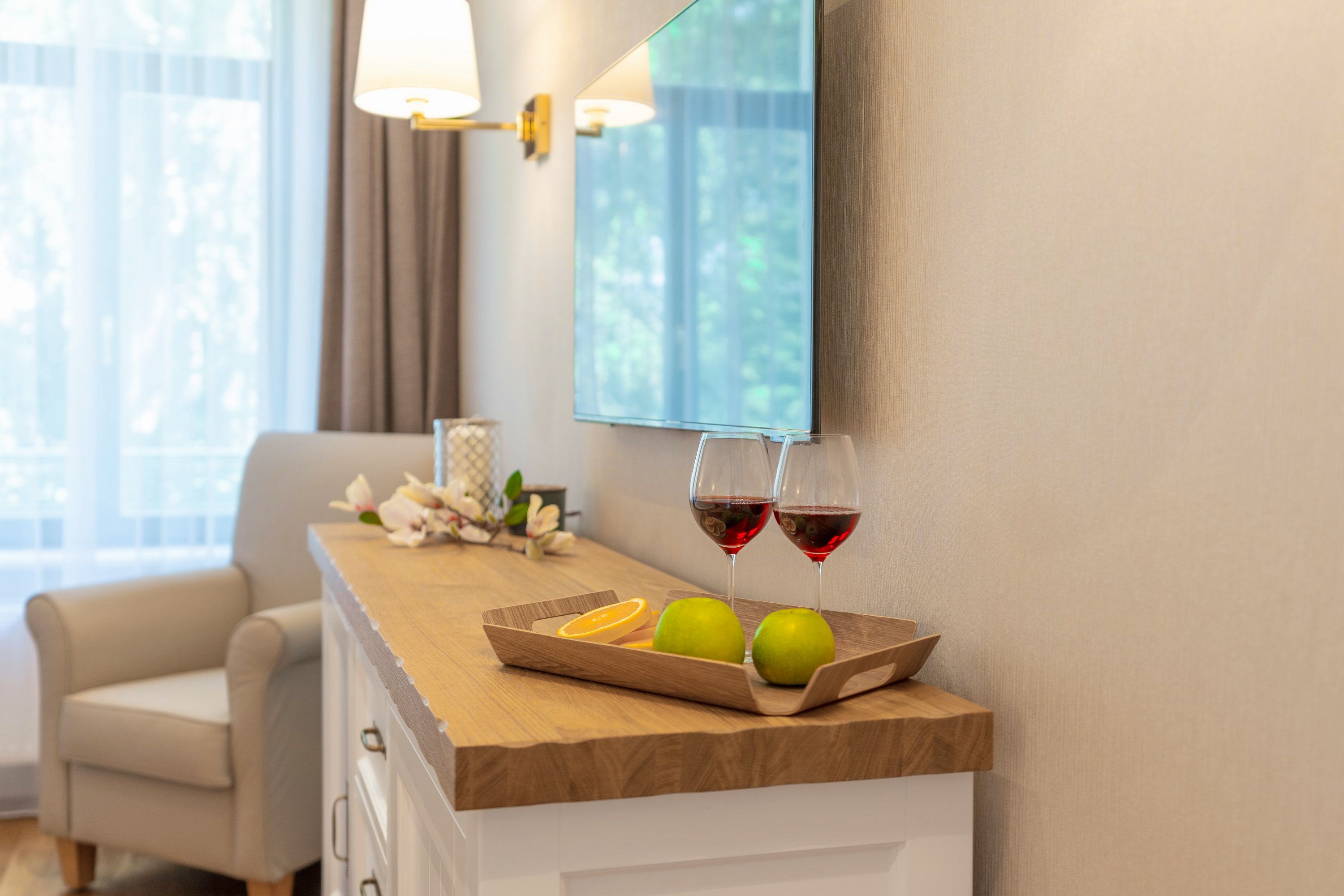 Auf 60 Quadratmetern erwartet Sie ein durchdachtes Zwei-Zimmer-Appartement im 1. Obergeschoss. Der großzügige Wohnbereich mit exklusivem Gaskamin ist der perfekte Treffpunkt für gemeinsame Stunden ob bei einem Spieleabend, einem guten Buch oder gemütlich auf der Couch. Der Flat-TV sorgt zusätzlich für Unterhaltung, während hochwertige Materialien und warme Farben eine behagliche Atmosphäre schaffen.