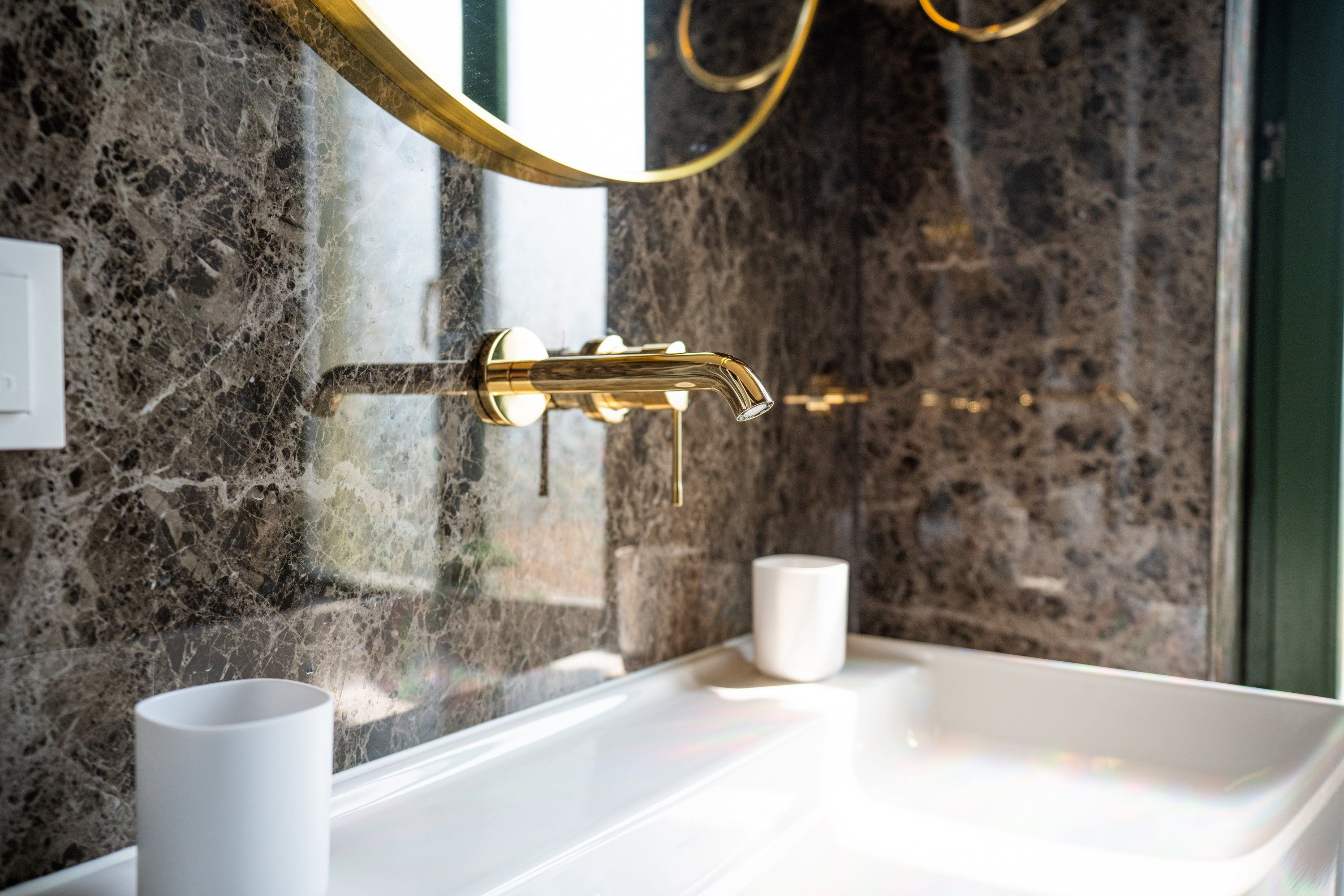 Das Badezimmer überzeugt mit einer außergewöhnlichen und stilvollen Gestaltung: großformatige dunkle Natursteinfliesen treffen auf helle Badkeramik, edle Messing-Armaturen und Accessoires. Die bodengleiche Dusche sorgt für zusätzlichen Komfort und rundet das hochwertige Gesamtbild ab.
