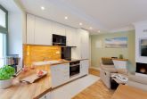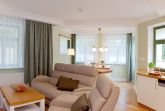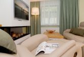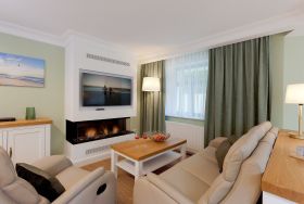 Ein großzügiger Wohnbereich mit einem exklusiven Gaskamin erwartet Sie bereits, sodass Sie eine angenehme Wohlfühlatmosphäre das gesamte Jahr über genießen. Eine bequeme Couchgarnitur und ein Flat TV runden den Komfort perfekt ab und laden zum Entspannen und Füße hochlegen ein. Das helle Zwei-Zimmer-Appartement hat eine Größe von 60 Quadratmetern und liegt im Gartengeschoss der Villa Waldschloss. Die vollausgestattete Küche, welche speziell von einem einheimischen Tischler angefertigt wurde, ergänzt die Annehmlichkeiten dieses neuen Appartements mit allen Raffinessen: Backofen, Mikrowelle, Kühlschrank mit Gefrierfach, Toaster, Wasserkocher, Kaffeemaschine sowie einem Essplatz für 4 Personen. Dem Rauschen der Ostsee können Sie bereits von Ihrer Sonnenterrasse im Grünen lauschen. Echtholzparkett im Wohn- und Schlafraum, unkaputtbare Tapeten aus Amerika. Bei der Umgestaltung wurde nichts dem Zufall überlassen. Die vier Schlafplätze verteilen sich auf das Schlafzimmer mit einem bequemen und zugleich hochwertigem Boxspringbett (200 x 200cm / zwei getrennte Matratze) und der Schlafcouch im Wohnbereich, welche sich im Handumdrehen für zwei Gäste als Schlafmöglichkeit umfunktionieren lässt. Ein Kleiderschrank zum Verstauen Ihrer Habseligkeiten während Ihrer Urlaubszeit steht für Sie bereit. Lassen Sie hier den Tag ausklingen oder genießen Ihre Lieblingsserie vor dem TV.