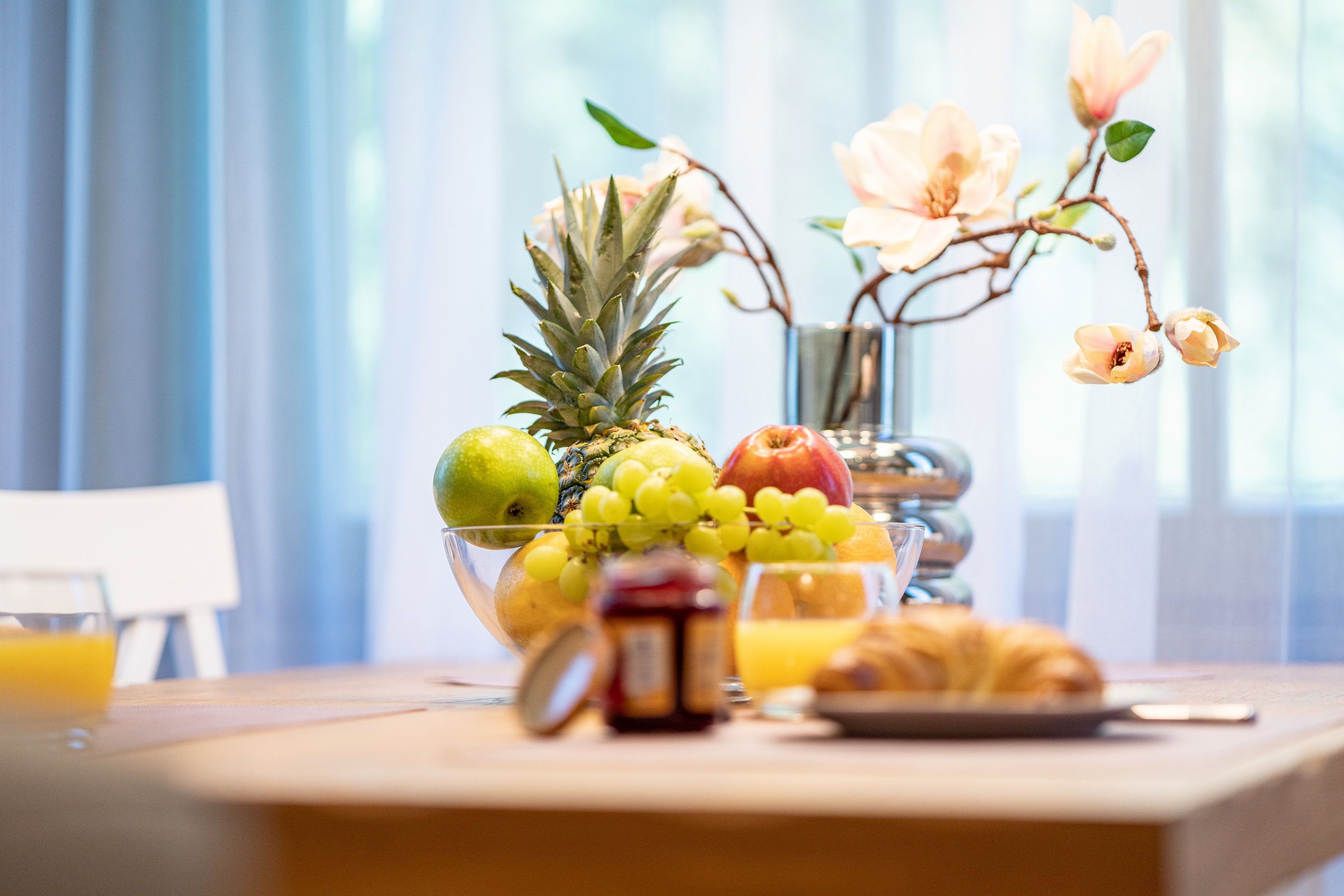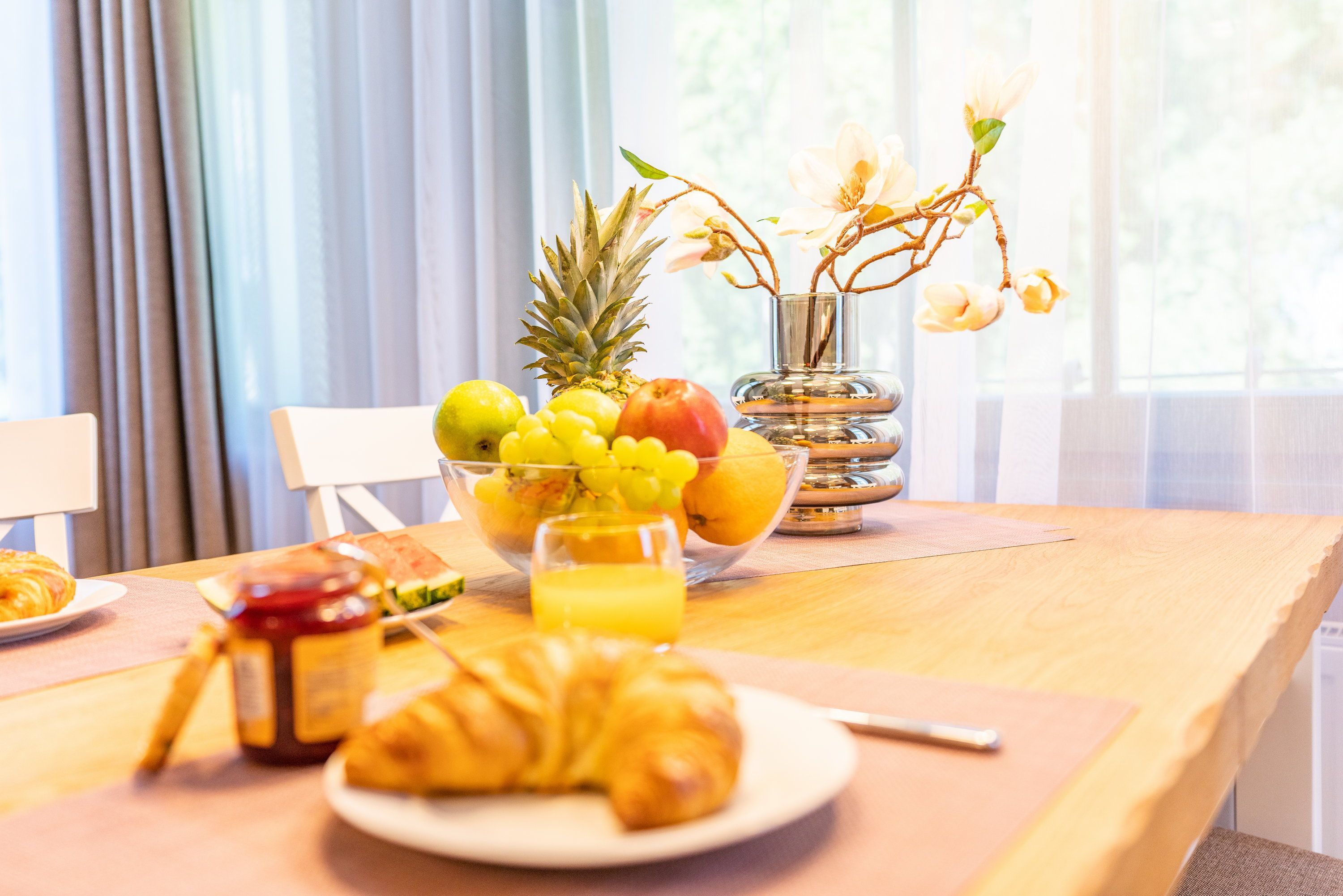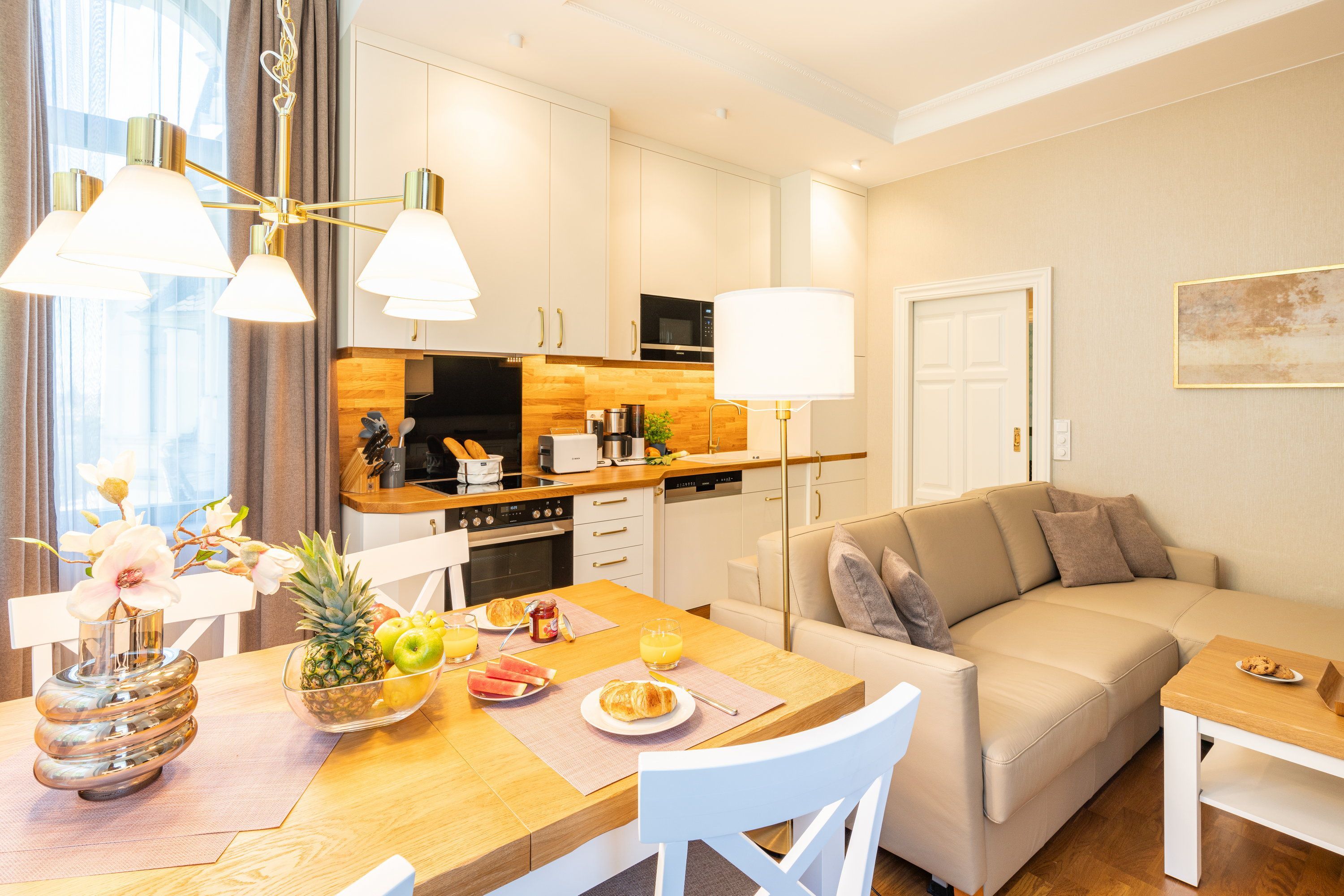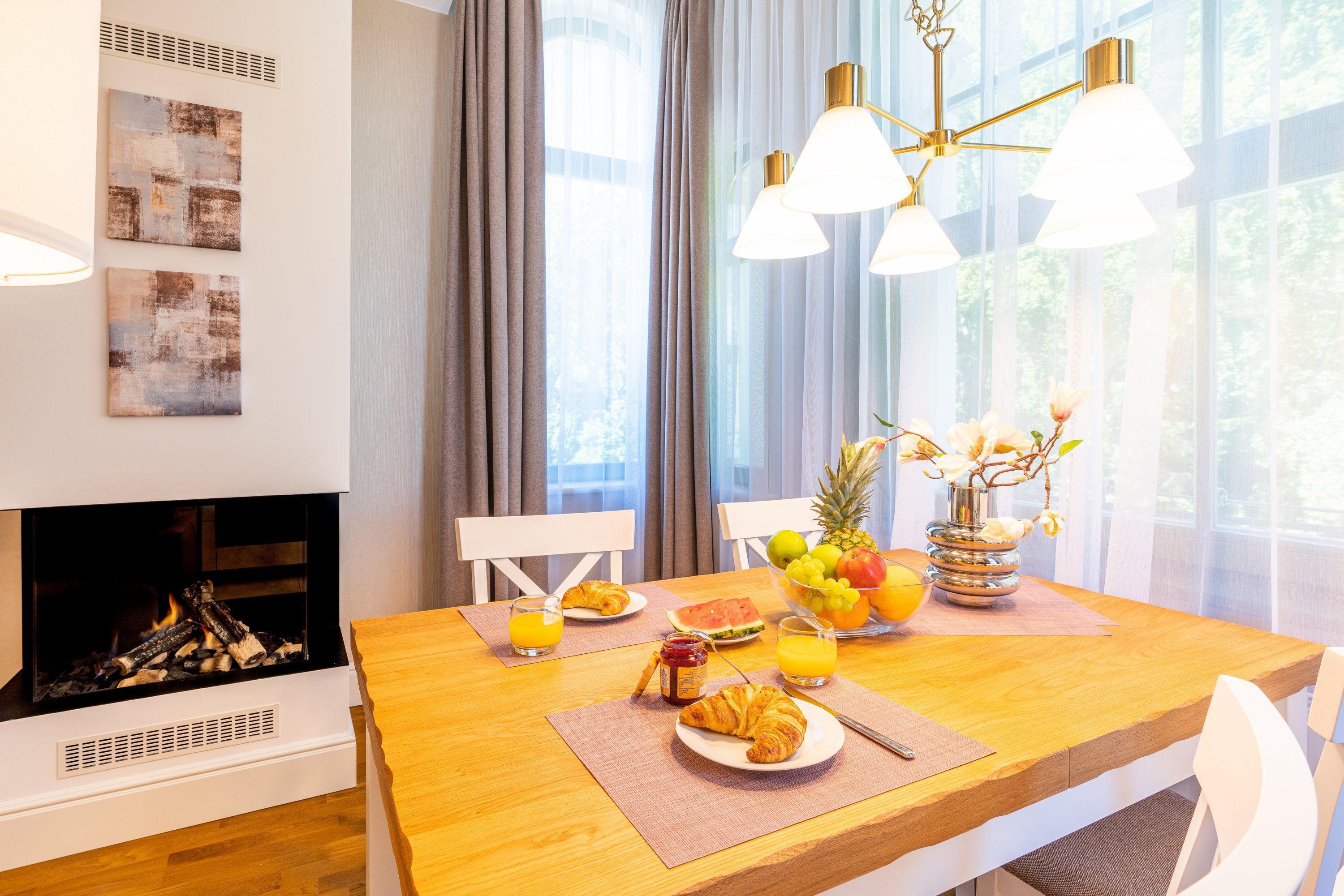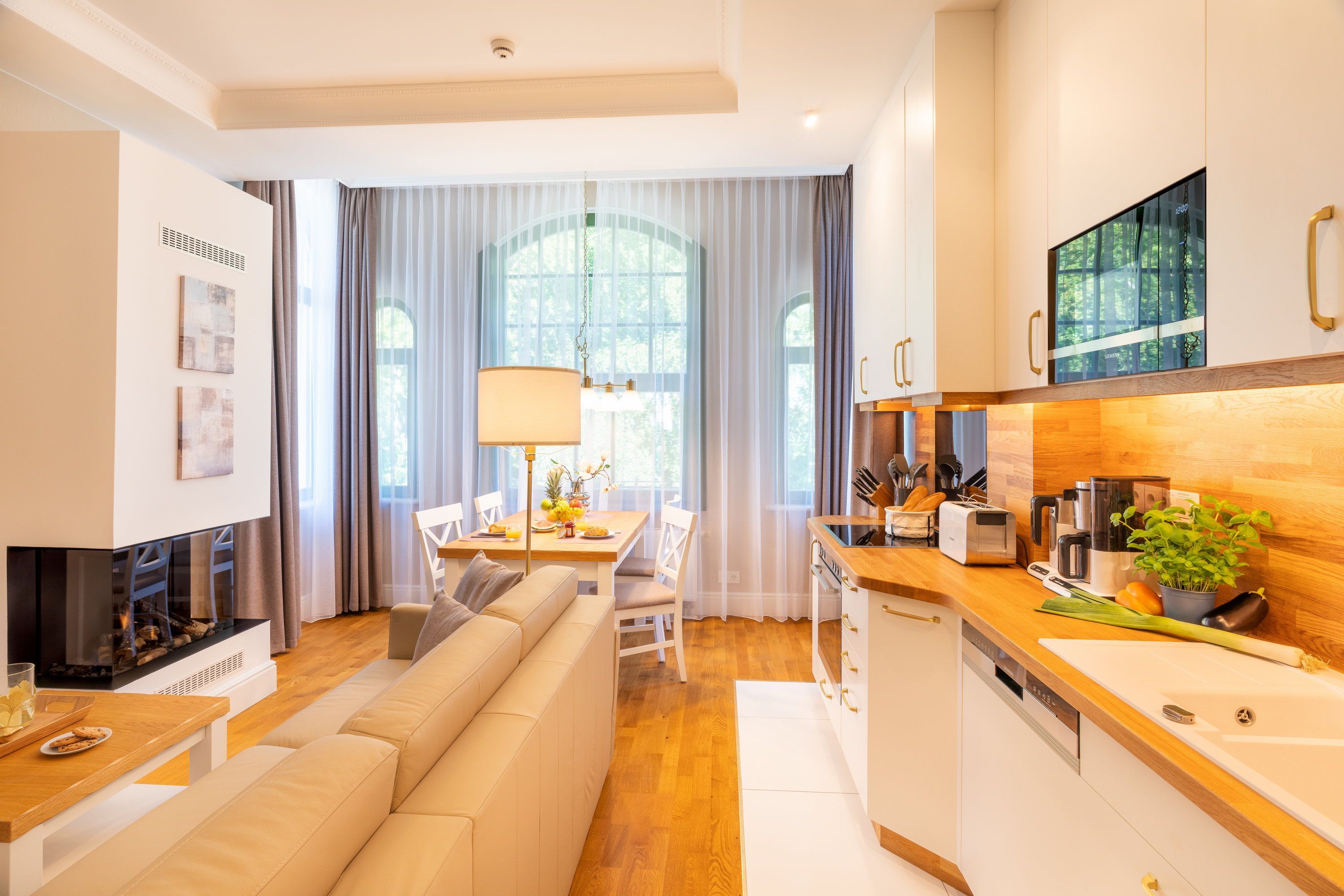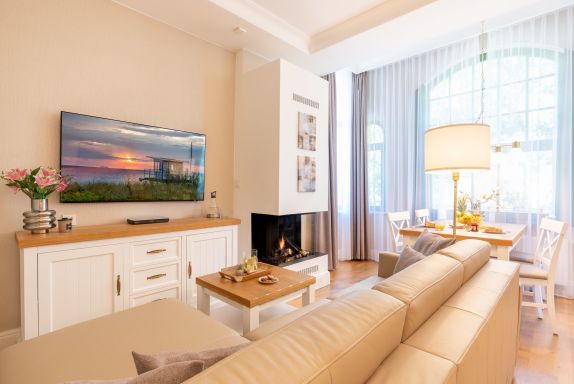 Ein großzügiger Wohnbereich mit einem exklusiven Gaskamin erwartet Sie bereits, sodass Sie eine angenehme Wohlfühlatmosphäre das gesamte Jahr über genießen. Eine bequeme Couchgarnitur und ein Flat TV runden den Komfort perfekt ab und laden zum Entspannen und Füße hochlegen ein. Das helle Zwei-Zimmer-Appartement hat eine Größe von 46 Quadratmetern und liegt im 2. Obergeschoss der Villa Waldschloss. Die vollausgestattete Küche, welche speziell von einem einheimischen Tischler angefertigt wurde, ergänzt die Annehmlichkeiten dieses neuen Appartements mit allen Raffinessen: Backofen, Mikrowelle, Kühlschrank mit Gefrierfach, Toaster, Wasserkocher, Kaffeemaschine sowie einem Essplatz für 4 Personen mit Blick in den gegenüberliegenden Park. Echtholzparkett im Wohn- und Schlafraum, unkaputtbare Tapeten aus Amerika. Bei der Umgestaltung wurde nichts dem Zufall überlassen. Die vier Schlafplätze verteilen sich auf das Schlafzimmer mit einem bequemen und zugleich hochwertigem Boxspringbett (200 x 200cm / zwei getrennte Matratze) und der Schlafcouch im Wohnbereich, welche sich im Handumdrehen für zwei Gäste als Schlafmöglichkeit umfunktionieren lässt. Ein Kleiderschrank zum Verstauen Ihrer Habseligkeiten während Ihrer Urlaubszeit steht für Sie bereit. Lassen Sie hier den Tag ausklingen oder genießen Ihre Lieblingsserie vor dem TV.