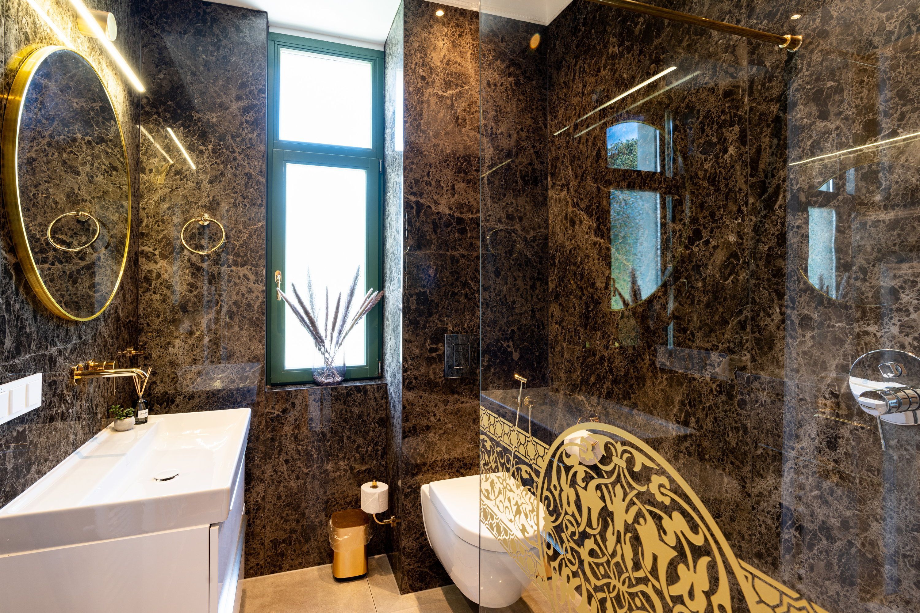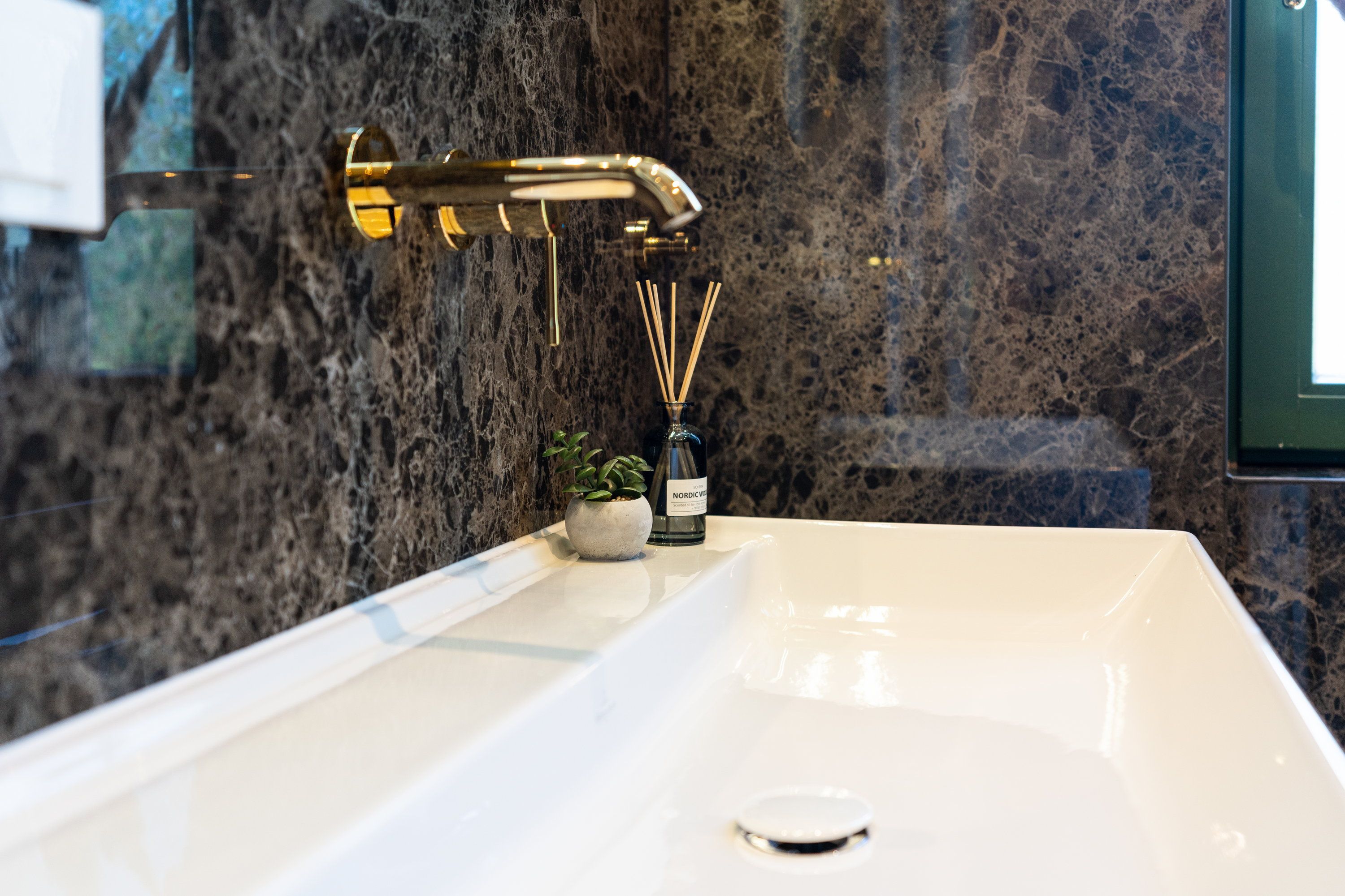 Damit Sie Ihre wohlverdiente Urlaubszeit bereits am Anreisetag in vollen Zügen genießen können, haben wir das Bett für Sie und das für Ihre lieben Mitreisenden bereits bezogen und ein Duschtuch sowie ein kleines Handtuch bereitgelegt. Das Badezimmer als Experiment, einmal mit einer auffallenderen und auch ungewöhnlicheren Farbgestaltung ein Wohlfühlgefühl de luxe zu erzeugen. Das Ergebnis kann sich sehen lassen: großformatige dunkle Natursteinfliesen gepaart mit einer hellen Badkeramik sowie Armaturen und Accessoires in Messing präsentieren nun zusammen mit einer bodengleichen Dusche den Urlaubskomfort.