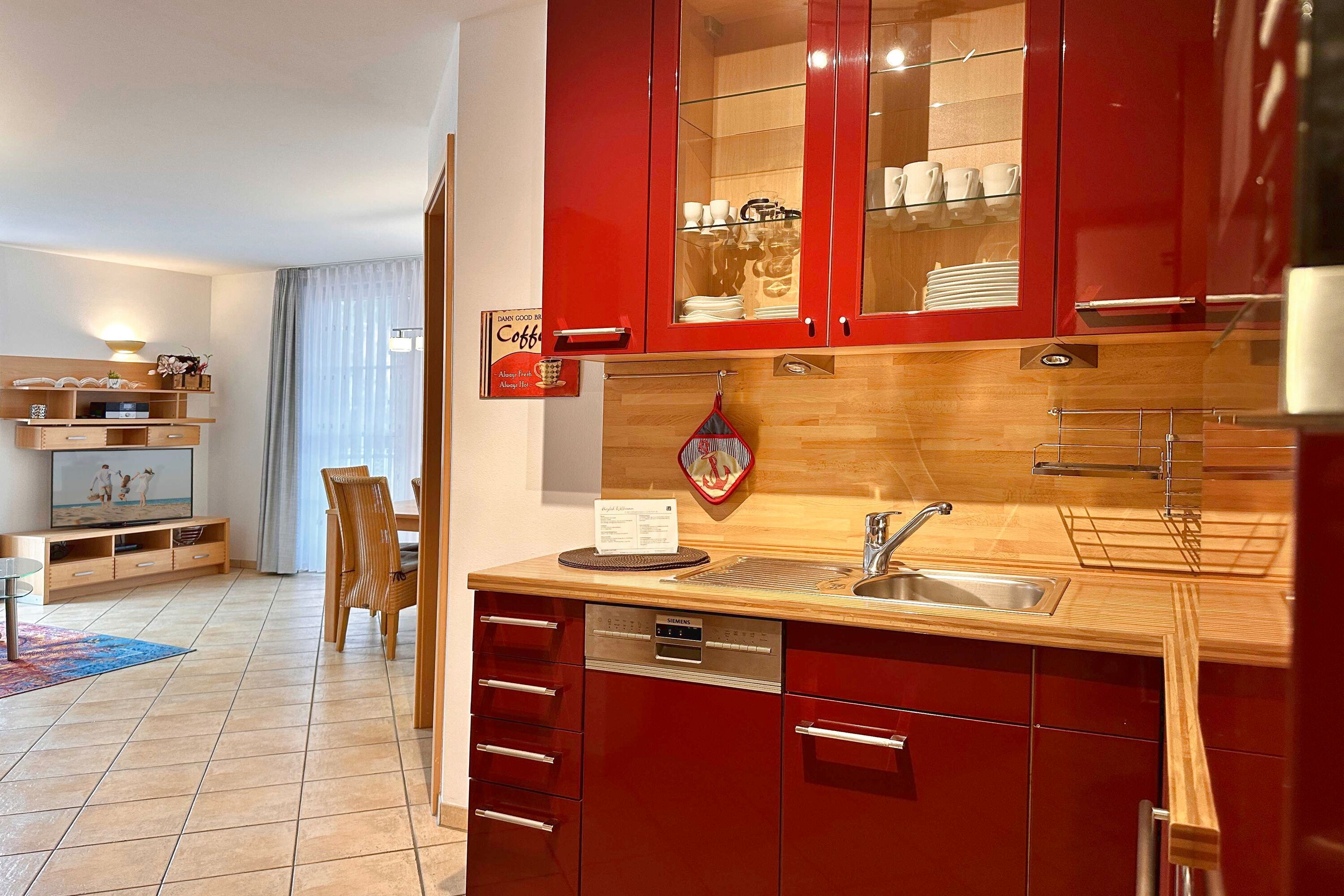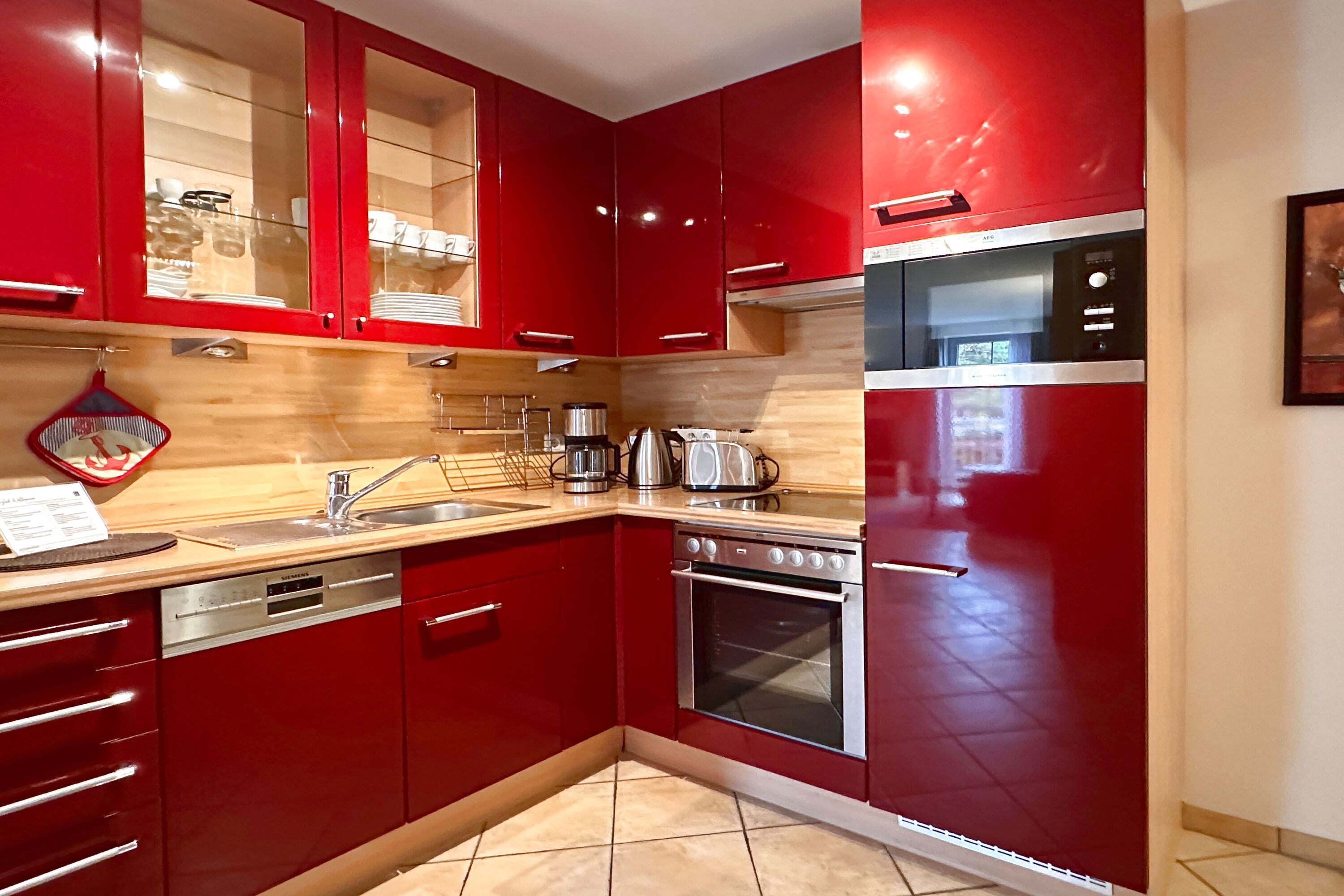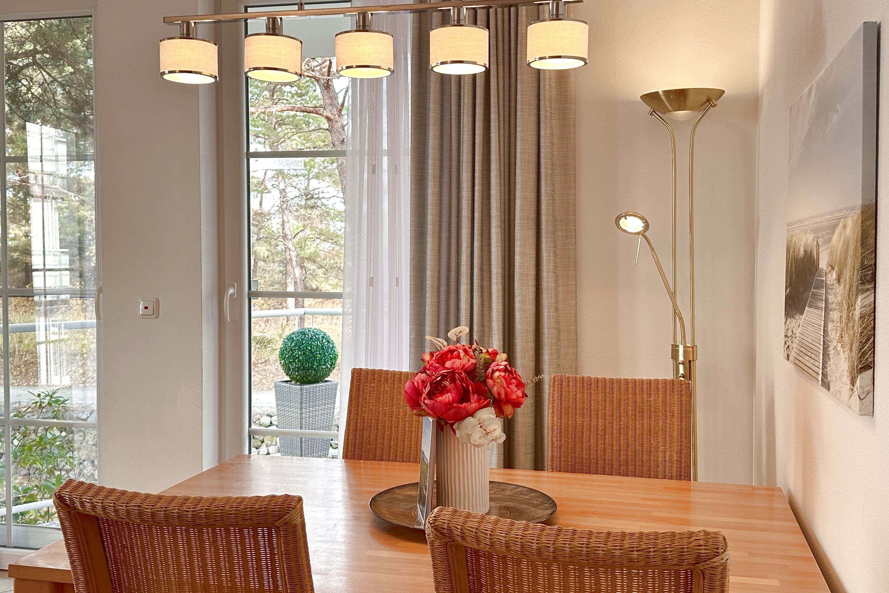 Der Wohn- und Essbereich versprüht mit seinen Holzmöbeln behagliche Gemütlichkeit. Das Ledersofa lädt nach einem erlebnisreichen Tag zum Entspannen ein. Vom Wohnbereich gelangen Sie auf den Balkon, dem idealen Ort zum Frühstücken in der Morgensonne mit Blick auf die Heringsdorfer Promenade. Sämtliche Köstlichkeiten können in der eleganten Küche zubereitet werden, die jeglichen Komfort (Backofen, Kühlschrank mit Gefrierfach, Geschirrspüler, Mikrowelle, Wasserkocher, Toaster, Kaffeemaschine) bietet und somit das Kochherz höher schlagen lässt.