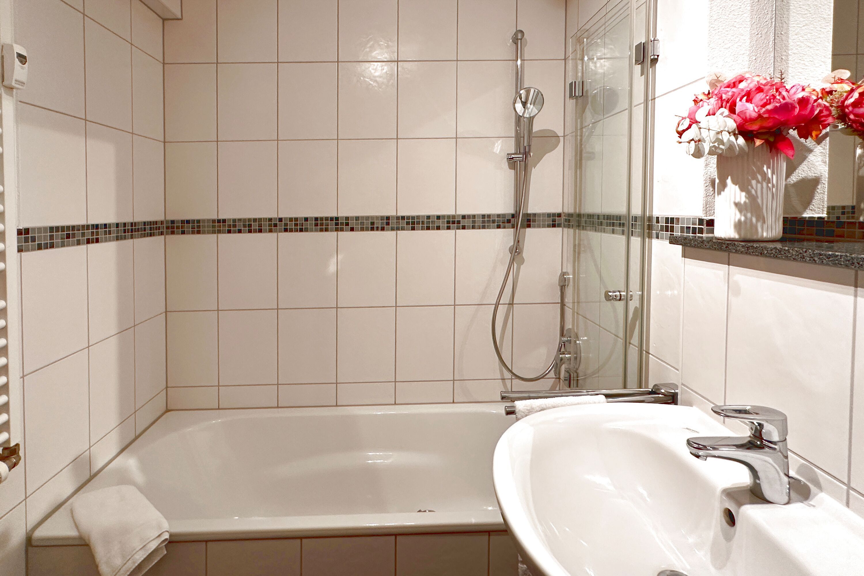 Damit Sie Ihre wohlverdiente Urlaubszeit bereits am Anreisetag in vollen Zügen genießen können, haben wir das Bett für Sie und das für Ihre lieben Mitreisenden bereits bezogen und ein Duschtuch sowie ein kleines Handtuch bereitgelegt. Das Appartement verfügt über ein Badezimmer mit Badewanne WC und einem Haartrockner. Ein Gäste-WC komplettiert den erstklassigen Urlaubskomfort.