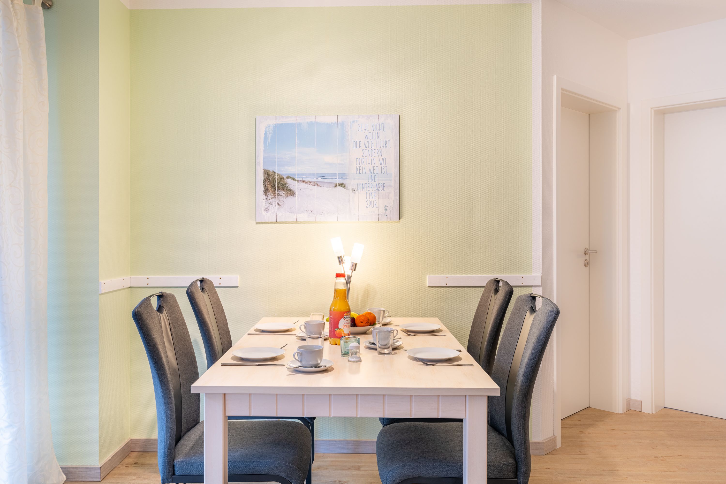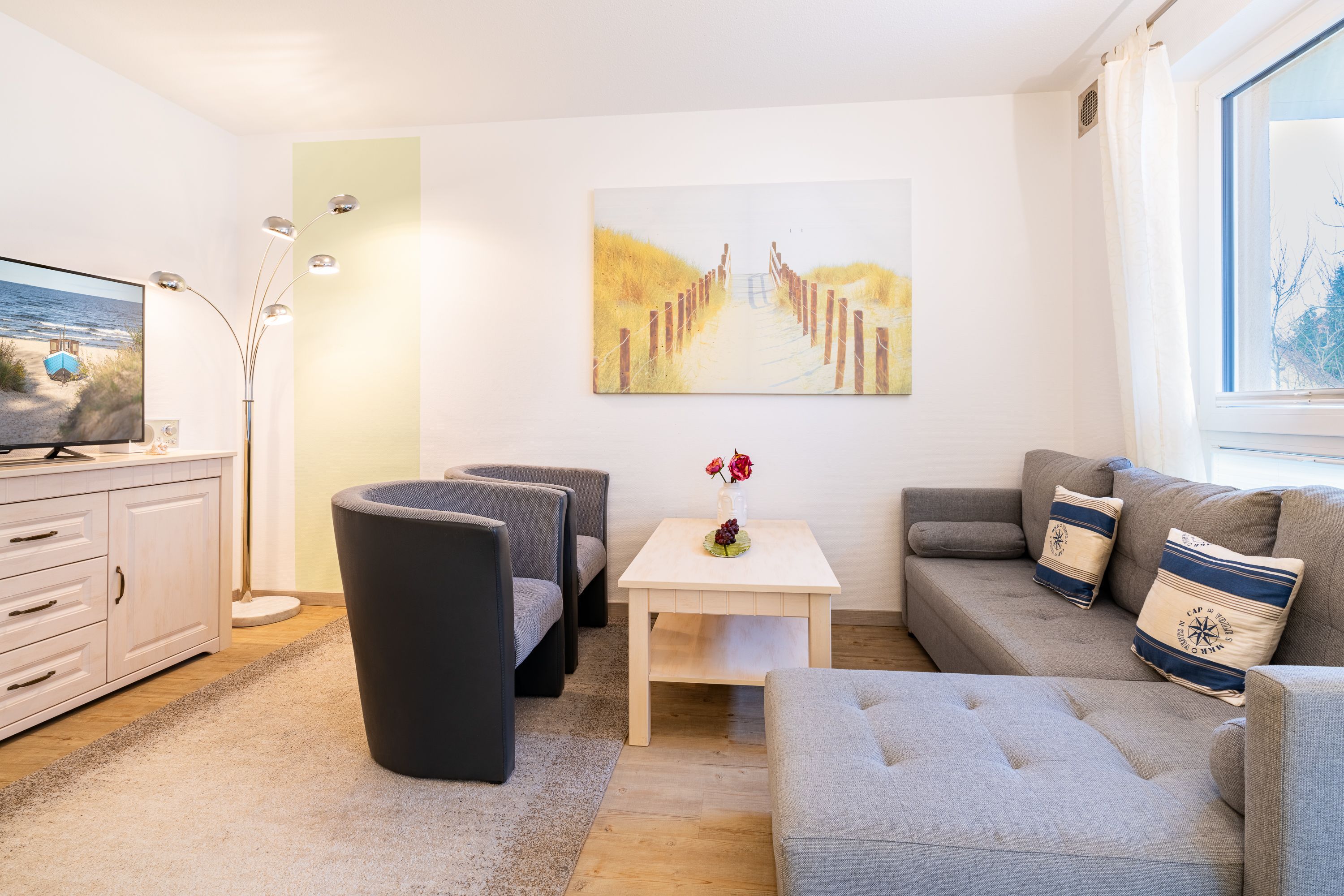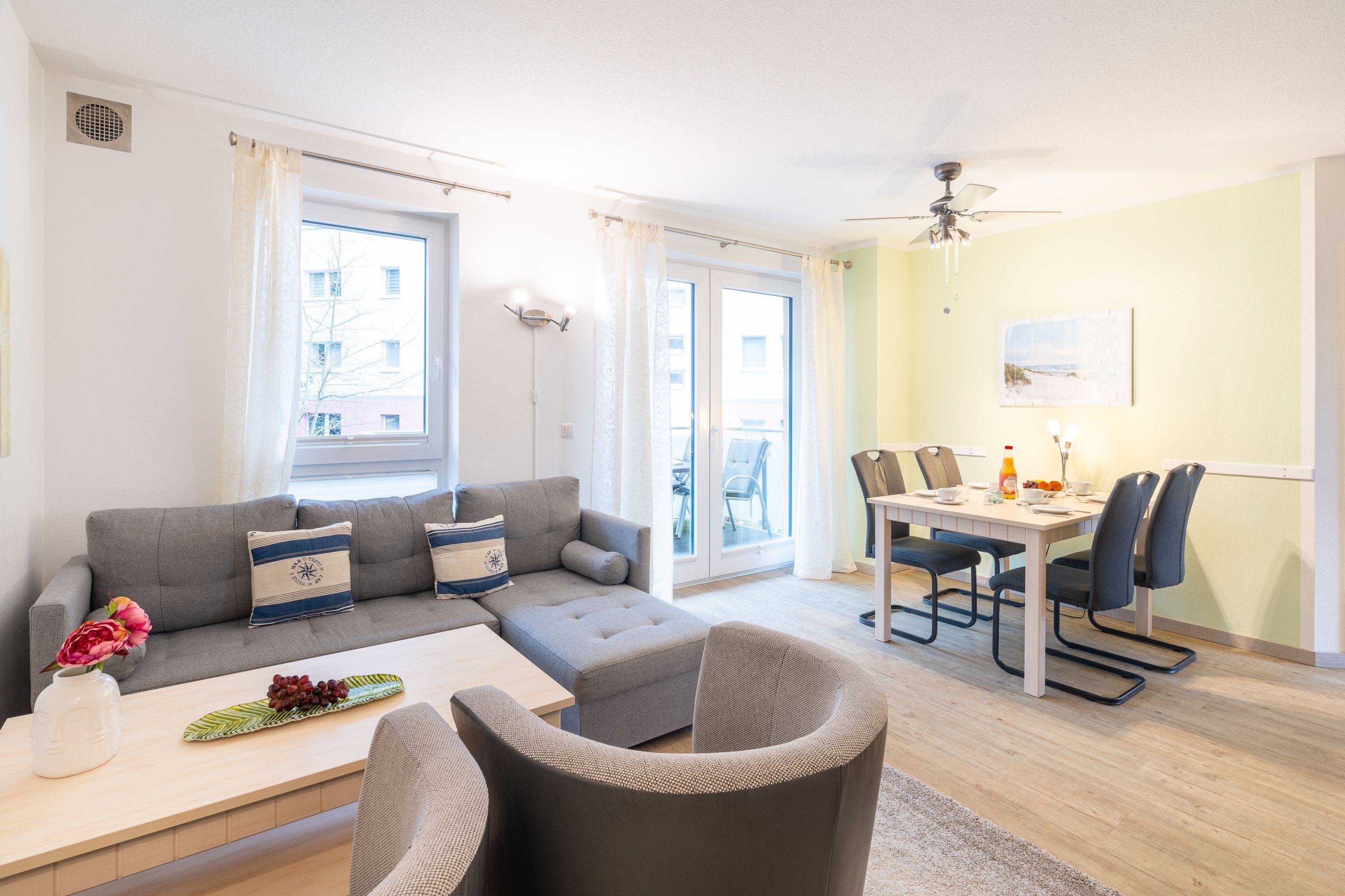 Das großzügige 3-Raum-Appartement bietet auf 67m² Raum für einen erholsamen Urlaub mit bis zu vier Personen. Der freundlich gestaltete Wohnbereich verleiht mit einer bequemen Couch und dem dazugehörigen Sessel genau die Gemütlichkeit, auf die man im Urlaub keinesfalls verzichten möchte. Die offene Küche lässt Dank Kühlschrank mit Gefrierfach, Ceran-Kochfeld, Backofen, Mikrowelle, Geschirrspülmaschine, Kaffeemaschine, Toaster und Wasserkocher u. v. m. keine Wünsche offen. Der Essplatz ist perfekt in den Wohnbereich integriert und bietet Gelegenheit für ein gemeinsames Menü. Auf dem angrenzenden Süd-West-Balkon können Sie einen erlebnisreichen Urlaubstag bei einem Glas Wein oder einem Spieleabend ausklingen lassen.