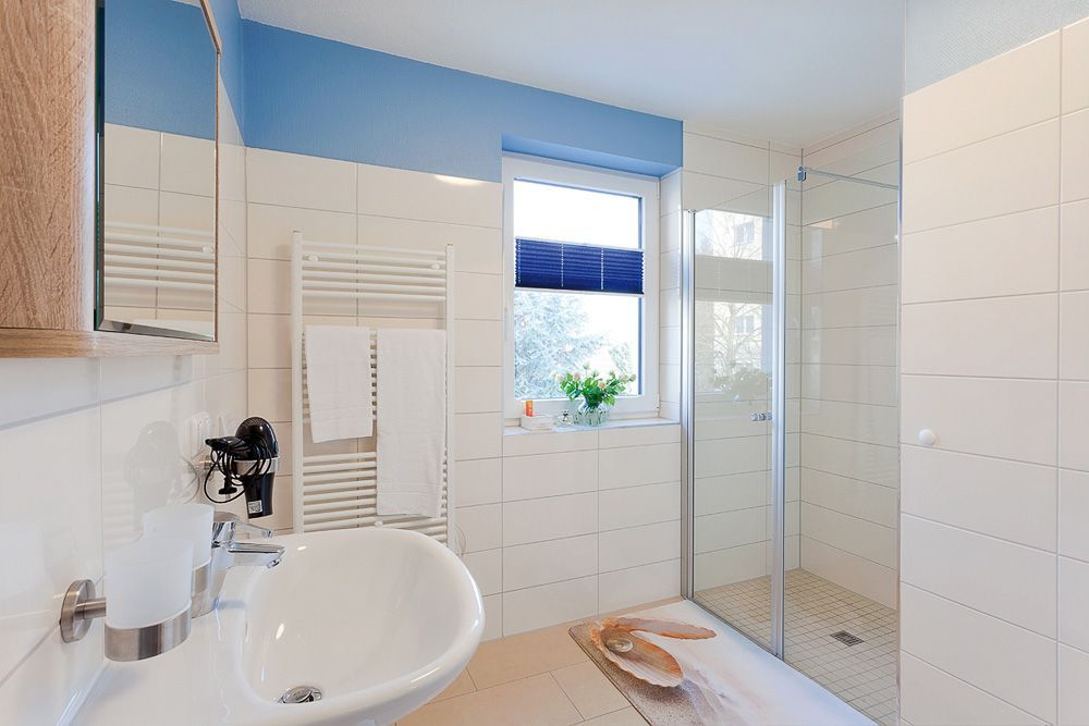 Damit Sie Ihre wohlverdiente Urlaubszeit bereits am Anreisetag in vollen Zügen genießen können haben wir das Bett für Sie und das für Ihre lieben Mitreisenden bereits bezogen und ein Duschtuch sowie ein kleines Handtuch bereitgelegt. Komfortabel gestaltet erwartet Sie eine ebenerdige Echtglasdusche, WC, Haartrockner sowie ein Handtuchheizkörper.