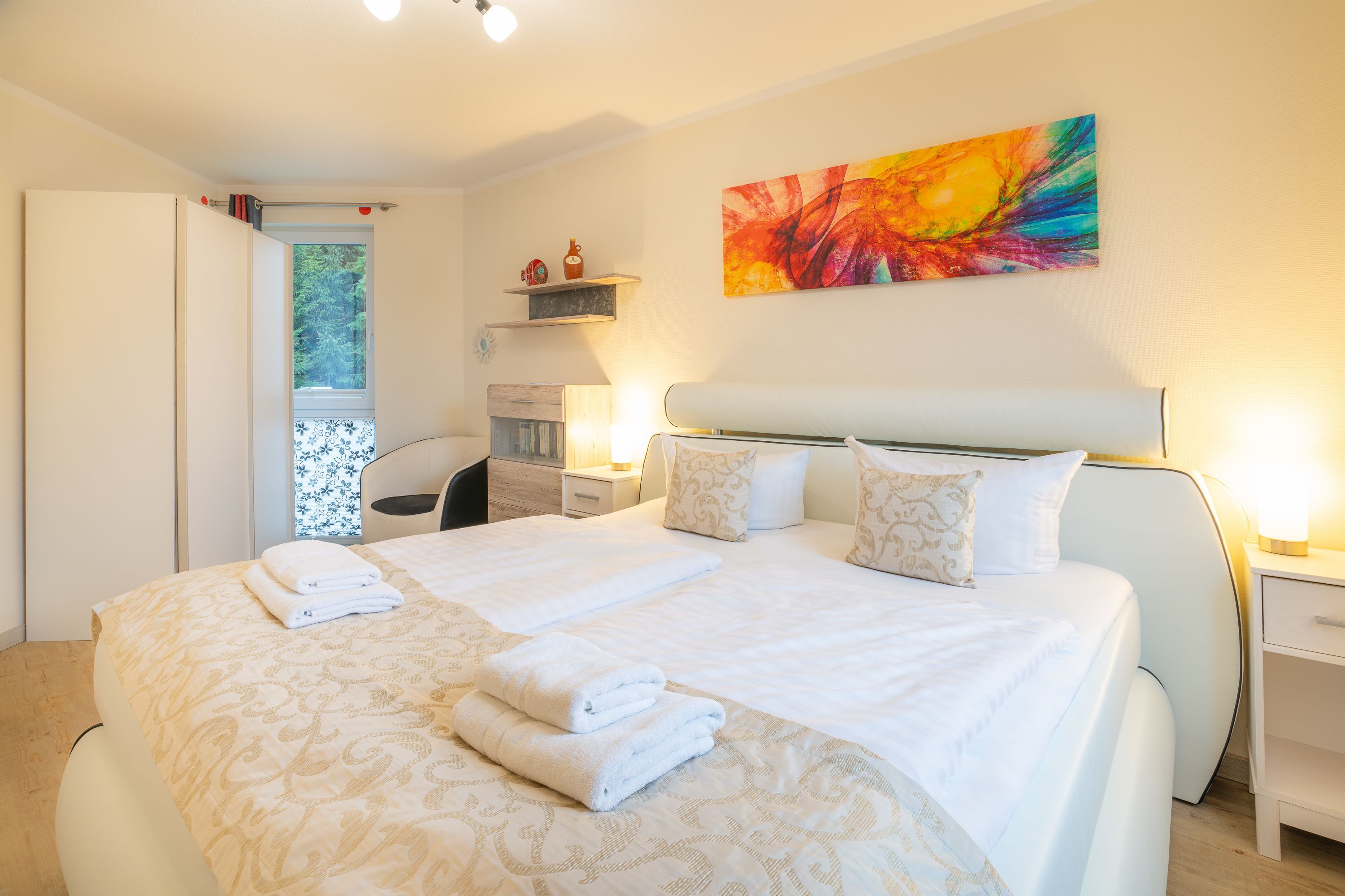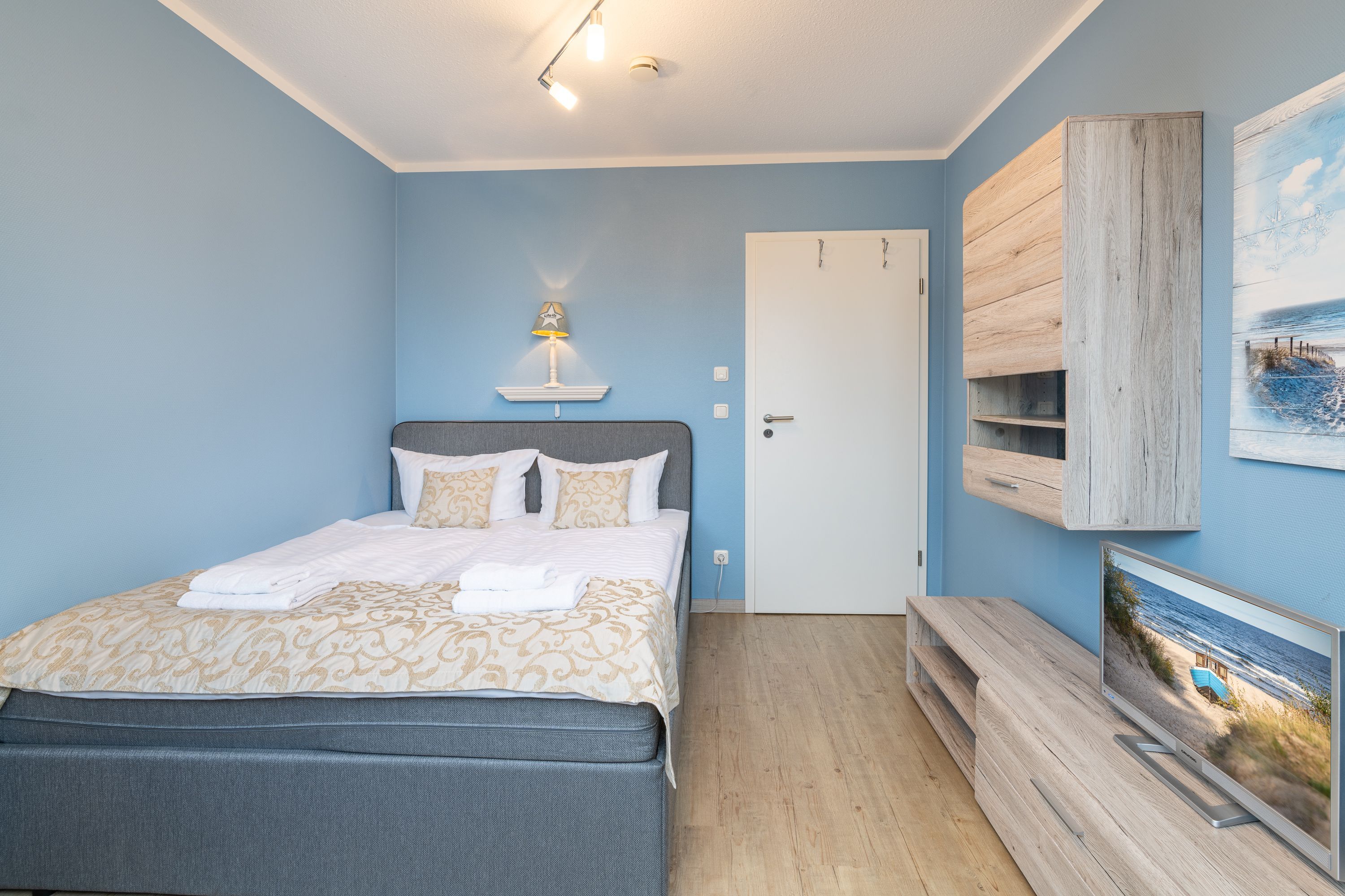 Beide Schlafzimmer sind jeweils mit einem bequemen Doppelbett (1. Schlafzimmer: 180 x 200cm / durchgehende Matratze / 2. Schlafzimmer mit TV: 160 x 200cm / zwei getrennte Matratzen) ausgestattet und bieten so perfekte Voraussetzungen für erholsame Nächte während Ihrer Urlaubszeit. Eines der beiden Zimmer verfügt zusätzlich über einen Flat-TV.