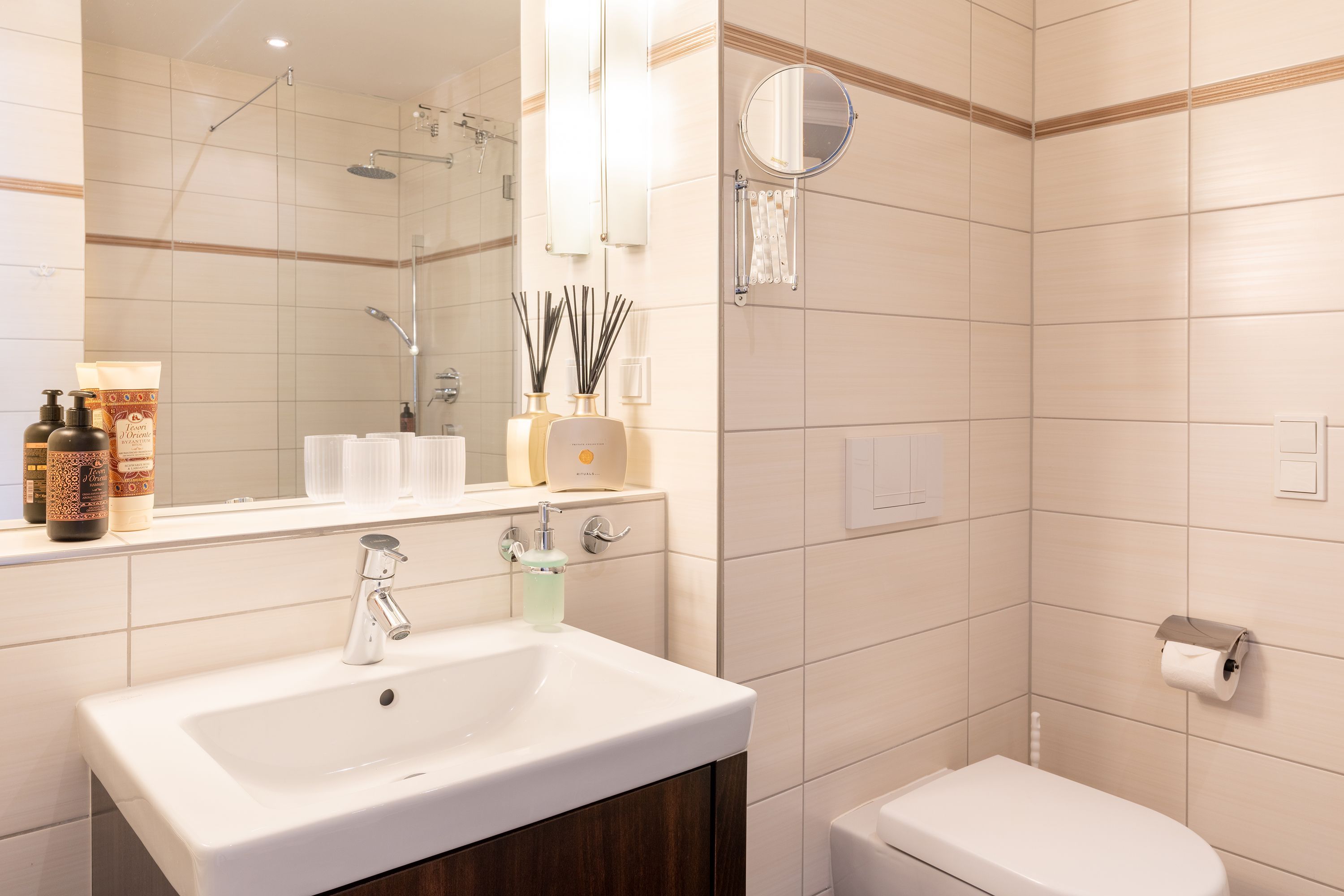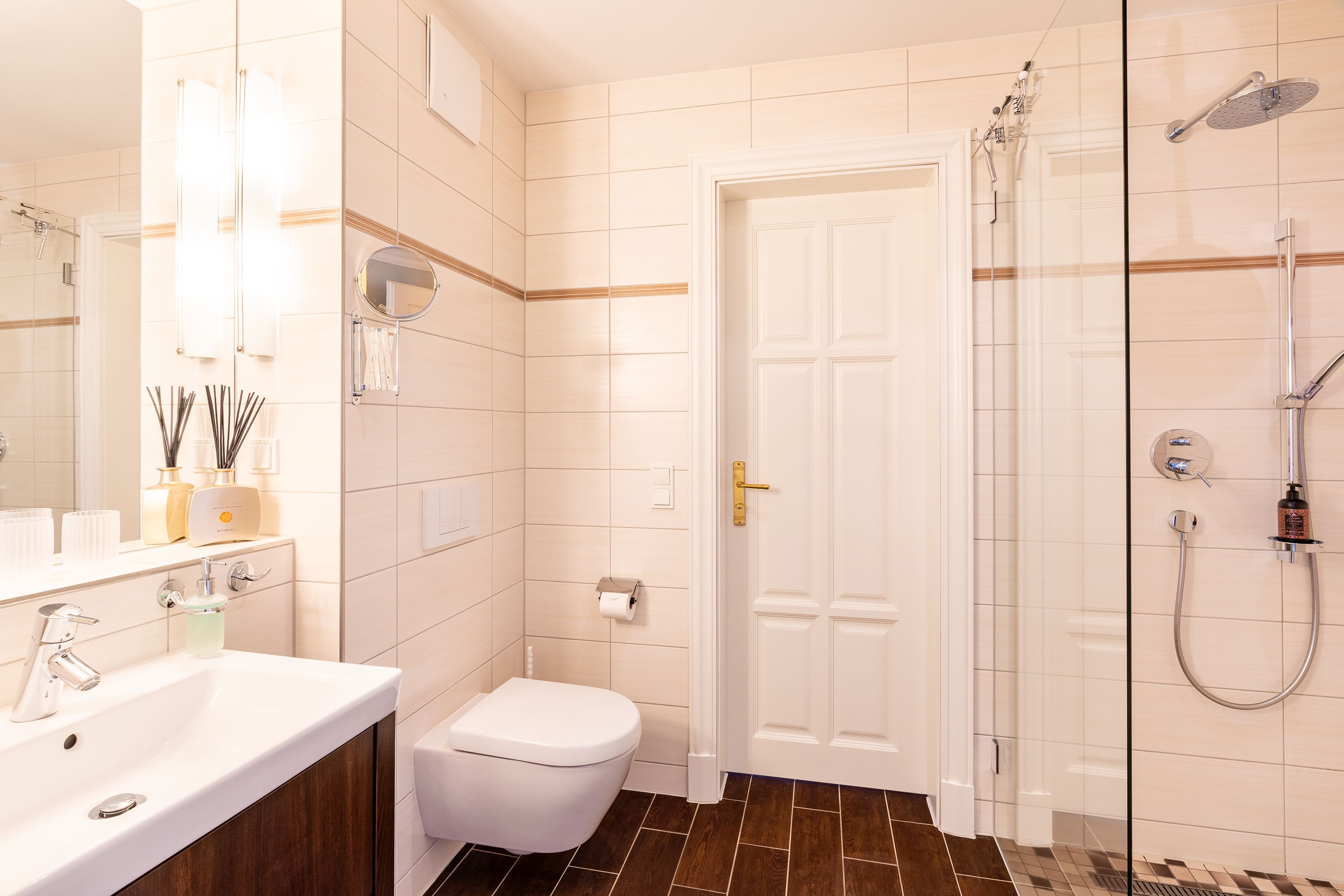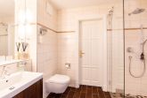 Das edle Badezimmer mit WC, Haarfön und einer Dusche im XXL-Format - ist einerseits vom Schlafzimmer als auch vom Flur begehbar.