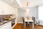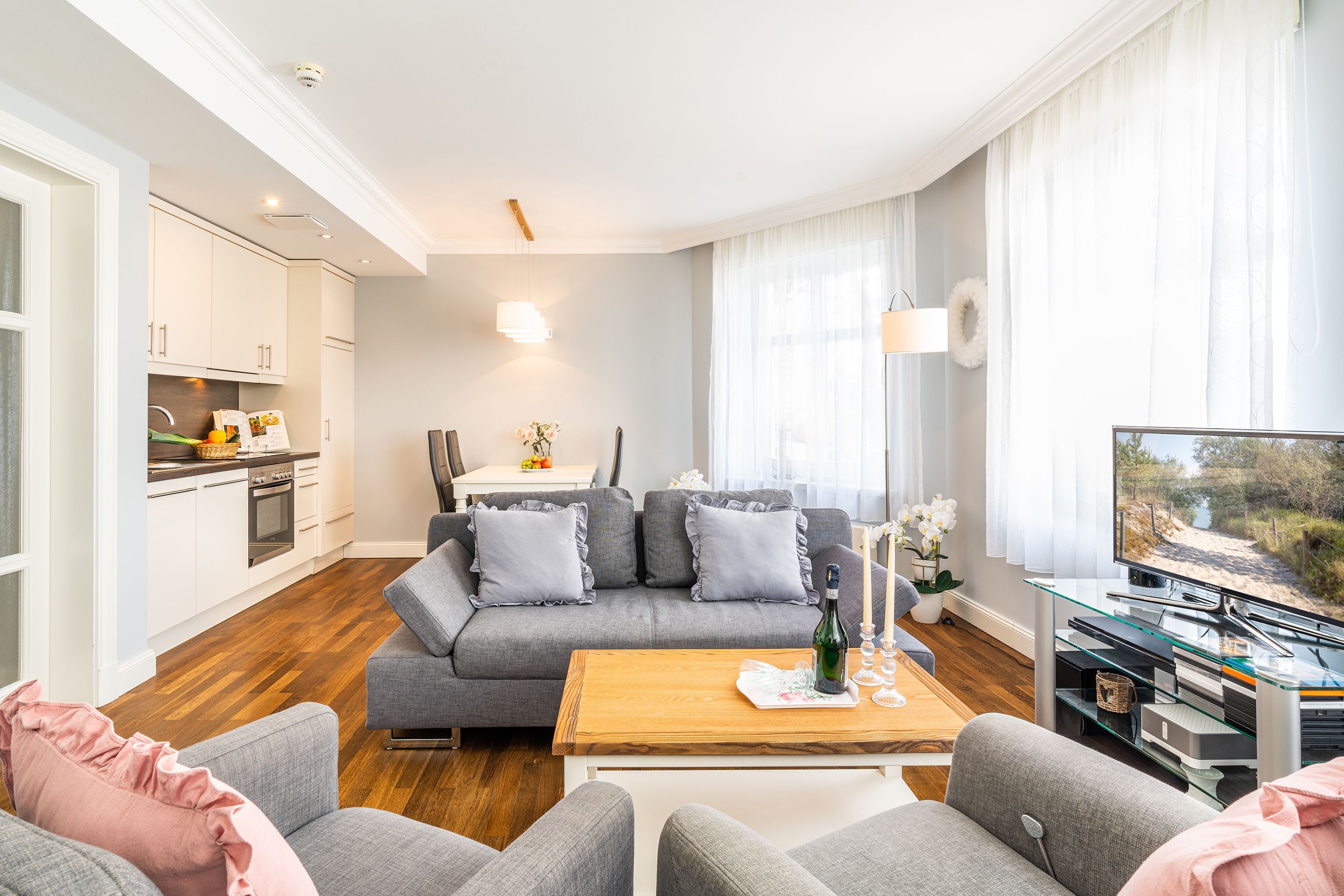 Der moderne Wohnbereich mit Relaxsessel, Sofa, Gaskamin und Flat-TV garantiert erholsame Urlaubstage zu jeder Jahreszeit. Auf dem angrenzenden Balkon Richtung Nordost können Sie die Seele so richtig baumeln lassen. Die im Wohnbereich integrierte Küche mit Esstisch für 4 Personen bietet jeglichen Komfort und lässt aufgrund ihrer Ausstattung (Backofen, Kühlschrank mit Gefrierfach, Geschirrspüler, Mikrowelle, Wasserkocher, Toaster, Kaffeemaschine) keine Wünsche offen.
