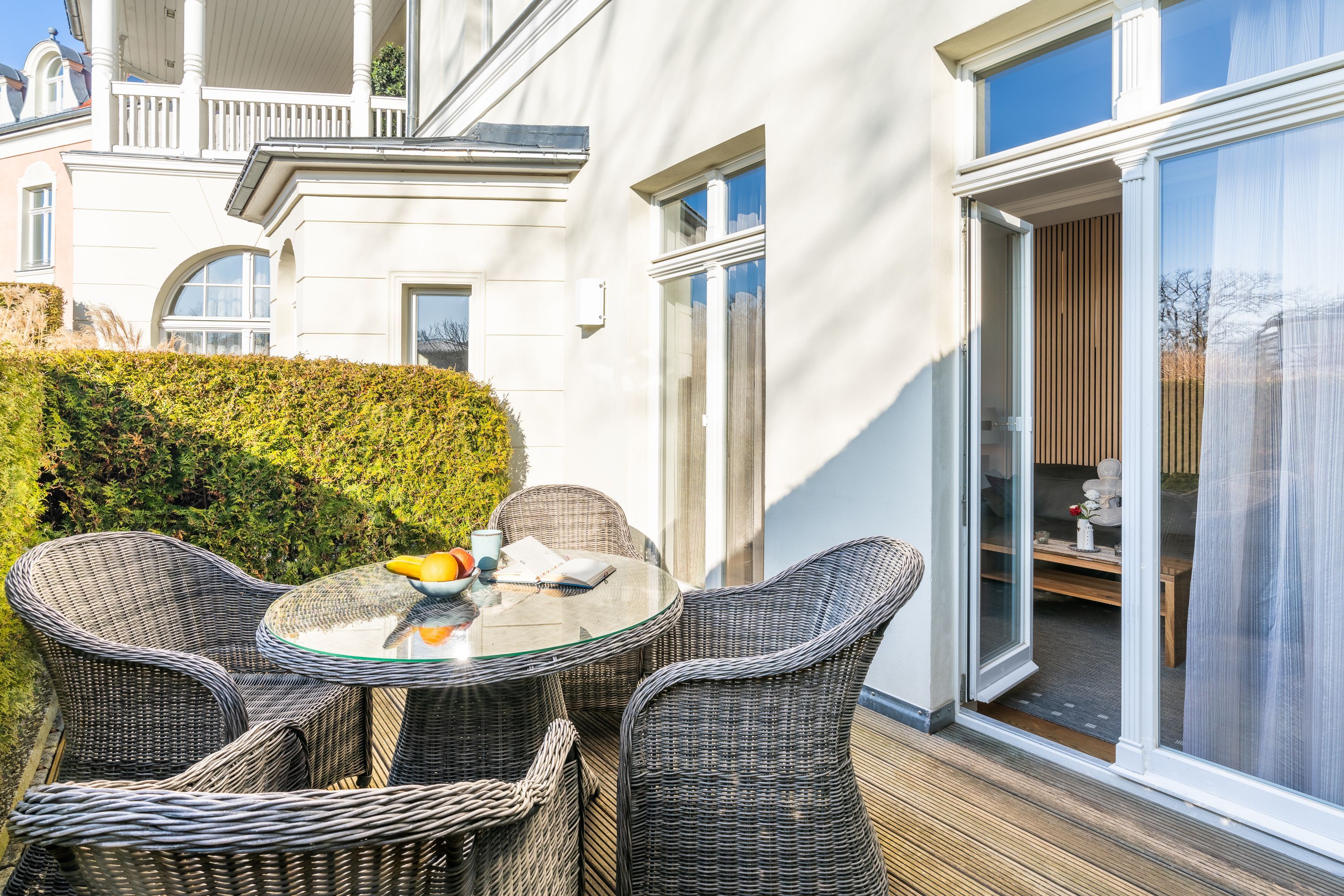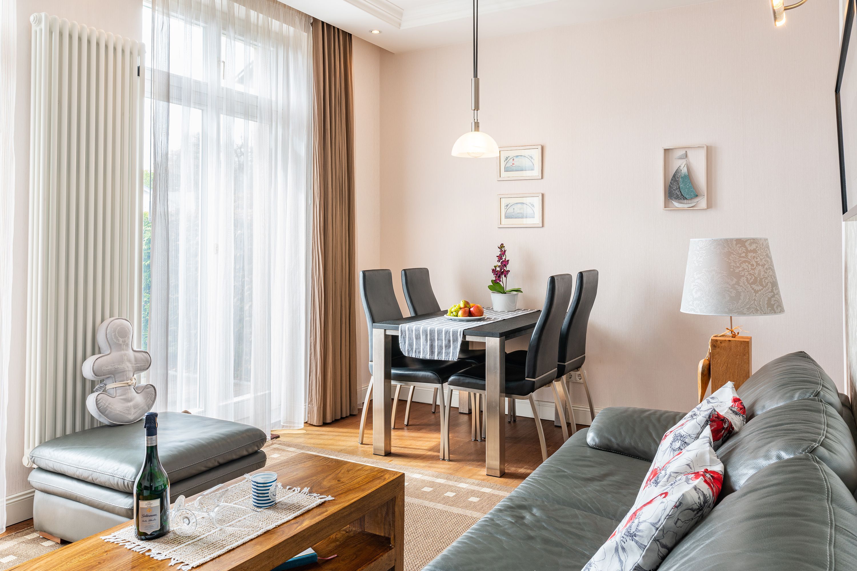 Gebührend verbringen Sie mit bis zu vier Personen diesen auf 55 Quadratmetern im Erdgeschoss der Villa Gruner, im geschmackvoll eingerichteten 3-Zimmer-Appartement mit traumhafter Südterrasse. Der liebevoll eingerichtete Wohnbereich verfügt neben einer Relaxmöglichkeit auf dem edlen Ledersofa, einem Esstisch für 4 Personen über eine optisch vom Wohnbereich abgetrennte edle Küchenzeile (Backofen, Kühlschrank, Geschirrspüler, Mikrowelle, Wasserkocher, Toaster, Kaffeemaschine). Für die romantischen Momente im Urlaub sorgt der im Wohnbereich integrierte Gaskamin.