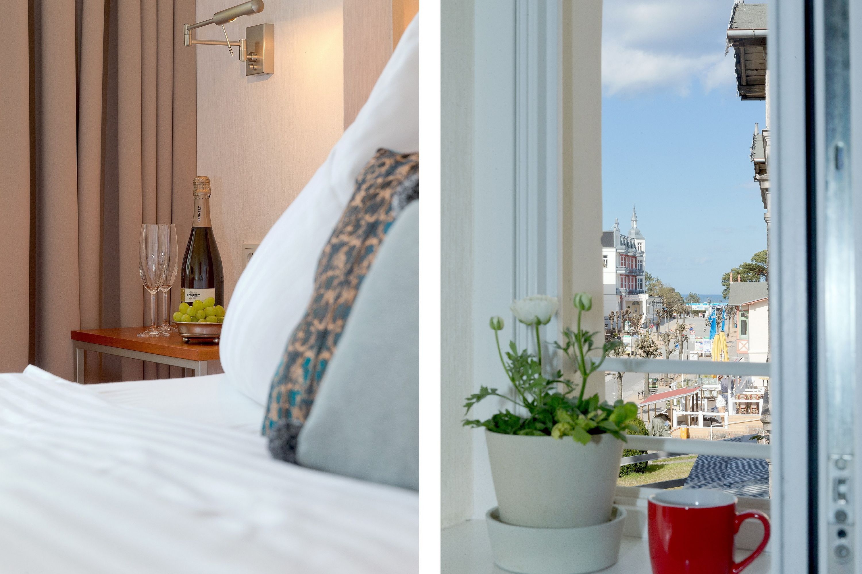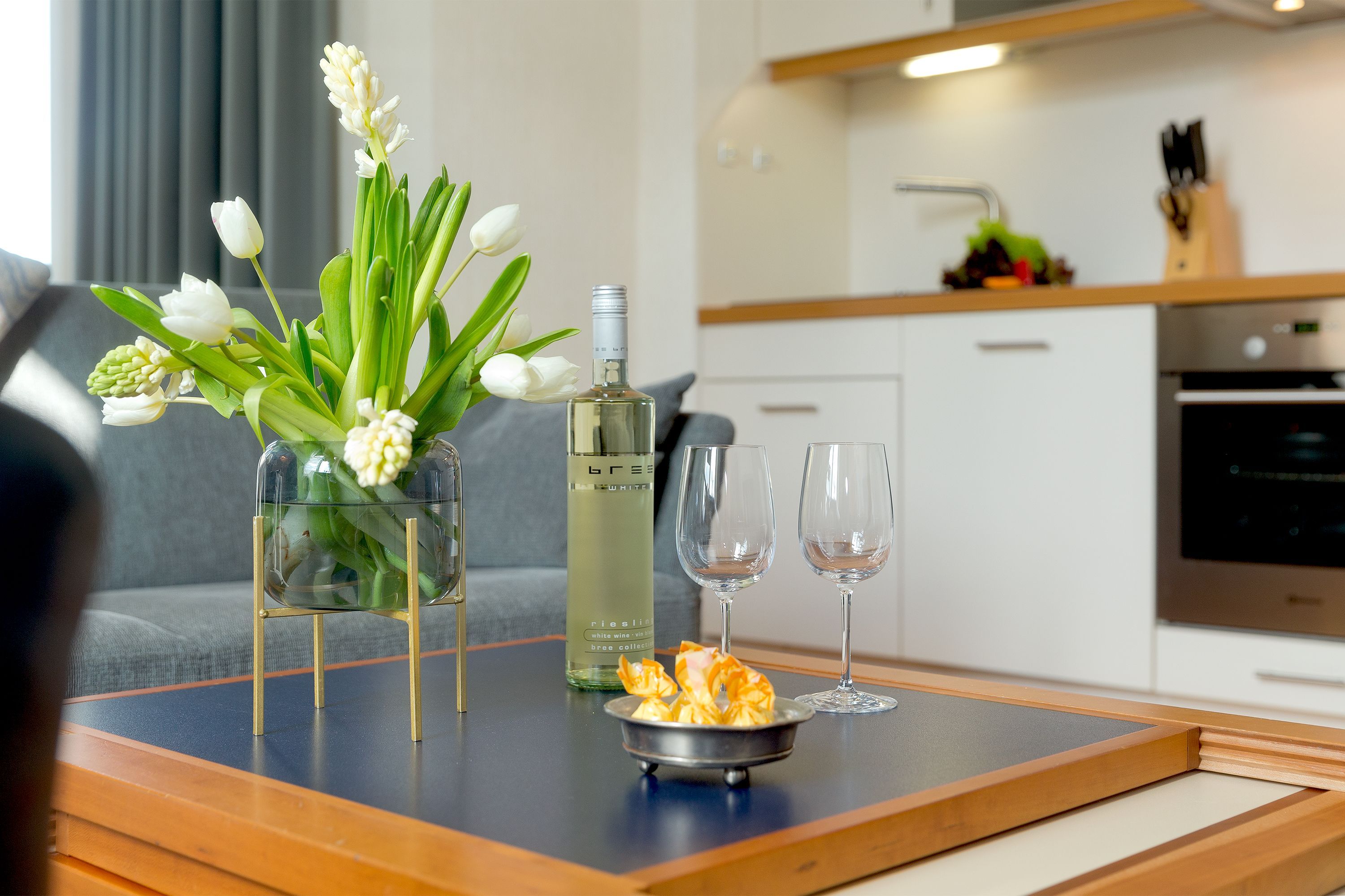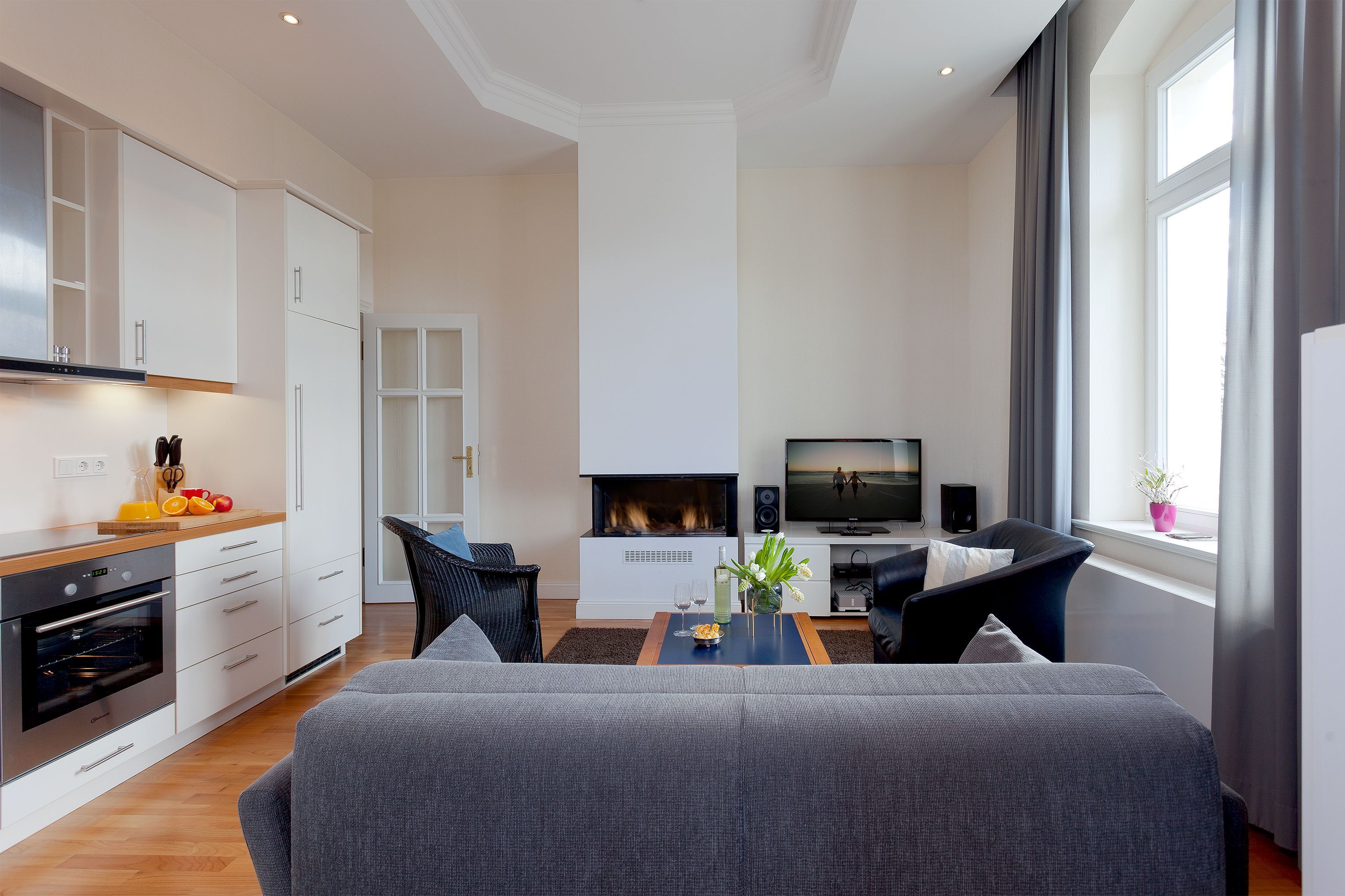 Im Wohnbereich lässt sich eine Couch im Handumdrehen zum Schlafgemach für die 5. und 6. Person verwandeln. Bei der Einrichtung des Appartements sind Mobiliar, Materialien und farbliche Akzente exakt aufeinander abgestimmt worden. Große Fenster sorgen für besondere Lichtspiele, insbesondere in dem am Wohnbereich angrenzend traumhaften Erker, der mit einem gemütlichen Esstisch aufwartet. Das kulinarische Menü bereiten Sie in der, mit allen Extras ausgestatteten, offenen Küche (Backofen, Kühlschrank mit Gefrierfach, Geschirrspüler, Mikrowelle, Wasserkocher, Toaster, Kaffeemaschine) zu. Gaskamin, Flat-TV (im Wohnbereich und in einem der Schlafzimmer) und ein WLAN-Anschluss komplettieren den Urlaubsgenuss.