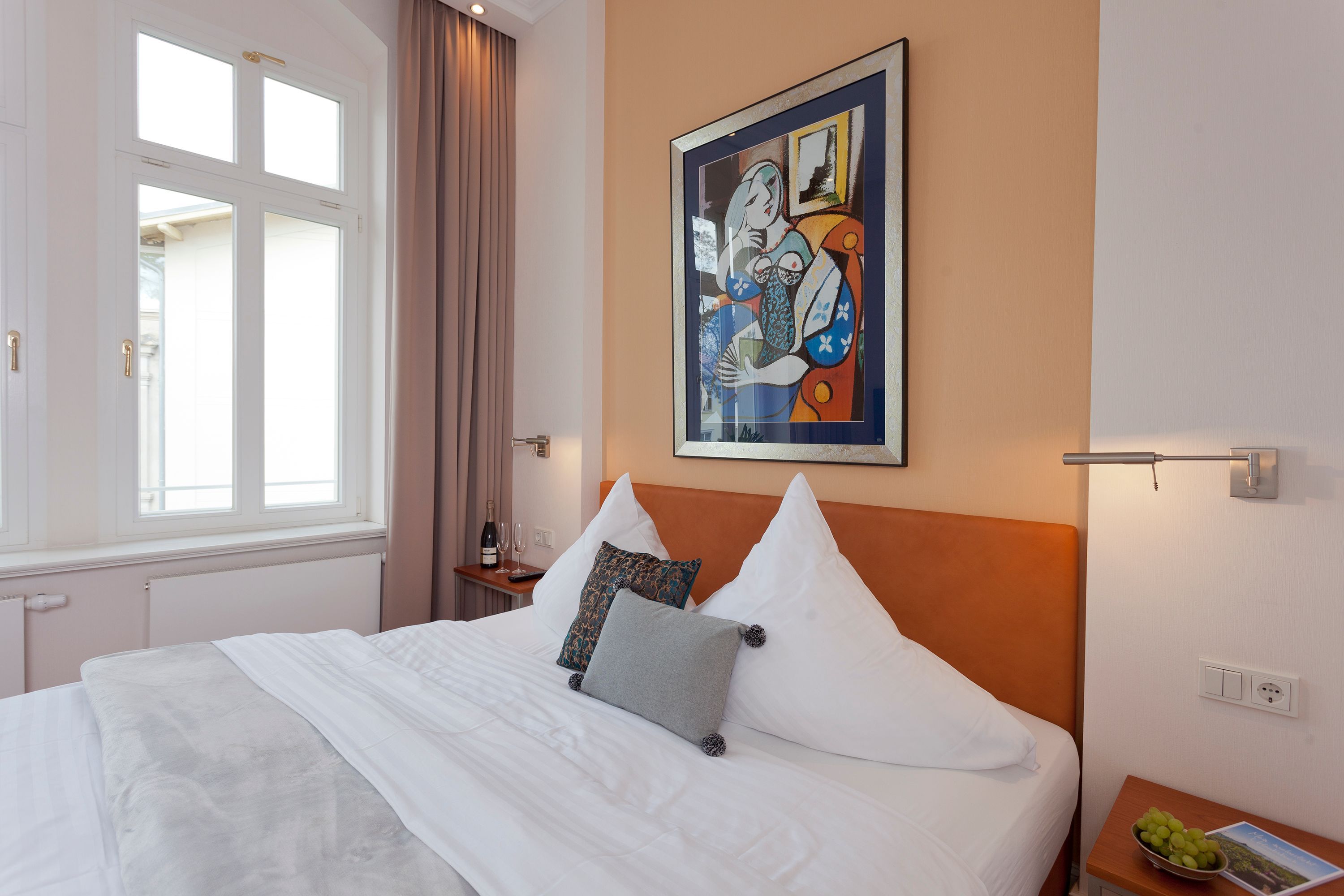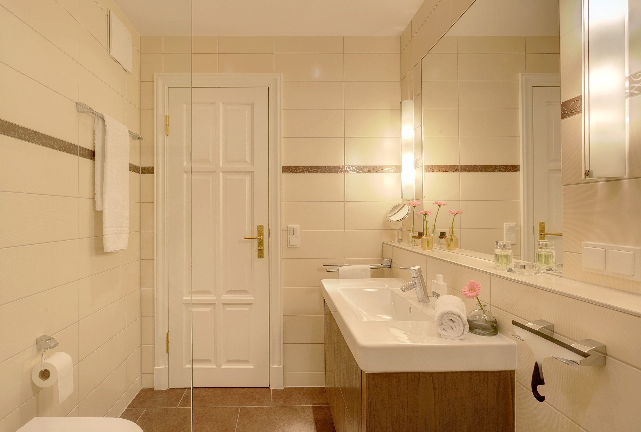 Das 3-Zimmer-Appartement liegt im 1. Obergeschoss der Villa Gruner und verfügt über einen kombinierten Wohn- Koch und Essbereich, zwei Schlafräume mit je einem Doppelbett (je 180 x 200cm / zwei getrennte Matratzen) und ein großzügiges Badezimmer mit ebenerdiger Echtglasdusche, WC und einem Haarfön.