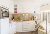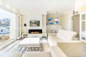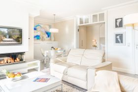 Der moderne Wohnbereich lädt mit einer Relaxcouch zum Verweilen vor dem Gaskamin oder dem Flat-TV ein. Die im Wohnraum integrierte Designerküche mit Kaffeevollautomat bietet jeglichen Komfort (Backofen, Kühlschrank mit Gefrierfach, Geschirrspüler, Wasserkocher, Toaster), den sich ein Kochliebhaber wünschen kann. Das Schlafzimmer ist mit einem komfortablen XXL-Boxspringbett (200 x 200cm / zwei getrennte Matratzen) ausgestattet.