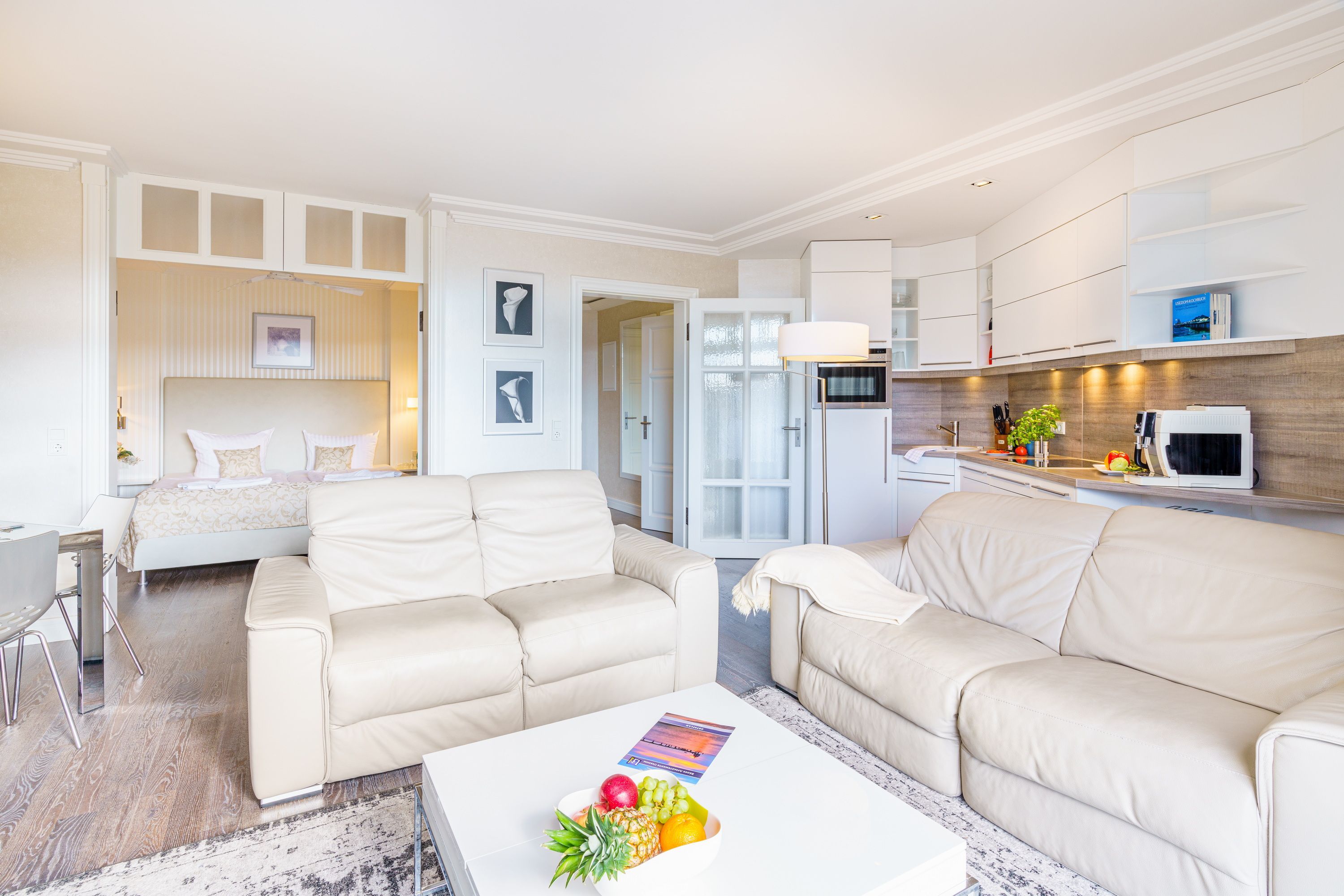 Das luxuriöse 2-Raum-Appartement mit einer Größe von 53 Quadratmetern im 1.Obergeschoss der Villa Gruner ist das perfekte Urlaubsdomizil für Paare oder Freunde. Dank der großen Fenster-Schiebetüren (mit zusätzlich integriertem Insektenschutz) wirkt das Wohnzimmer beim Öffnen dieser wie ein großzügig überdachter Balkon.