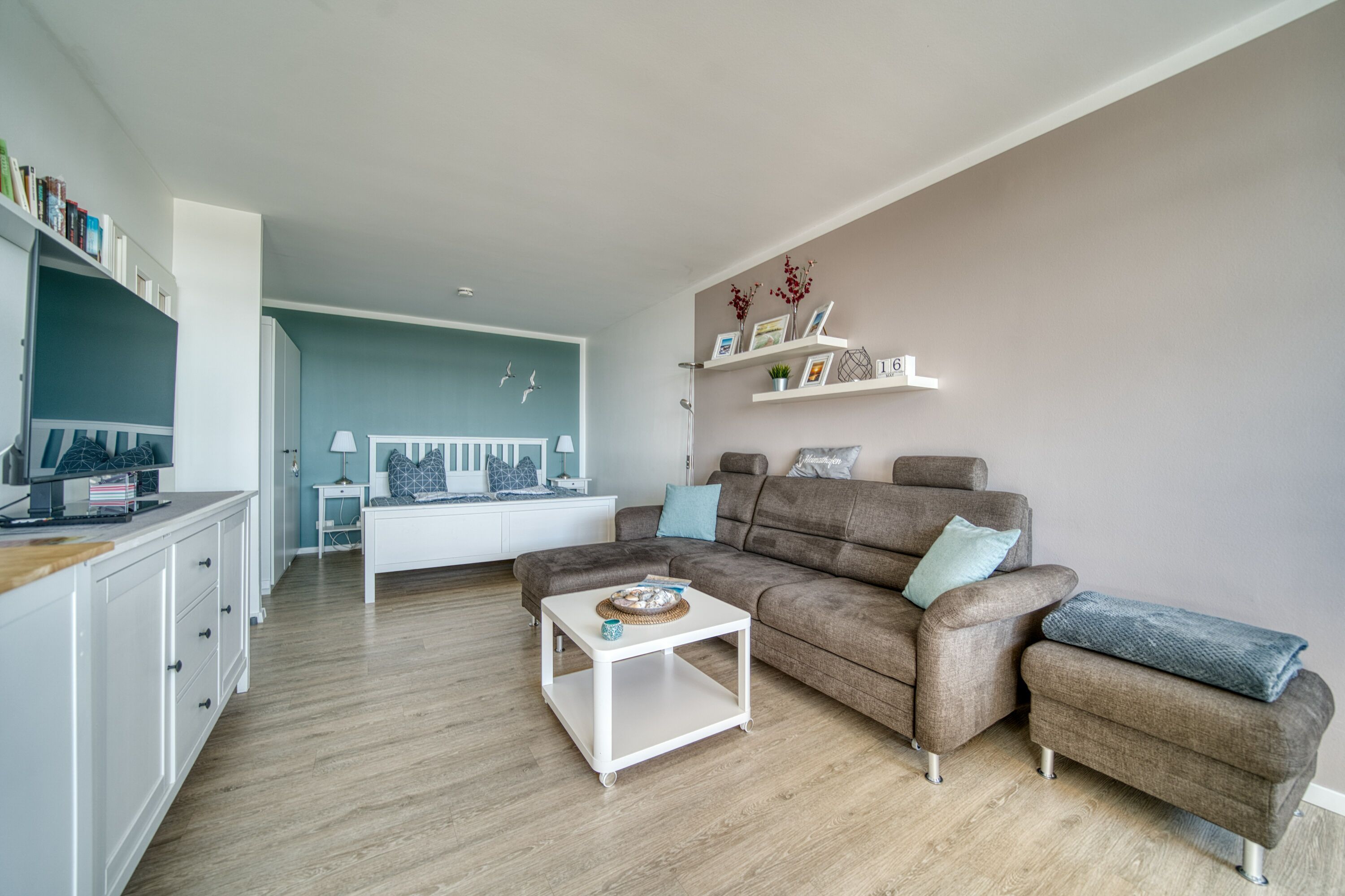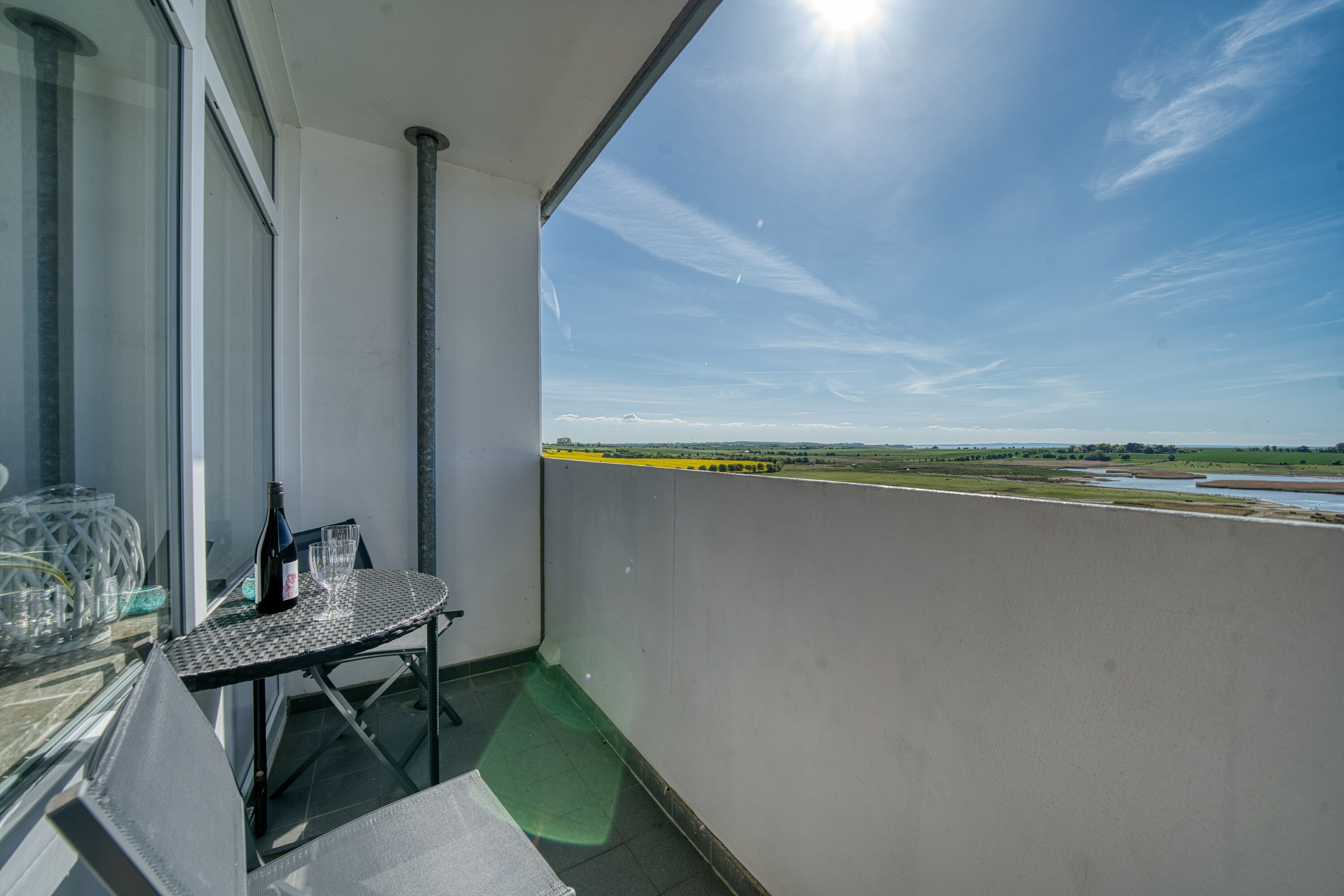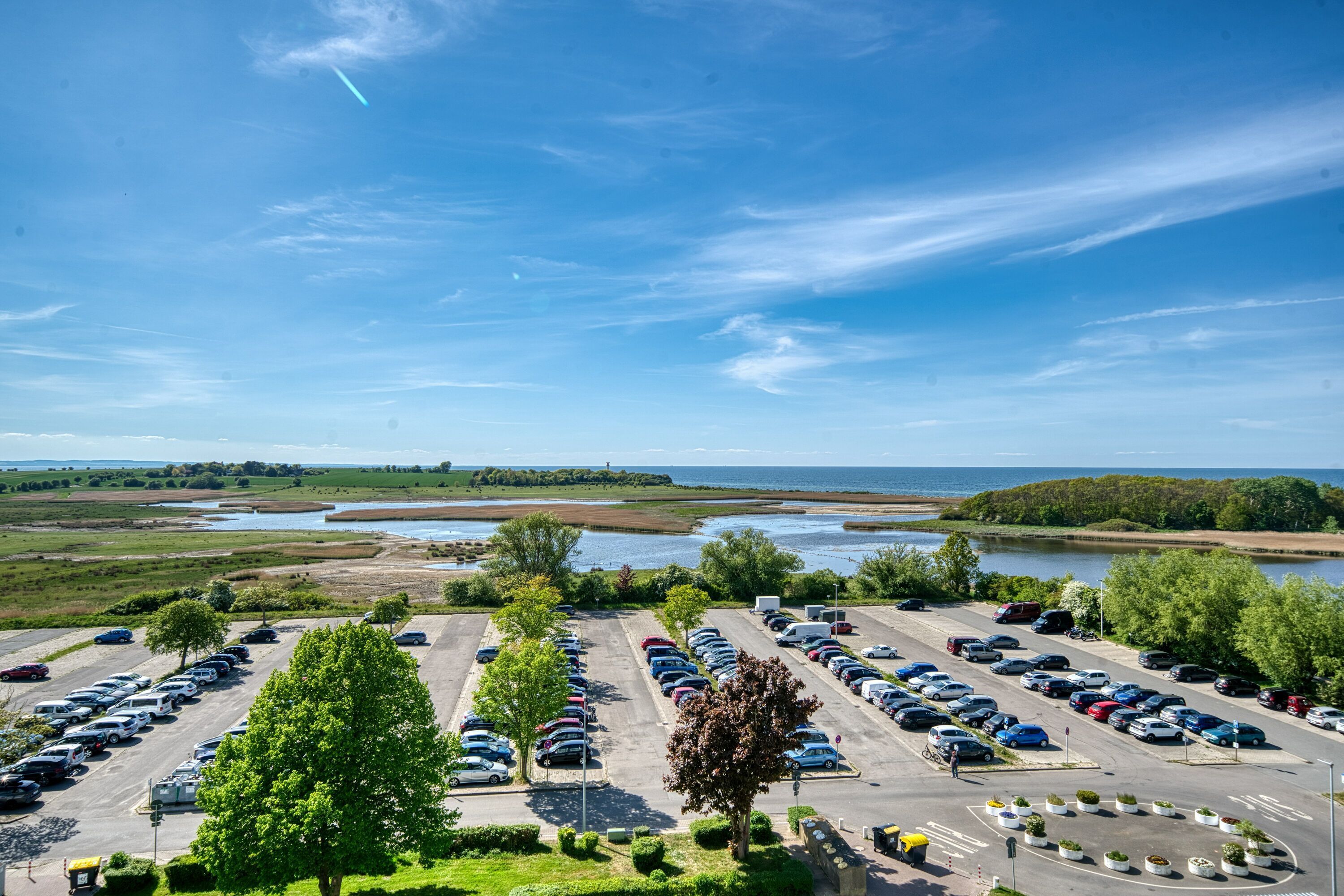Diese liebevoll eingerichtete 1,5-Zimmer-Wohnung liegt im Haus E des Ferienparks, in der 7. Etage, mit einem Balkon zur Westseite, welcher einen herrlichen Blick auf die Ostsee bietet.