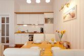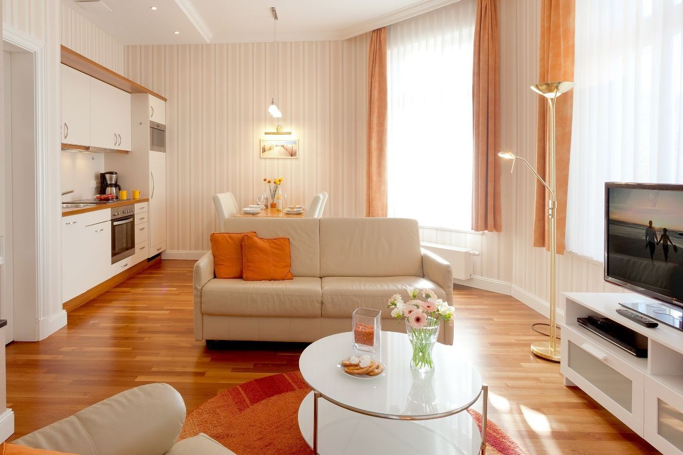Das Interieur des Wohn- und Kochbereichs ist modern und gemütlich zugleich. Lassen Sie die Seele baumeln: Auf dem Sofa können Sie Ihre Lieblingsserie verfolgen. Für die Nachtruhe aber auch für ein Schlummerstündchen zwischendurch lässt sich die Couch bequem als Schlafstätte umfunktionieren. Somit können in dem Appartement bis zu vier Personen ihren wohlverdienten Urlaub verbringen.