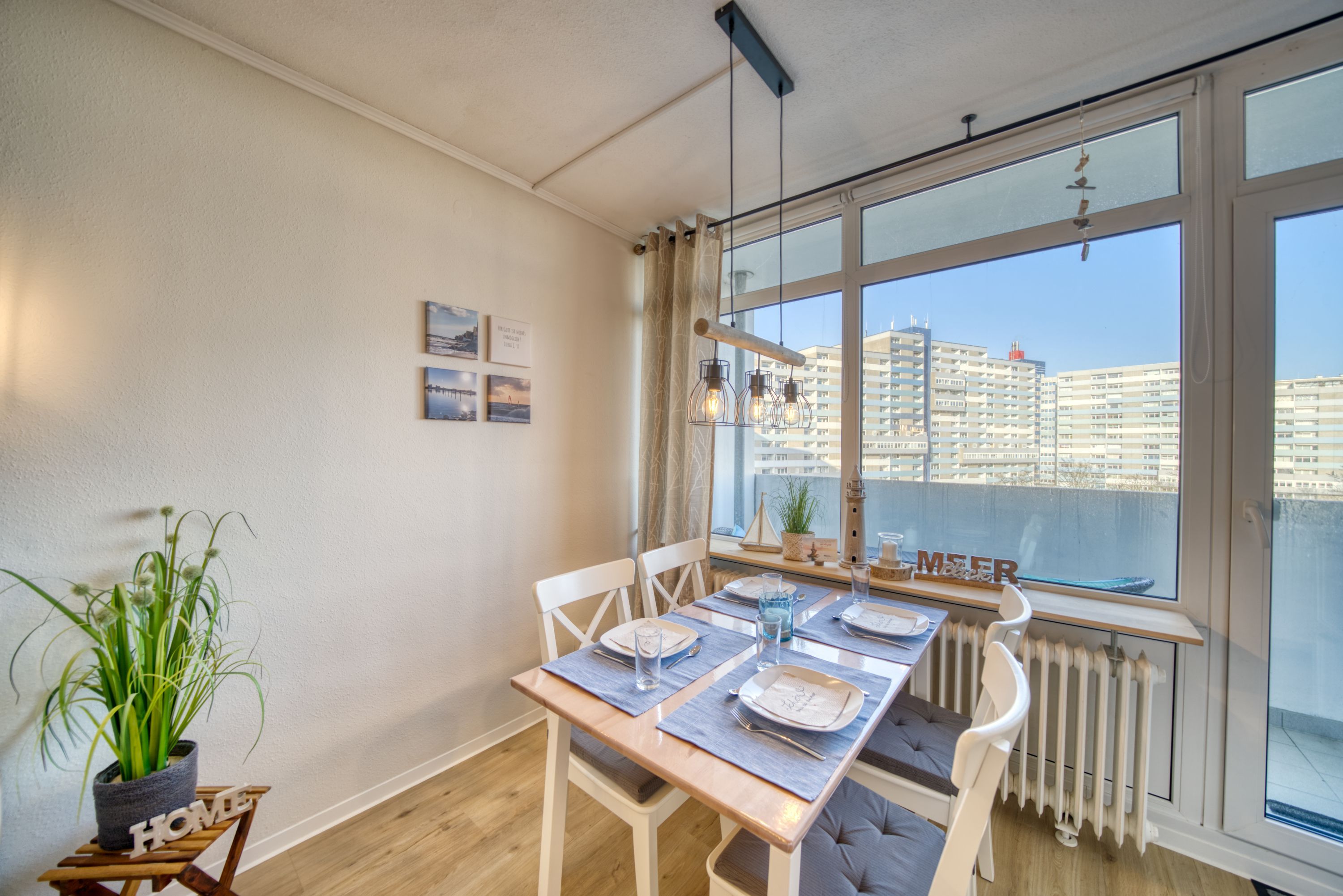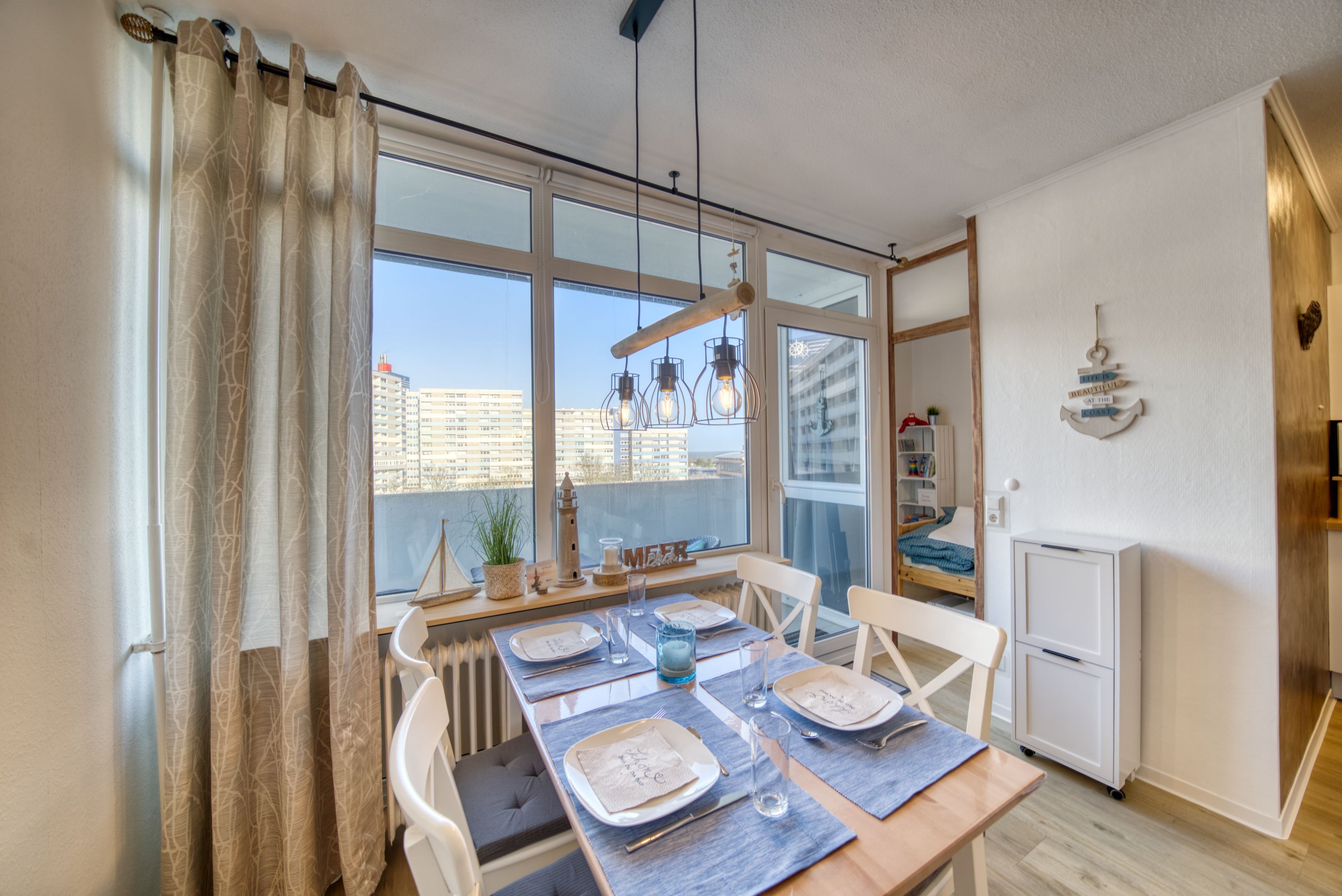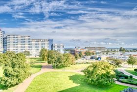 Die liebevoll eingerichtete Ferienwohnung liegt im Haus N im Ferienpark in der 5. Etage, mit Balkon zum Innenhof, der einen schönen Blick auf die Grünanlagen und die Ostsee Richtung Fehmarn bietet.