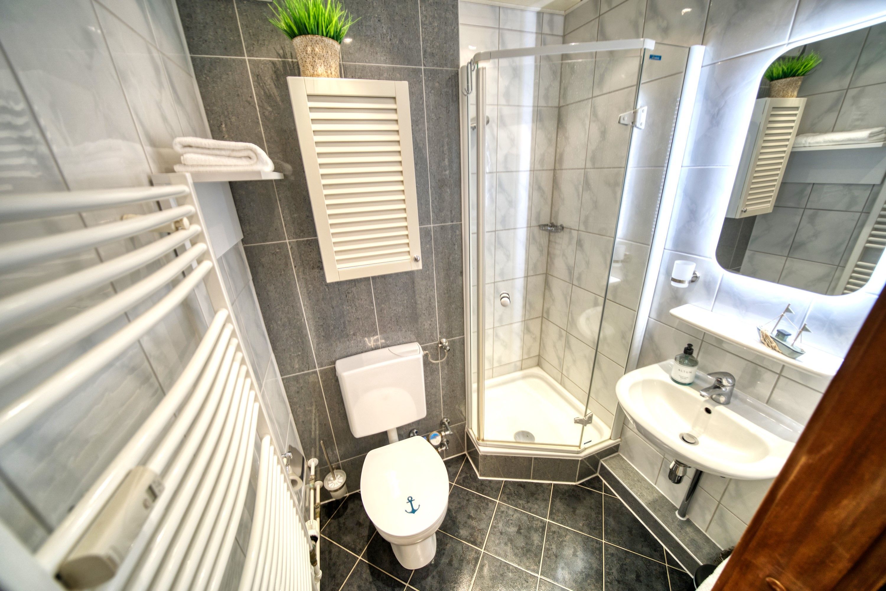 - Bad mit WC, Duschkabine und Waschbecken