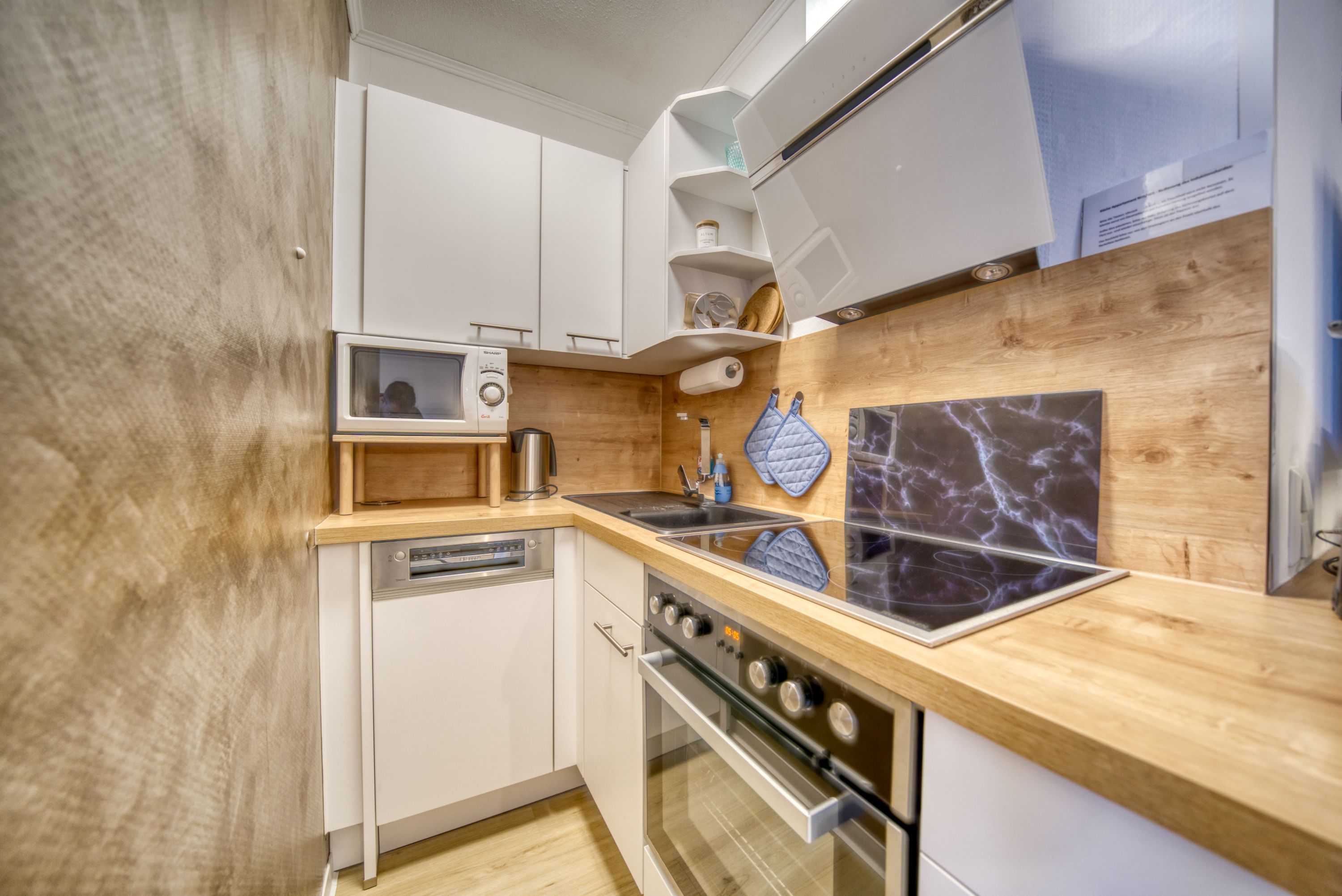 - komplett ausgestattete Küchenzeile mit Induktionskochfeld, sowie Geschirrspüler + Backofen