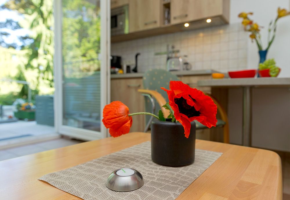 Das Zwei-Zimmer-Appartement befindet sich ebenerdig und bietet mit seinen 40 Quadratmetern ausreichend Platz für einen erholsamen Urlaub zu zweit oder auch zu dritt. Der Wohnbereich verfügt über eine integrierte moderne Küchenzeile (inkl. Geschirrspüler, Induktionskochfeld (2Felder), Mikrowelle mit Grillfunktion, Kühlschrank mit Gefrierfach, Wasserkocher, Toaster, Kaffeemaschine und Eierkocher) mit Esstisch für drei Personen sowie über ein gemütliches Sofa, auf dem Sie nach einem erholsamen Urlaubstag die Seele baumeln lassen können. Ein moderner FlatTV macht es möglich, dass Sie auch im Urlaub auf keine Ihrer Lieblingsserien verzichten müssen.