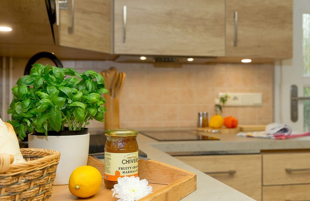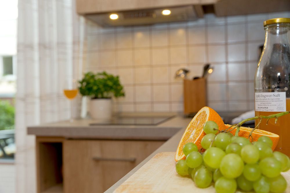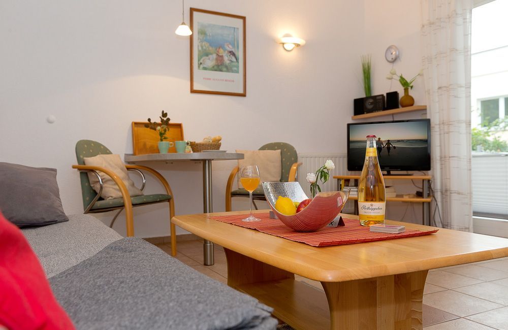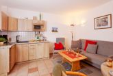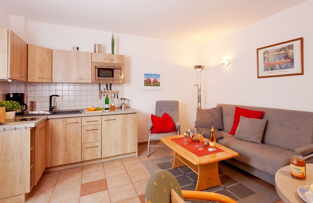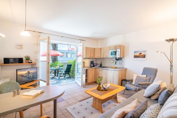 Das Zwei-Zimmer-Appartement befindet sich ebenerdig und bietet mit seinen 40 Quadratmetern ausreichend Platz für einen erholsamen Urlaub zu zweit oder auch zu dritt. Der Wohnbereich verfügt über eine integrierte moderne Küchenzeile (inkl. Geschirrspüler, Induktionskochfeld, Mikrowelle m. Grillfunktion, Kühlschrank mit Gefrierfach, Wasserkocher, Toaster, Kaffeemaschine und Eierkocher) mit Esstisch für drei Personen sowie über ein gemütliches Sofa, auf dem Sie nach einem erholsamen Urlaubstag die Seele baumeln lassen können. Ein moderner Flat TV macht es möglich, dass Sie auch im Urlaub auf keine Ihrer Lieblingsserien verzichten müssen.