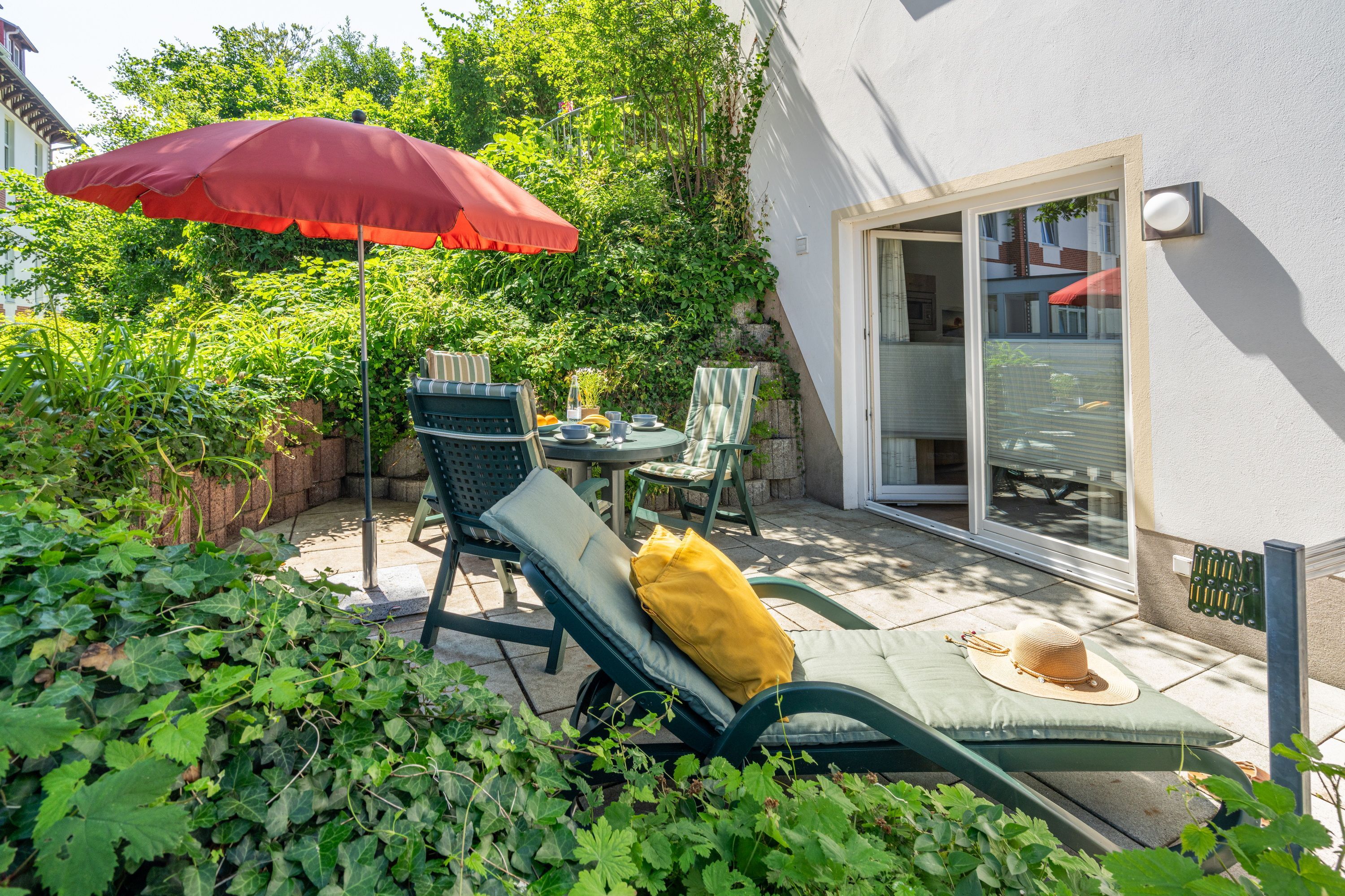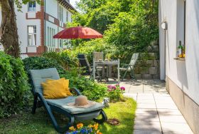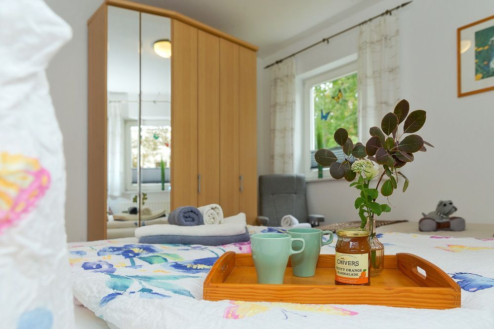 Vom Wohnzimmer erreichen Sie Ihre private Süd-Ost-Terrasse, die zum Sonnenbaden oder zur abendlichen Spielrunde mit Blick in den Garten einlädt. Grill-Liebhaber kommen ebenfalls auf Ihre Kosten, denn auf der Terrasse ist das Grillen im Grünen selbstverständlich gestattet. Das freundlich eingerichtete Schlafzimmer ist mit einem bequemen Doppelbett (180 x 200cm / zwei getrennte Matratzen) und Plissees an den Fenstern zum Abdunkeln ausgestattet.