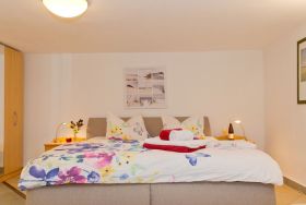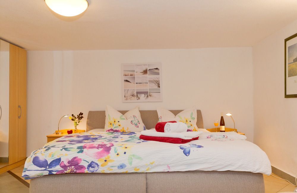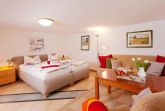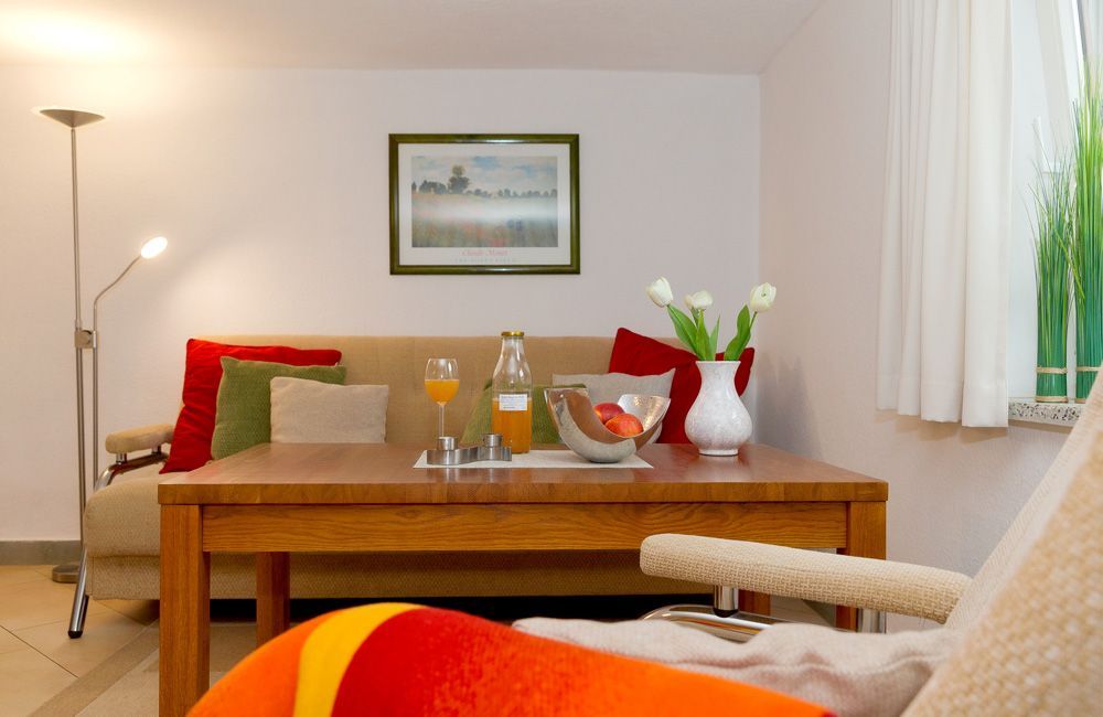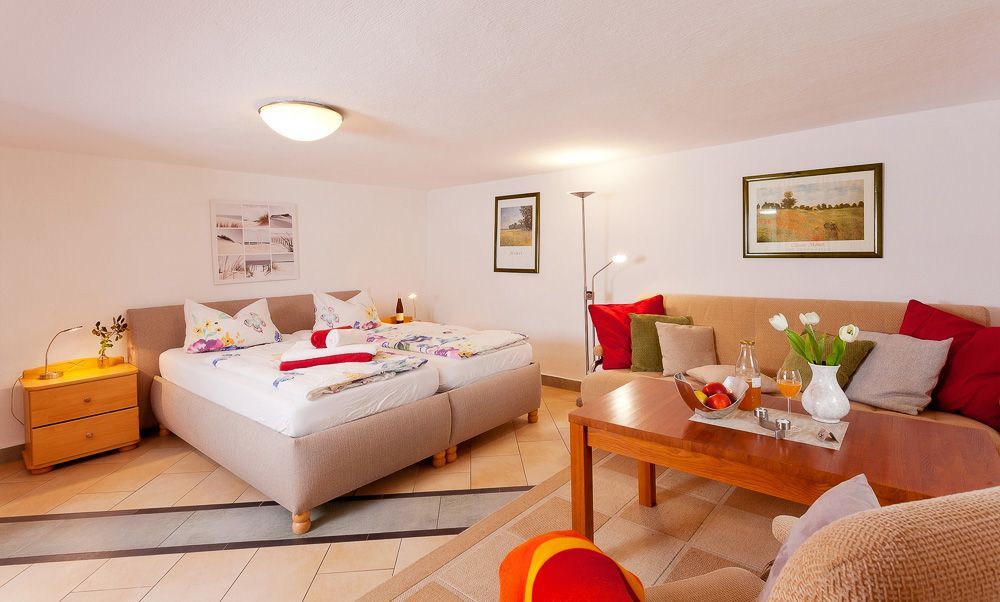 Das Zwei-Zimmer-Appartement befindet sich im Souterrain des vorderen Hauses und bietet mit seiner 35 Quadratmeter großen Wohnfläche ausreichend Platz für einen erholsamen Urlaub zu zweit. Warme mediterrane Farben schaffen in Wohn- und Schlafzimmer eine angenehme und gemütliche Atmosphäre. Der Wohnraum ist mit bequemen Polstermöbeln ausgestattet, die nach einem anstrengenden Tag zum Entspannen einladen. Ein moderner Flat-TV macht es möglich, dass Sie auch im Urlaub auf keine Ihrer Lieblingsserien verzichten müssen. Das gemütliche Doppelbett (180 x 200cm / zwei getrennte Matratzen) lockt für die Nachtruhe, aber auch für ein Schlummerstündchen am Nachmittag.