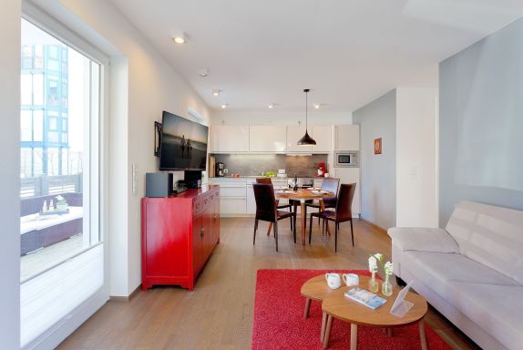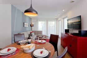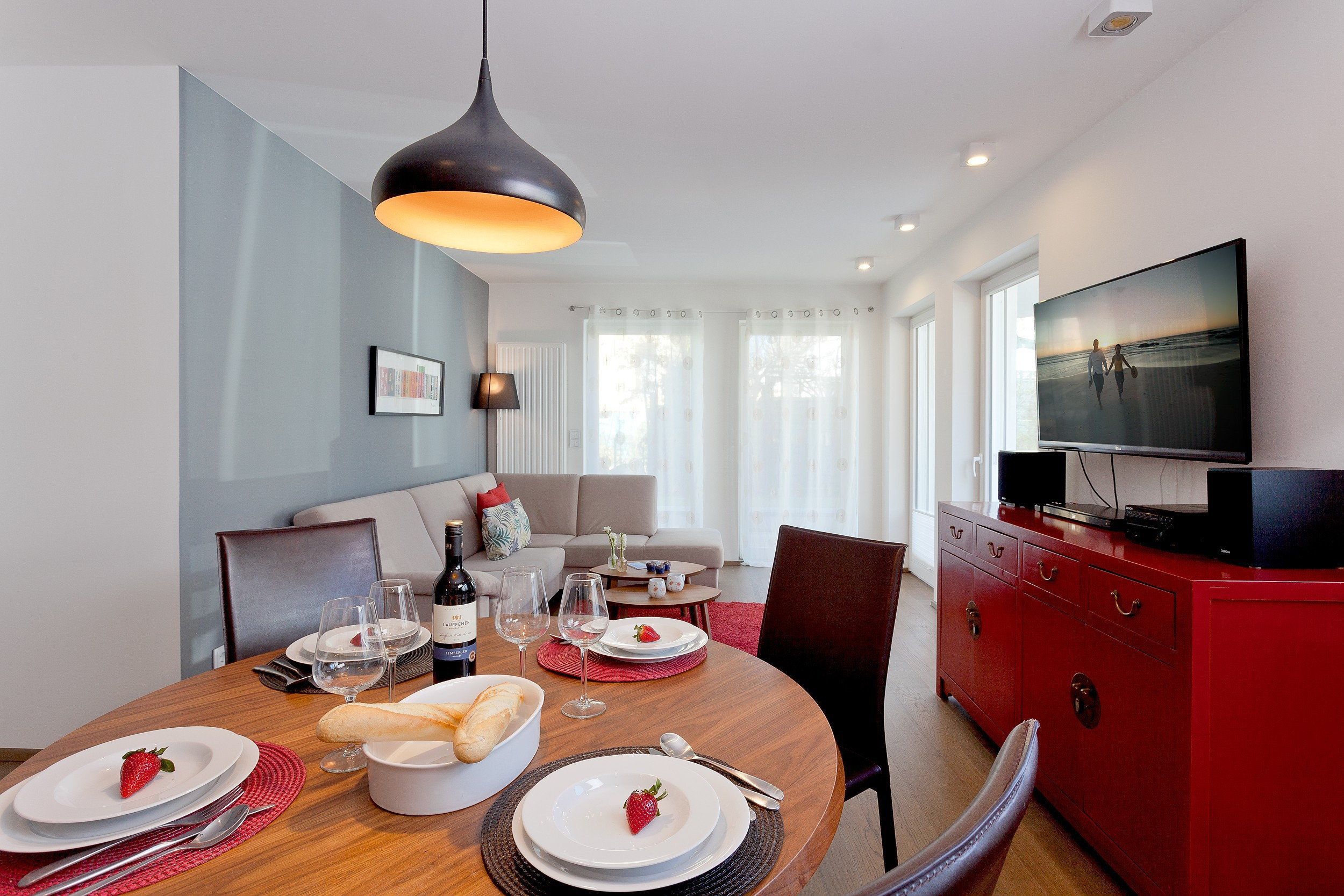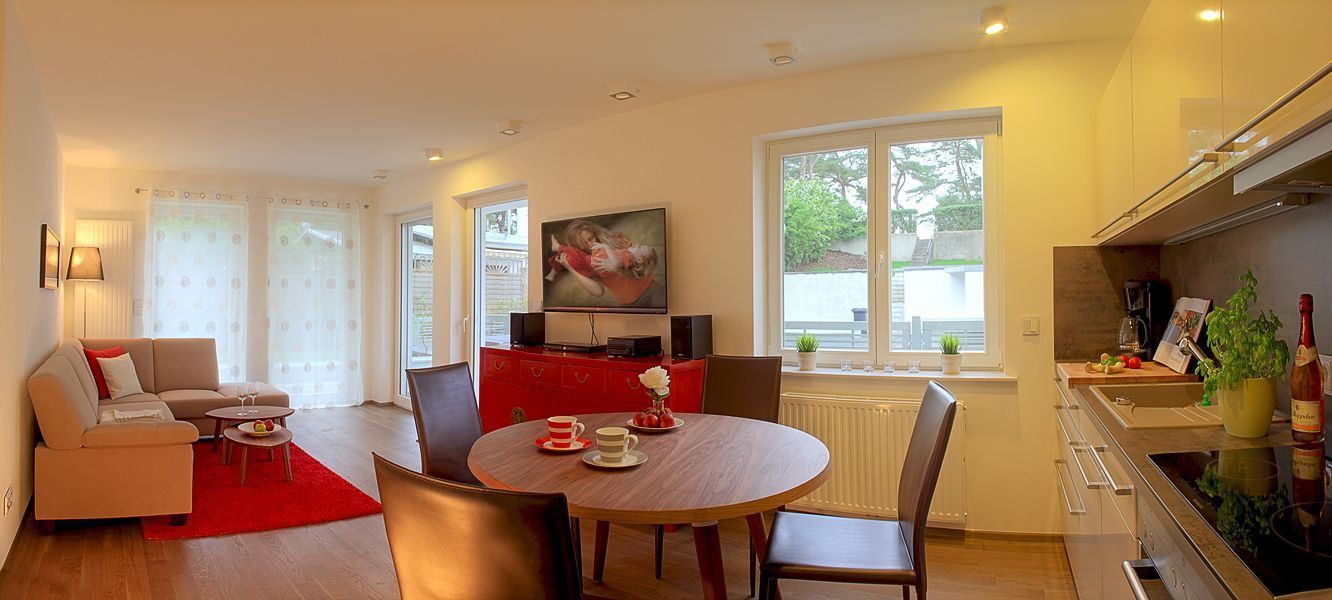 Das 3-Raum-Appartement befindet sich im Erdgeschoss, hat eine Größe von 66 Quadratmetern und ist für 4 Personen das ideale Urlaubsdomizil an der wunderschönen Ostseeküste. Das liebevoll eingerichtete Wohnzimmer überzeugt mit gemütlichem Ecksofa, Flachbild TV, DVD Player, Soundsystem sowie einer mit allen Extras ausgestatteten Einbauküche. Bodentiefe Fenster geben dem Wohnzimmer eine lichtdurchflutete Atmosphäre. Die vom Wohnzimmer angrenzende Nordost-Privatterrasse mit Loungeecke und Essbereich bietet ein harmonisches Urlaubserlebnis. Separat sind die beiden Schlafräume mit komfortablem Boxspringbett (160 x 200cm / 180 x 200cm / jeweils zwei getrennte Matratzen) und das Badezimmer mit ebenerdiger Echtglas-Dusche, XXL-Waschtisch, WC und einem Haarfön.