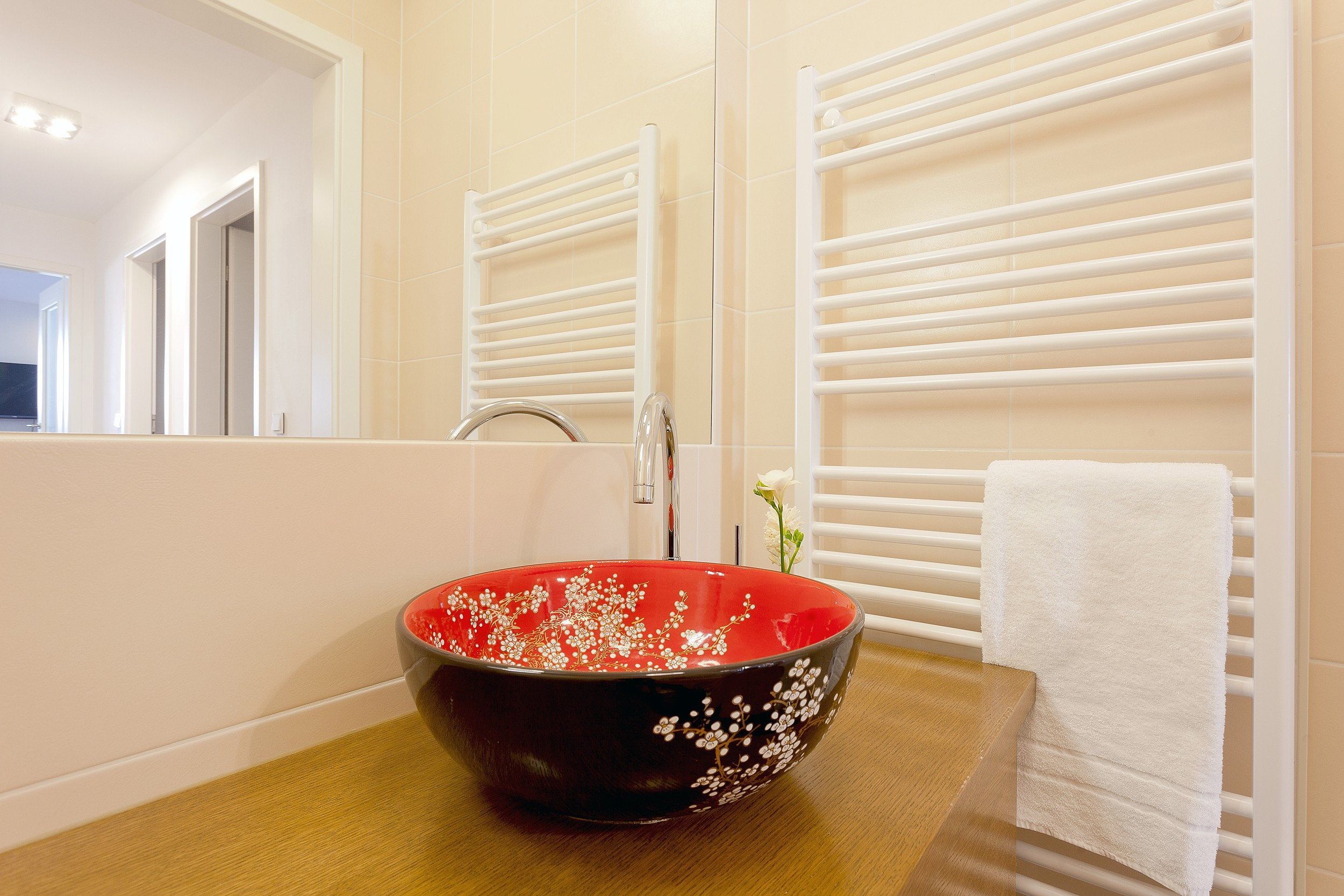 Inspiriert von einer langen Fernostreise vereint das Appartement B 0.2 modernste Einrichtungselemente mit asiatischen Accessoires in zarten Pastell-, Rot- und Schwarztönen.
