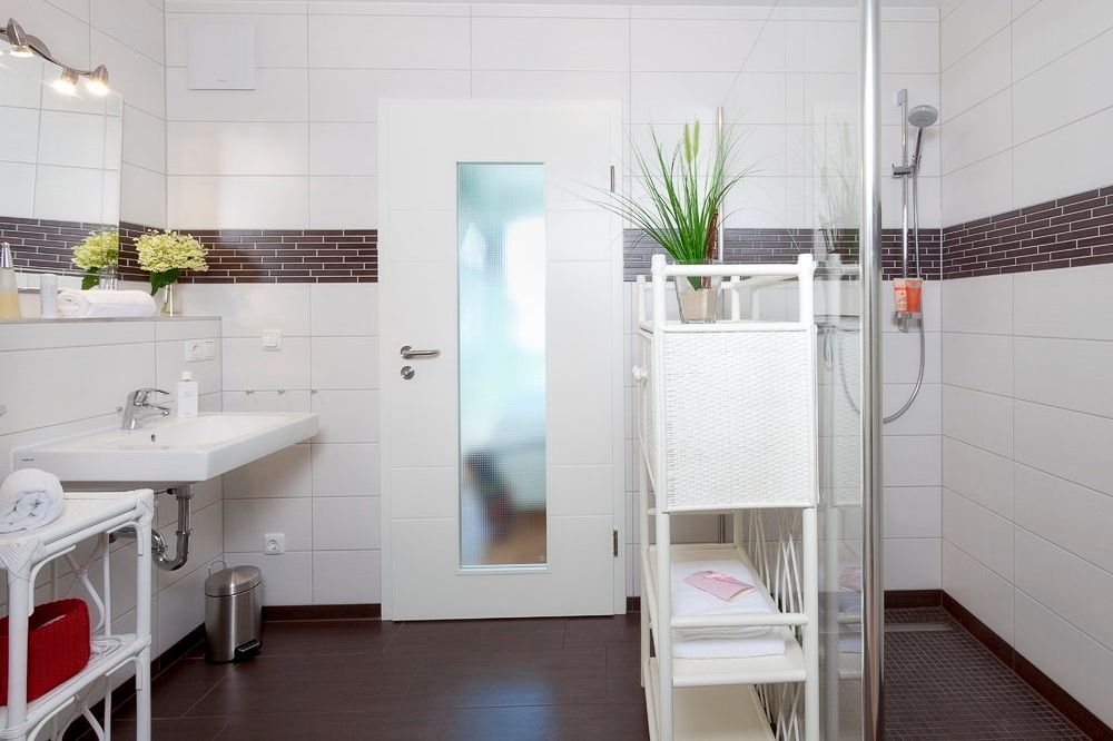 Damit Sie Ihre wohlverdiente Urlaubszeit bereits am Anreisetag in vollen Zügen genießen können, haben wir das Bett für Sie und das für Ihre lieben Mitreisenden bereits bezogen und ein Duschtuch sowie ein kleines Handtuch bereitgelegt. Das Bad en Suite, welches sowohl Zugang vom Schlafzimmer als auch vom Flur hat, spricht besonders wegen des großen ebenerdigen Duschbereiches an. Auch ein WC sowie ein Haarfön stehen mit zur Verfügung.
