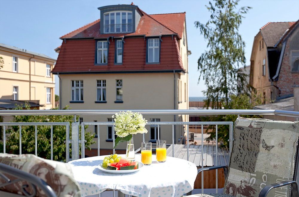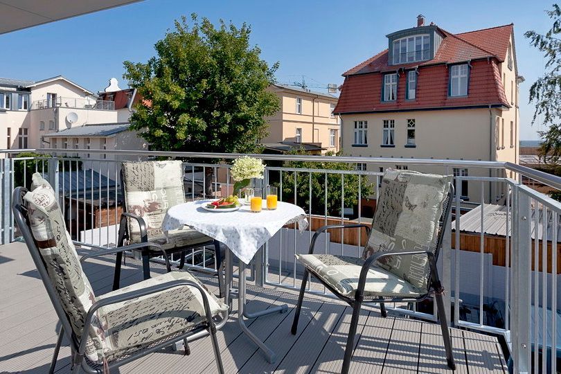 Der Winkelbalkon mit nordöstlicher Ausrichtung hebt sich durch seine Größe mit Relaxliegen und Esstisch einladend hervor. Das Meer ist spätestens dann zum Greifen Nah. Spüren Sie die frische Ostseeluft und lauschen Sie dem Klang der Wellen. Ein Stellplatz direkt am Haus, ein Fahrstuhl sowie ein persönlicher Fahrradabstellraum runden den Urlaubskomfort des Ostseedomizils ab. Ein WLAN Anschluss steht unseren Gästen kostenfrei zur Verfügung.