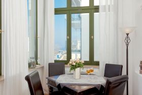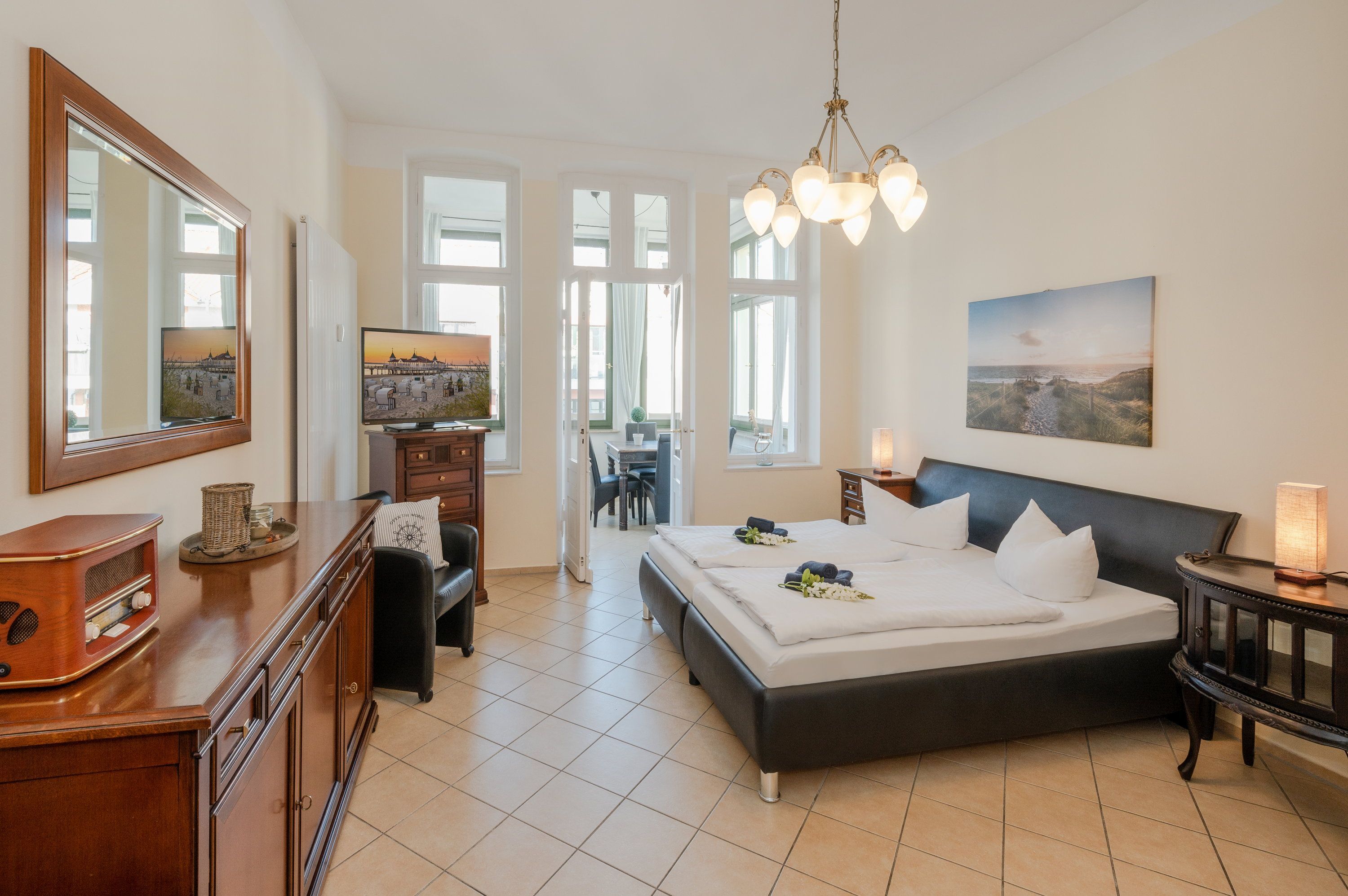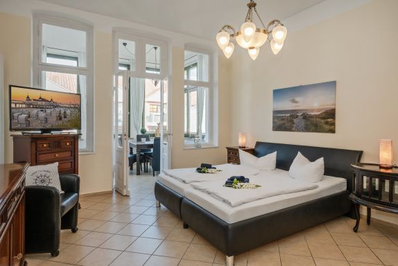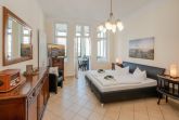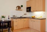 Das helle Ein-Zimmer-Appartement hat eine Wohnfläche von 38 Quadratmetern und befindet sich im 1. Obergeschoss der Villa Goodewind. Der kombinierte Wohn- und Schlafbereich ist in warmen Farben gehalten. Die angrenzende Küchenzeile ist mit allem bestückt, was Sie für die Zubereitung Ihrer Lieblingsspeisen benötigen. Neben zwei Cerankochfeldern und einem Kühlschrank mit Gefrierfach finden sich Geschirrspüler, Mikrowelle, Wasserkocher, Toaster und Kaffeemaschine. Das bequeme Doppelbett (200 x 200cm / zwei getrennte Matratzen) lädt nach einem erlebnisreichen Urlaubstag zu erholsamen Stunden ein.