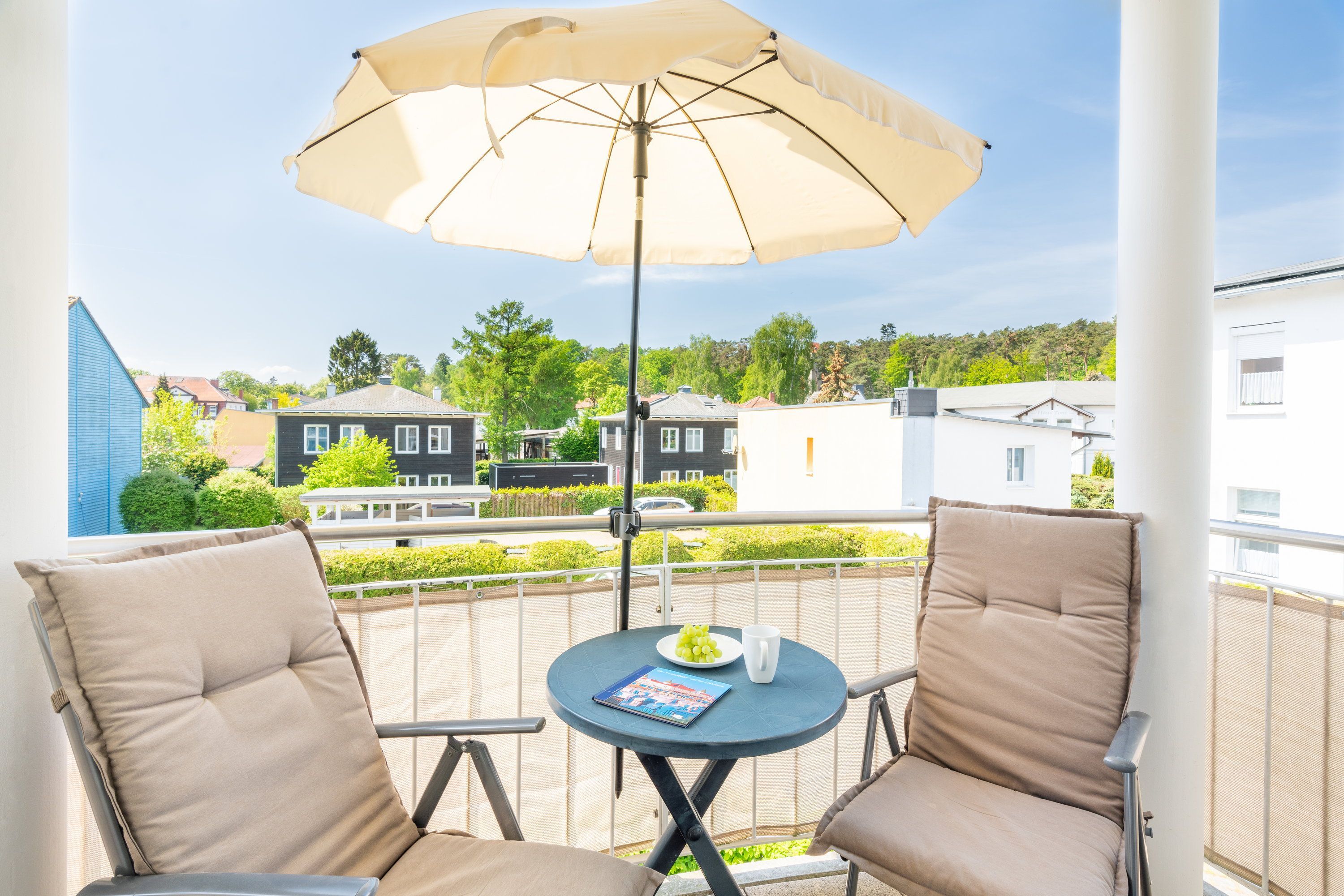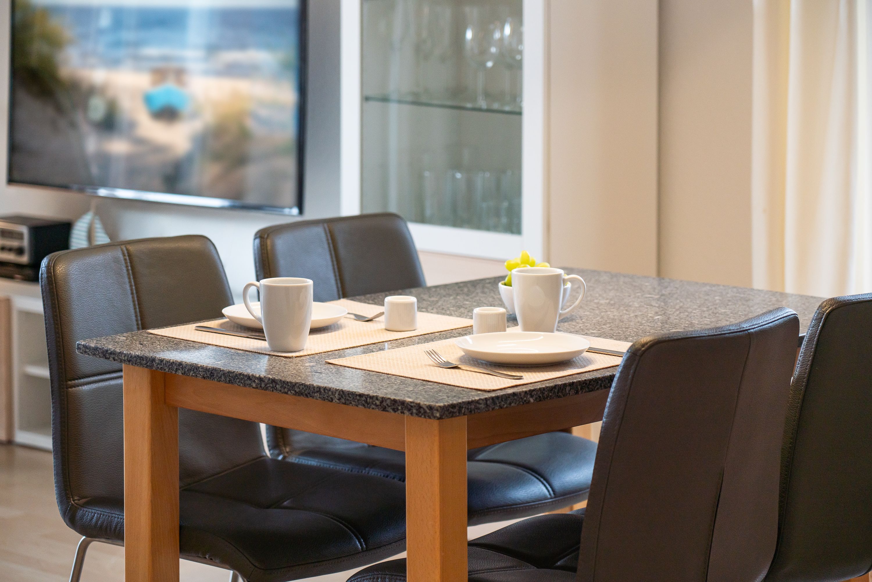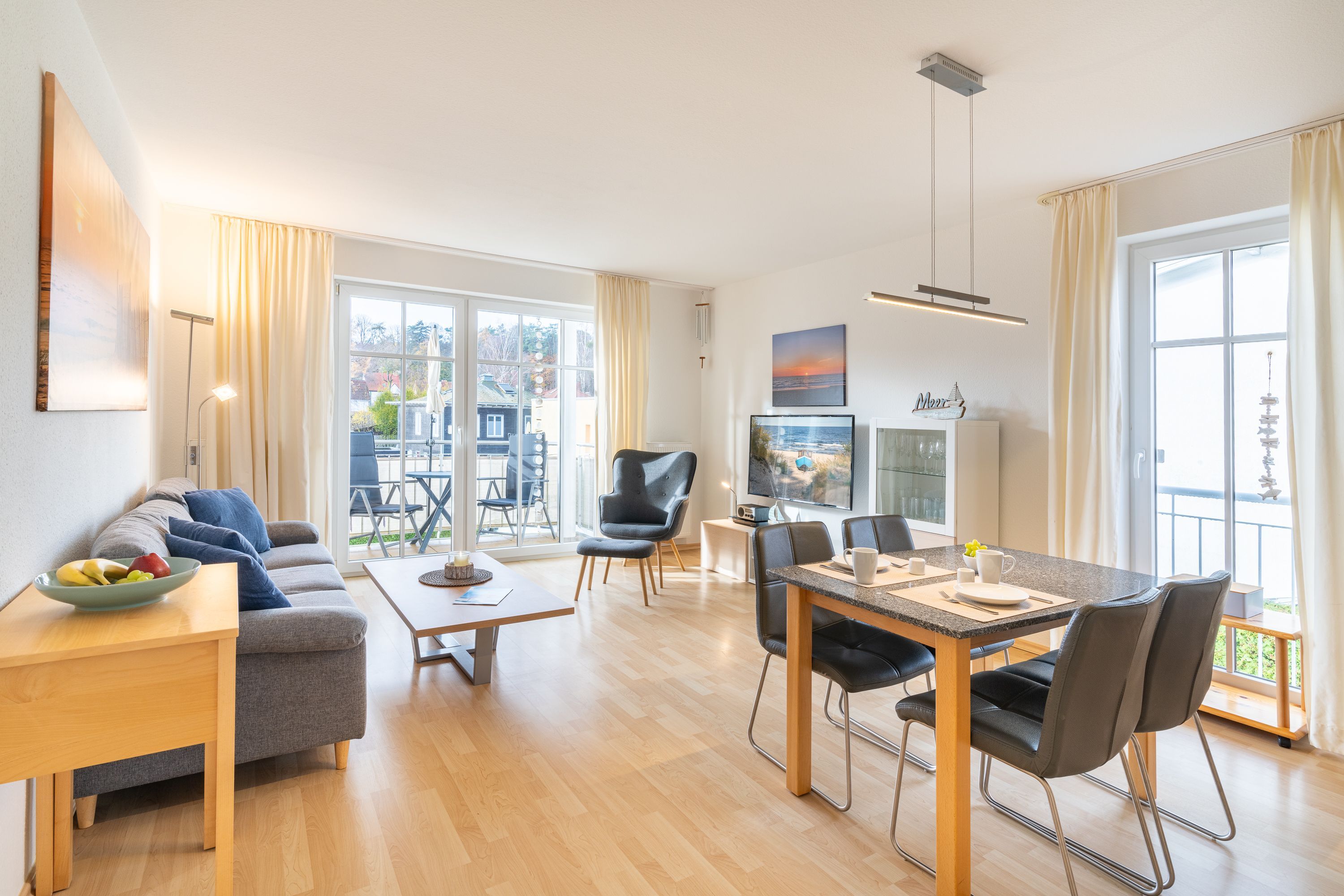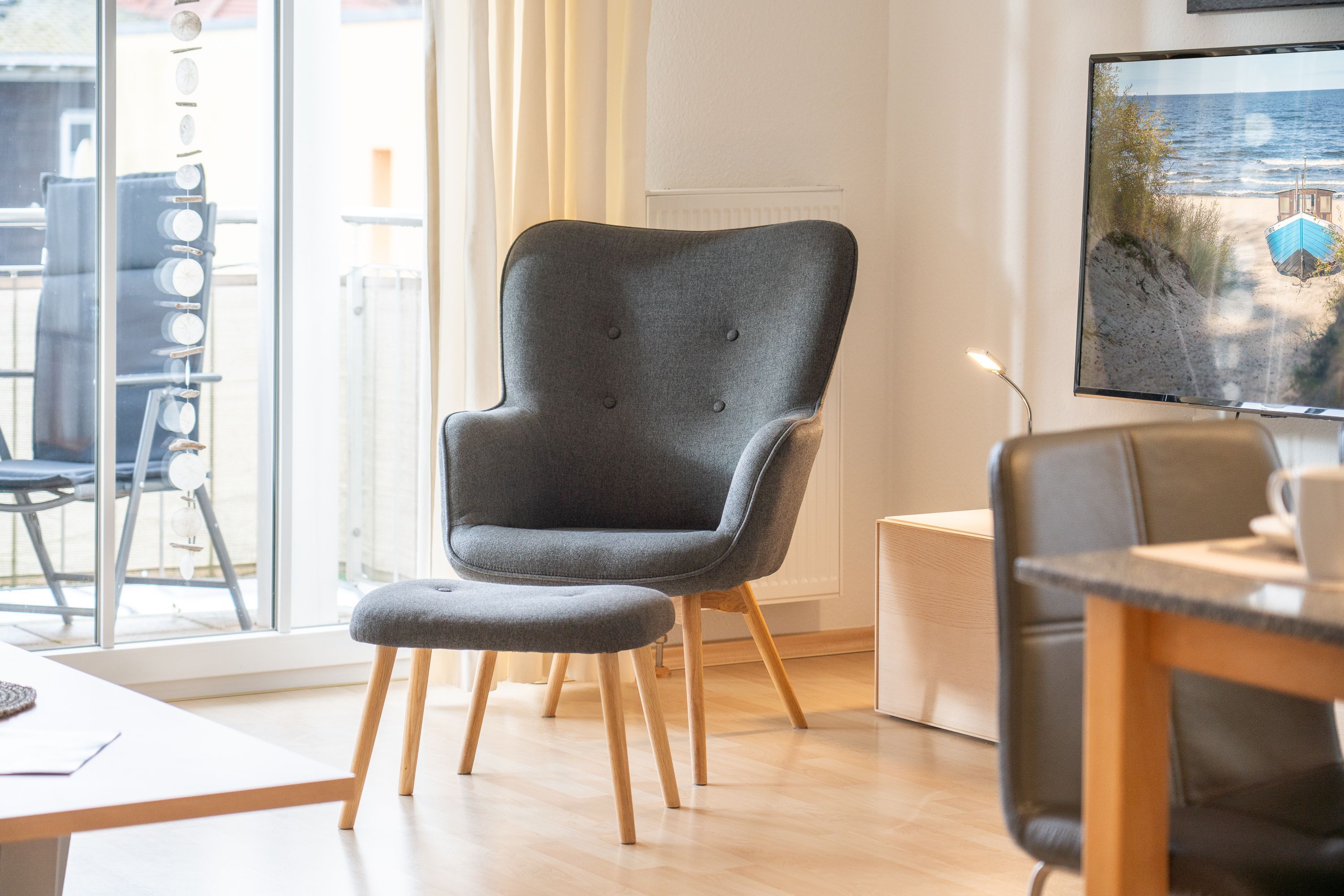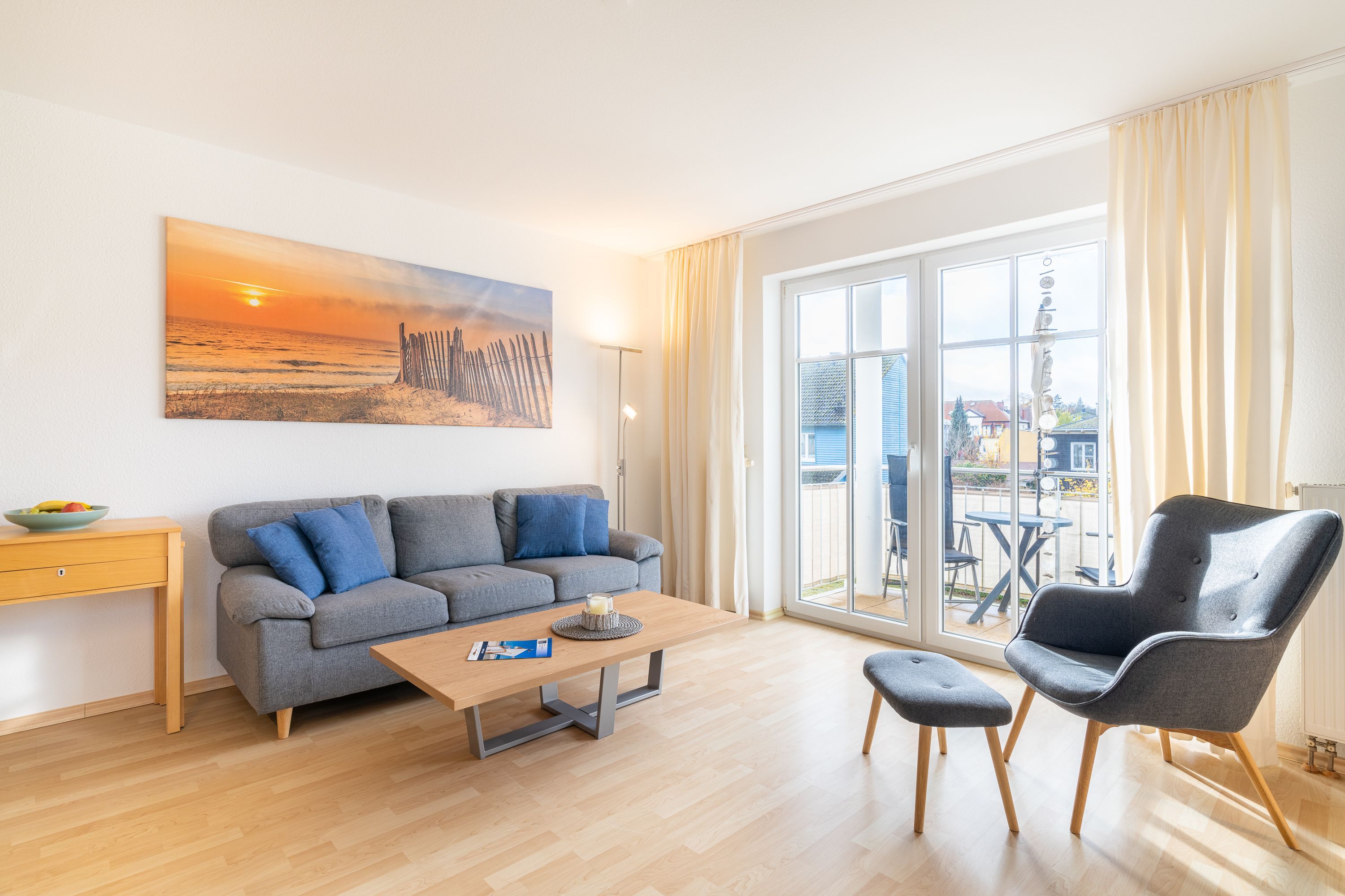 In dem 3-Raum-Appartement im 1. Obergeschoss können bis zu 4 Personen auf 62 Quadratmetern ihre erholsame Urlaubszeit gemeinsam verbringen. Der gemütliche Wohn-, Koch-, und Essbereich ist in warmen Tönen gehalten. Die integrierte Küchenzeile bietet dank Geschirrspüler, Kühlschrank mit Gefrierfach, Backofen, Mikrowelle, Wasserkocher, Toaster, Kaffeemaschine und vielen Extras jeglichen Kochkomfort. Ein bequemes Sofa, ein Sessel, Flat TV sowie ein Esstisch für vier Personen laden zum Entspannen und geselligem Beisammensein ein.