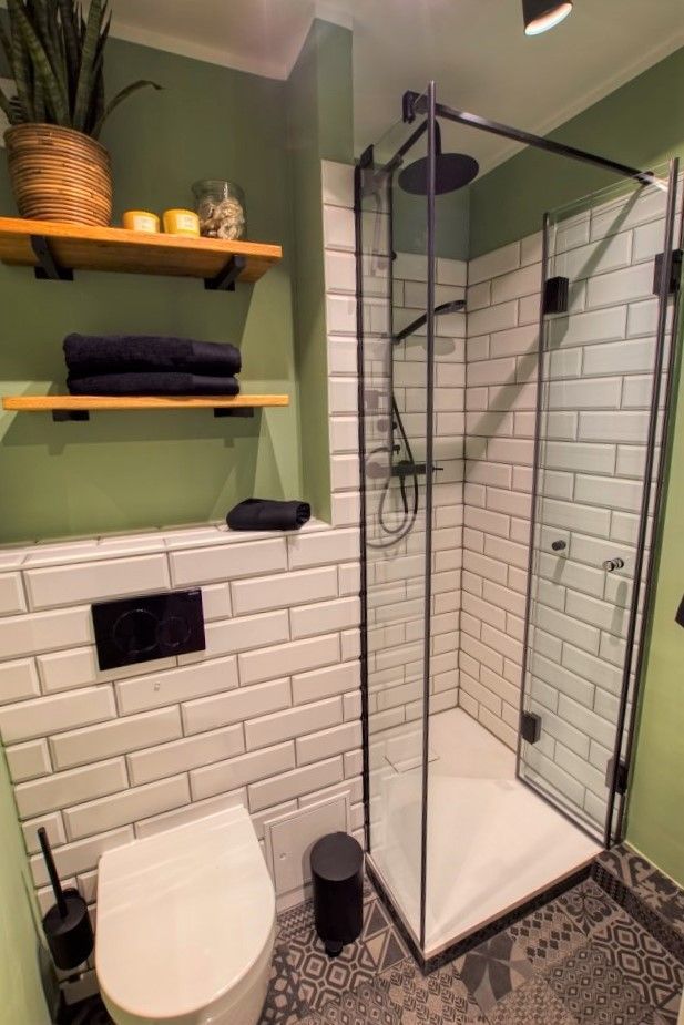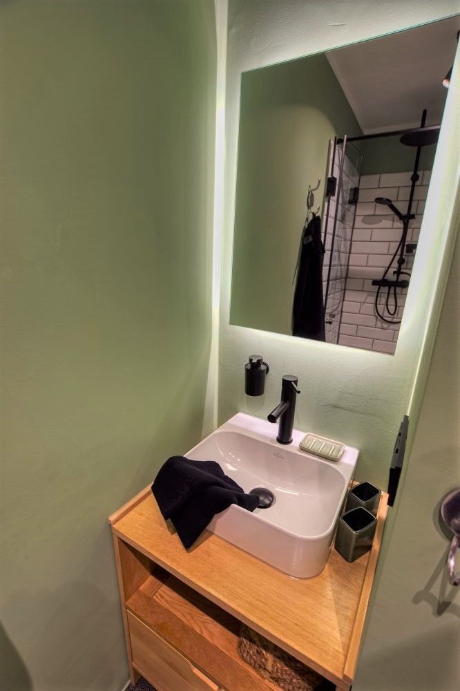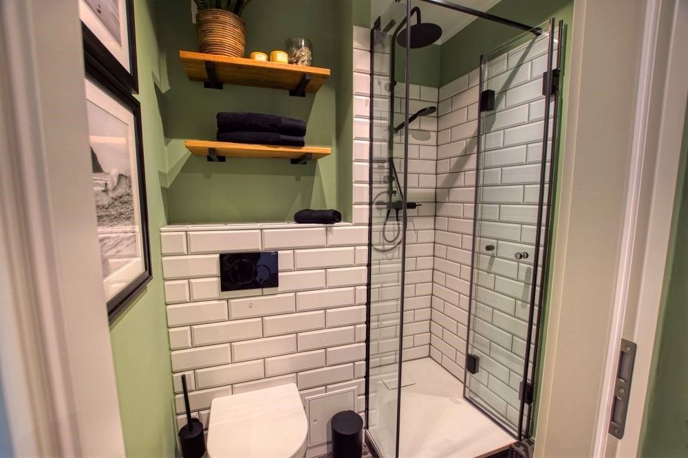 Bad mit Duschkabine, Fußbodenheizung, Waschtisch und Stauraum