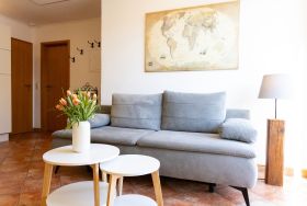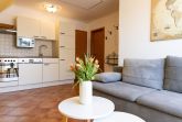 Der kombinierte Wohn- Koch- und Essbereich überzeugt mit Relaxsofa, Flat TV, voll ausgestatteter Küche (Kühlschrank mit Gefrierfach, Ceranfeld, Backofen, Mikrowelle, Geschirrspülmaschine, Kaffeemaschine, Toaster, Wasserkocher und Essplatz. Der angrenzende Balkon ist zur Morgensonne ausgerichtet. Das Schlafzimmer ist mit einem Doppelbett (180 x 200cm / zwei getrennte Matratzen) ausgestattet.