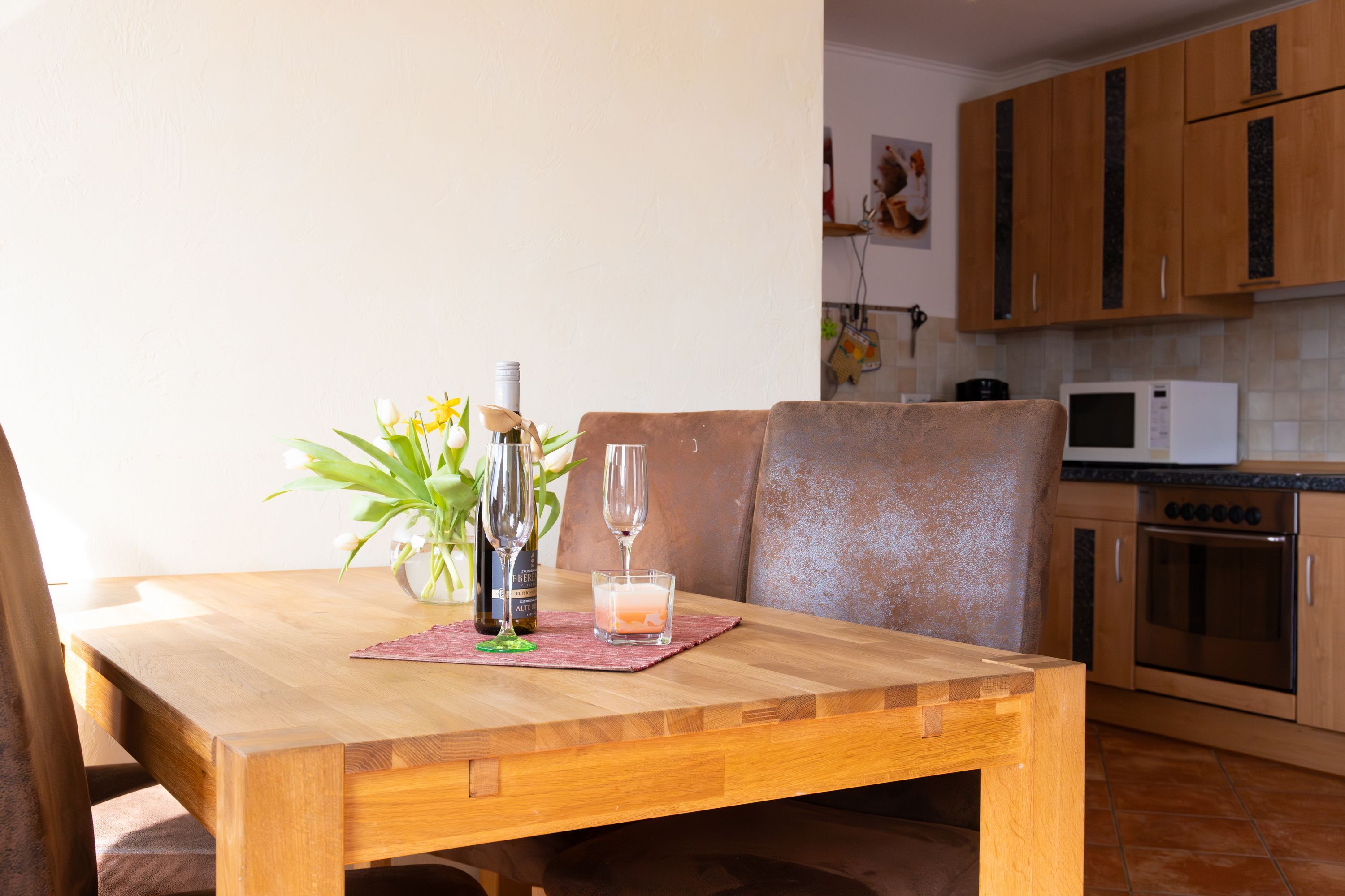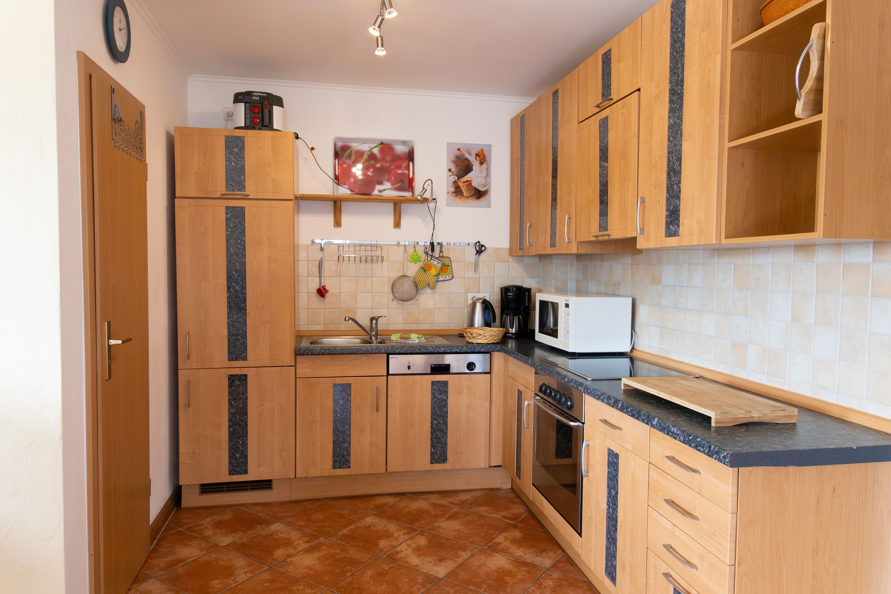 Im unteren Bereich der Wohnung bietet eine vollausgestatte Küchenzeile mit Backofen, Kühlschrank mit Gefrierfach, Geschirrspüler, Mikrowelle, Wasserkocher, Toaster, Kaffeemaschine jeglichen Komfort. Der Essplatz lädt zum Beisammensein zu den Mahlzeiten mit bis zu vier Personen ein.