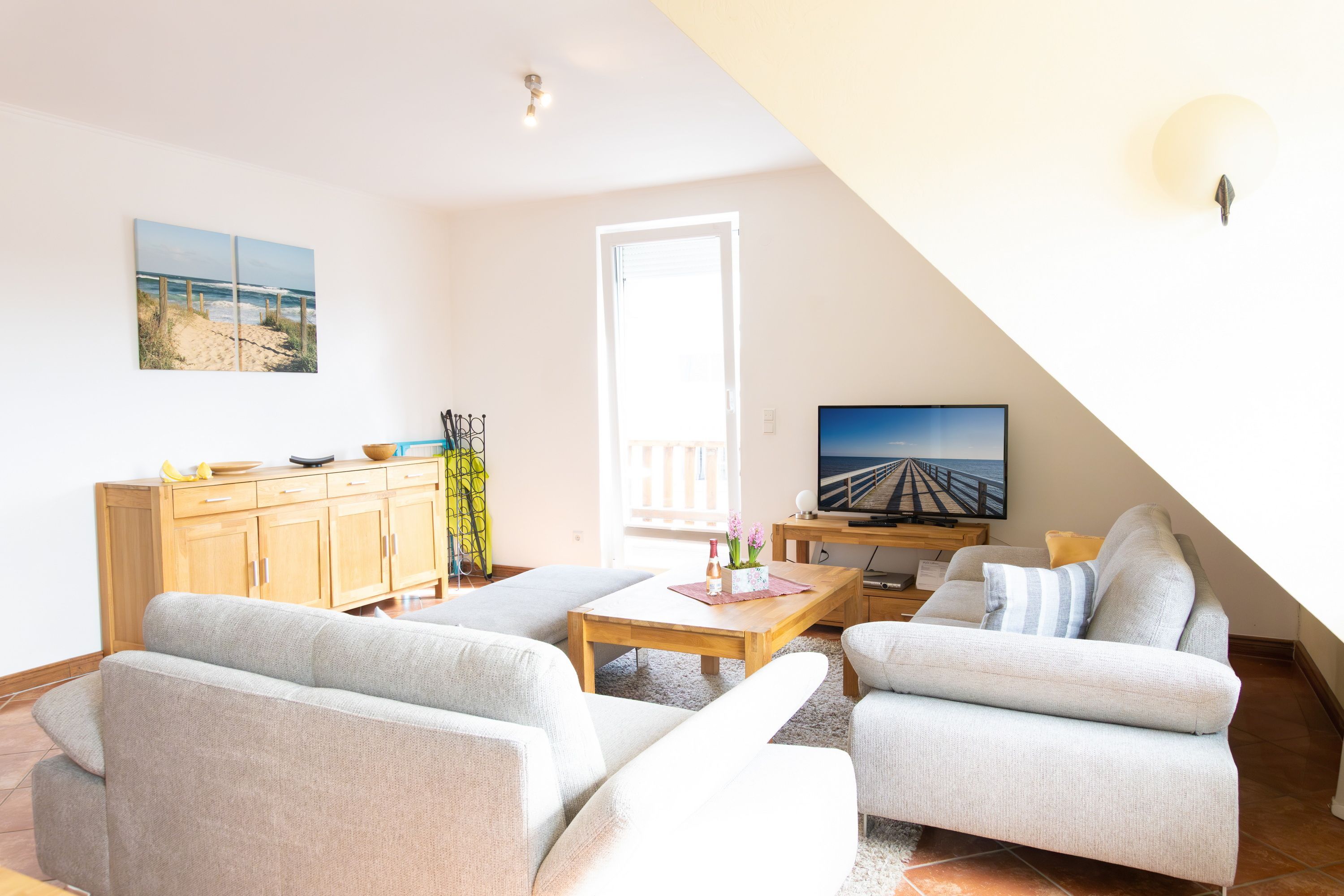 Die modern und freundlich eingerichtete Maisonettewohnung des Ferienhauses Jenny bietet auf insgesamt 90m² und zwei Etagen (1. Obergeschoss und Dachgeschoss) Raum für einen erholsamen Urlaub mit bis zu vier Personen.