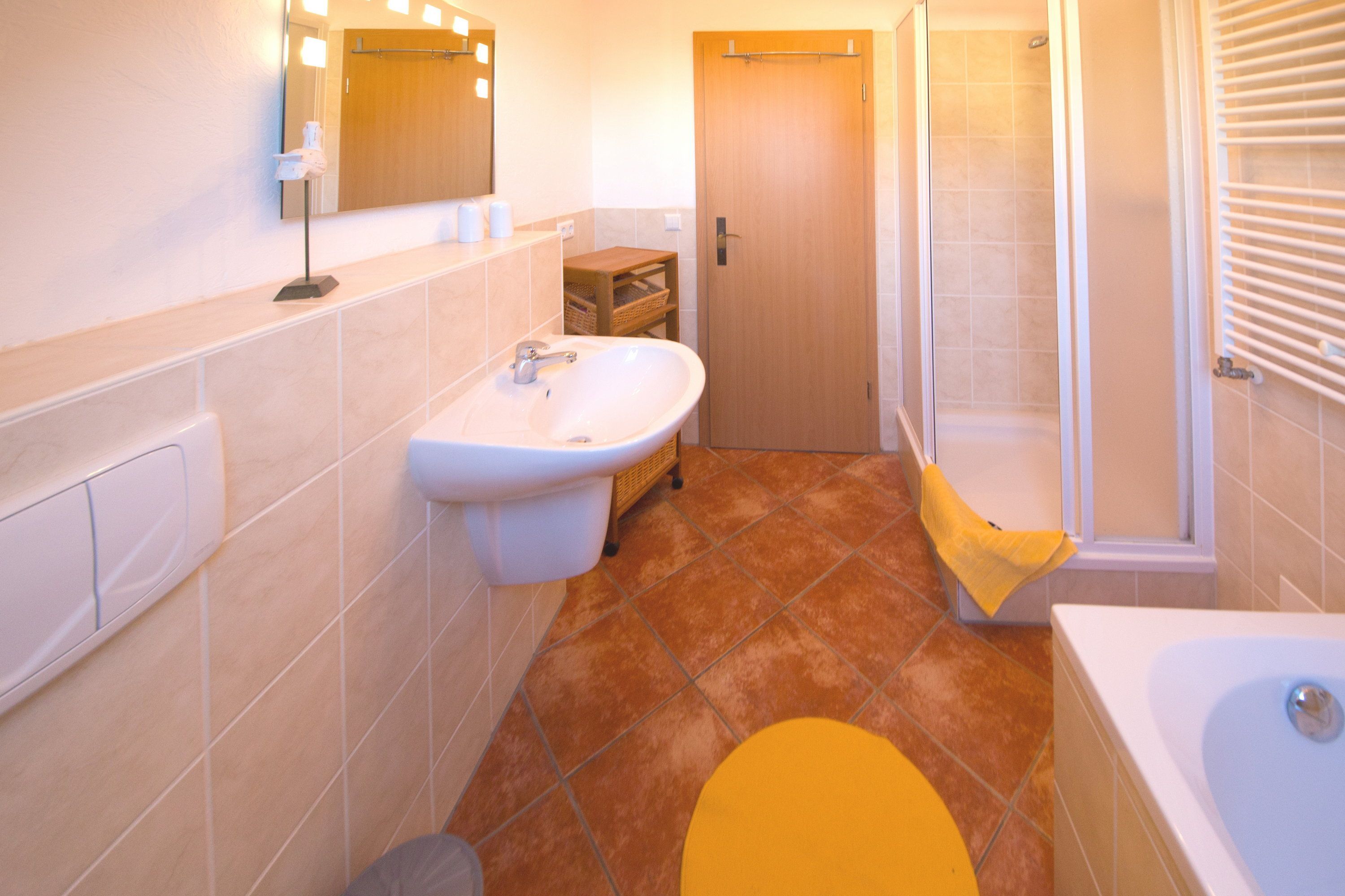 Das Badezimmer, welches sich ebenfalls auf dieser Ebene befindet, ist mit Dusche, WC und einem Haartrockner ausgestattet.