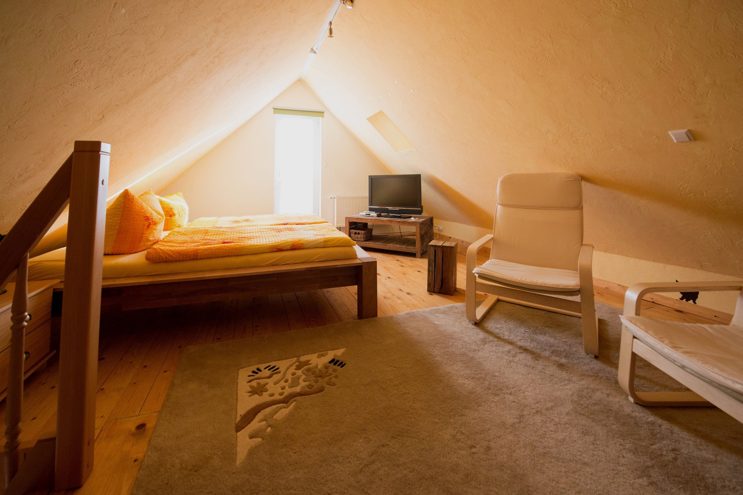Der Wohnbereich mit gemütlicher Sitzecke, Flachbildfernseher und DVD-Player laden zum Entspannen und Ausklingen des Urlaubstages ein. Der angrenzende Südostbalkon rundet den Urlaubskomfort dieses Appartements ab. Zur Nachtruhe oder auch für ein Mittagsschläfchen zwischendurch lassen Sie sich einfach in das bequeme Doppelbett (180 x 200cm / zwei getrennte Matratzen) im Schlafzimmer fallen. Über die freie Treppe erreichen Sie das zweite Schlafzimmer mit Doppelbett (180 x 200cm / zwei getrennte Matratzen) und FlatTV, welches sich im Dachgeschoss des Hauses befindet (zwischen den beiden Schlafräumen befindet sich keine Tür).